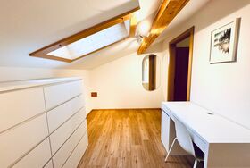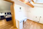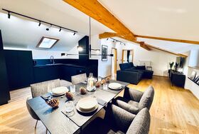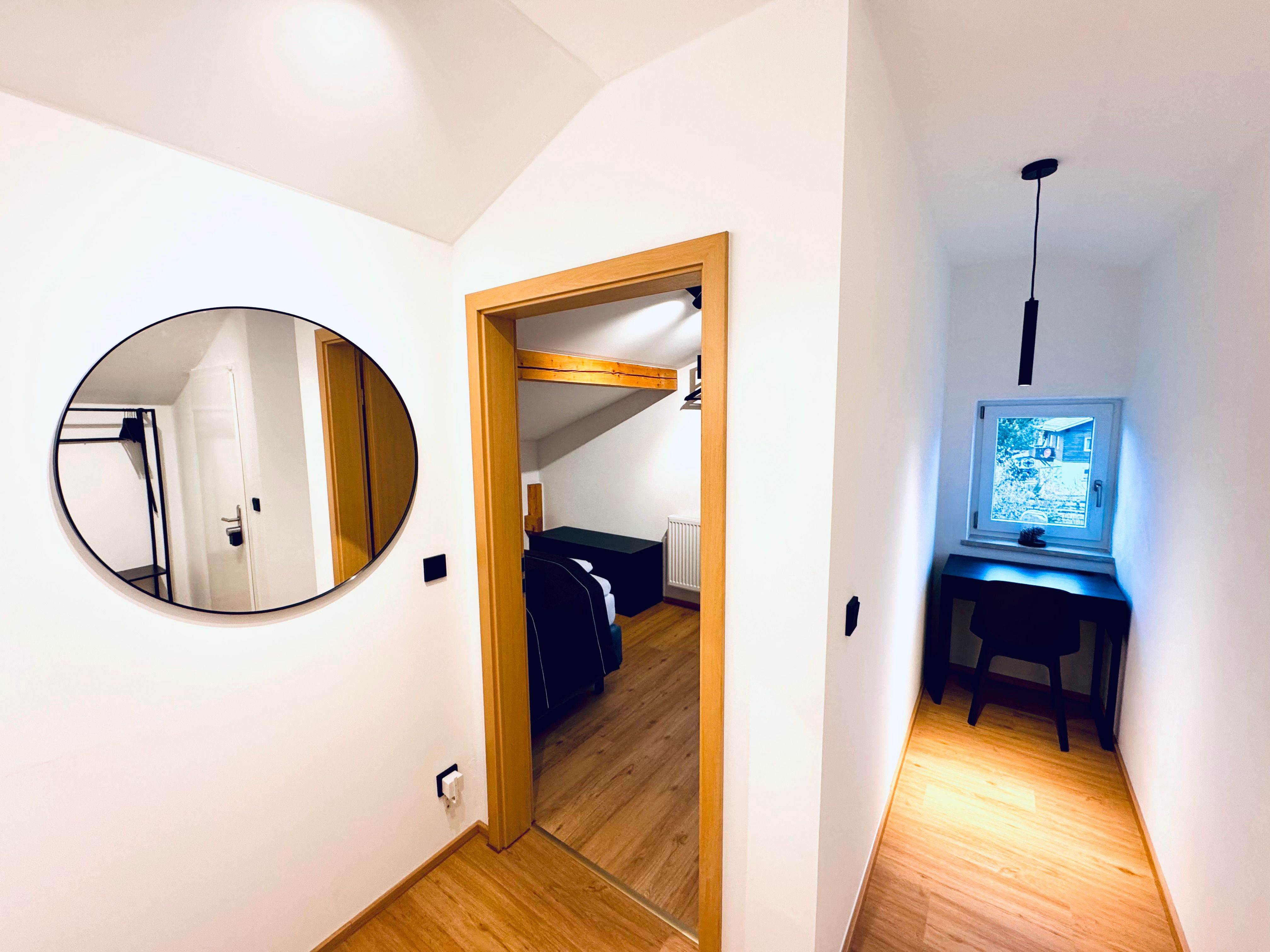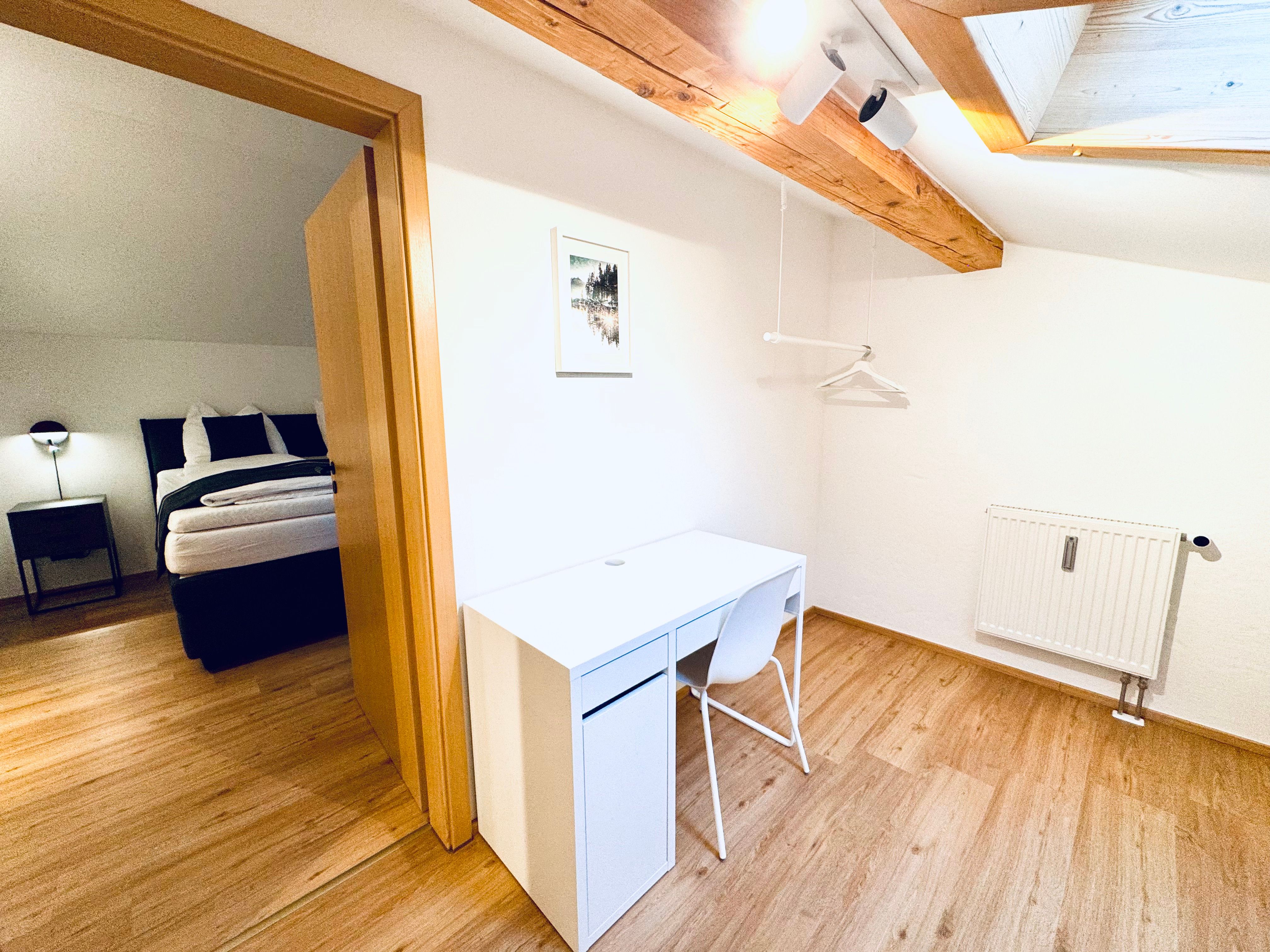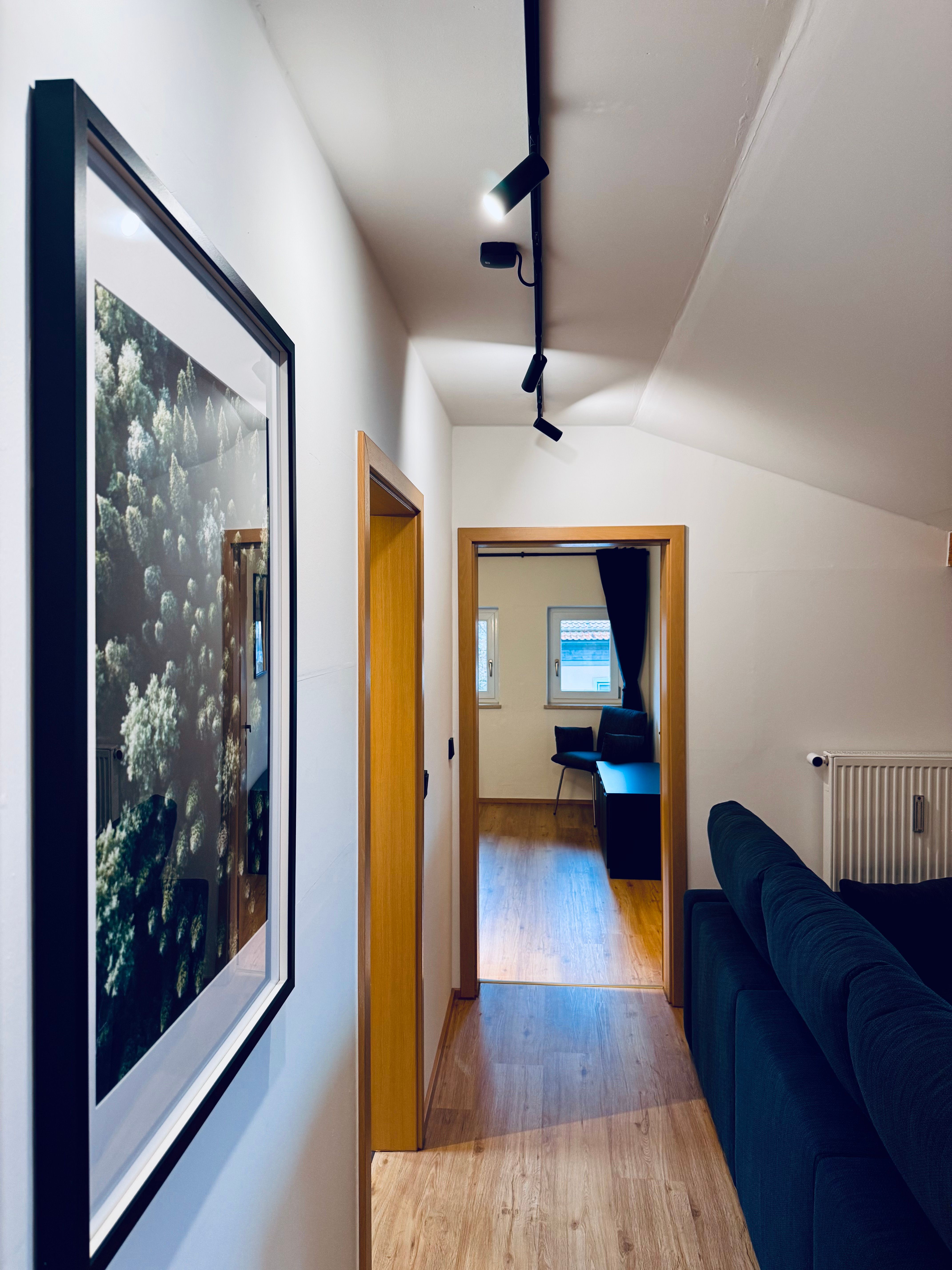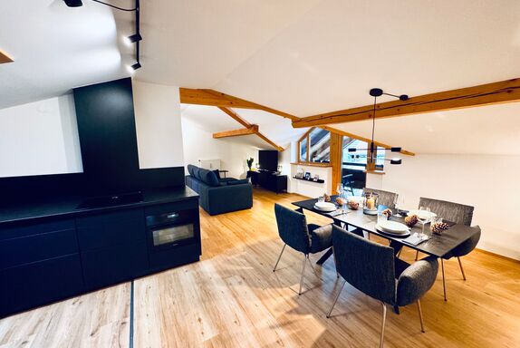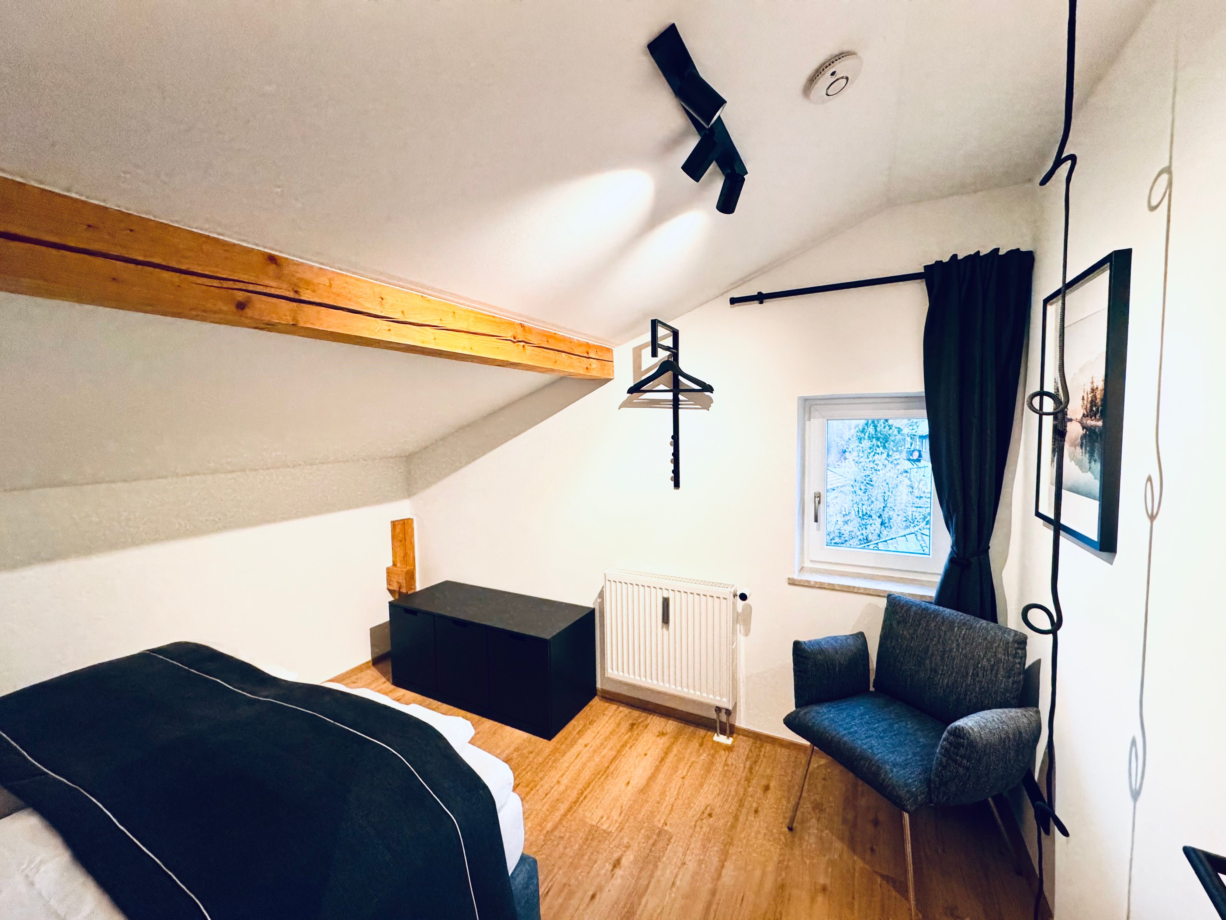 Die Tannensuite befindet sich im 2. Stock (oberstes Stockwerk) und ist über eine Treppe erreichbar. Das Appartement ist ca. 80 qm groß und zeichnet sich durch eine hochwertige Ausstattung mit modernem Design aus. Der Eingangsbereich verfügt über eine Garderobe und vielen Ablagemöglichkeiten. In beiden Schlafzimmer stehen luxuriöse RUF-Boxspring-Betten (King Size). Angrenzend an das Master-Schlafzimmer befindet sich eine Ankleide mit genügend Stauraum für Kleidung, Koffer etc. Für Home Office stehen zwei Tische mit Stühlen zur Verfügung. Herzstück ist das große Wohnzimmer mit offenem Küchen- und Essbereich sowie einer gemütlichen TV-Ecke. Von hier gelangt man auch auf den Balkon mit Bergblick. Abgerundet wird die Tannensuite durch ein geräumiges Bad mit Dusche und Badewanne. Alle Zimmer sind mit Fenstern ausgestattet.