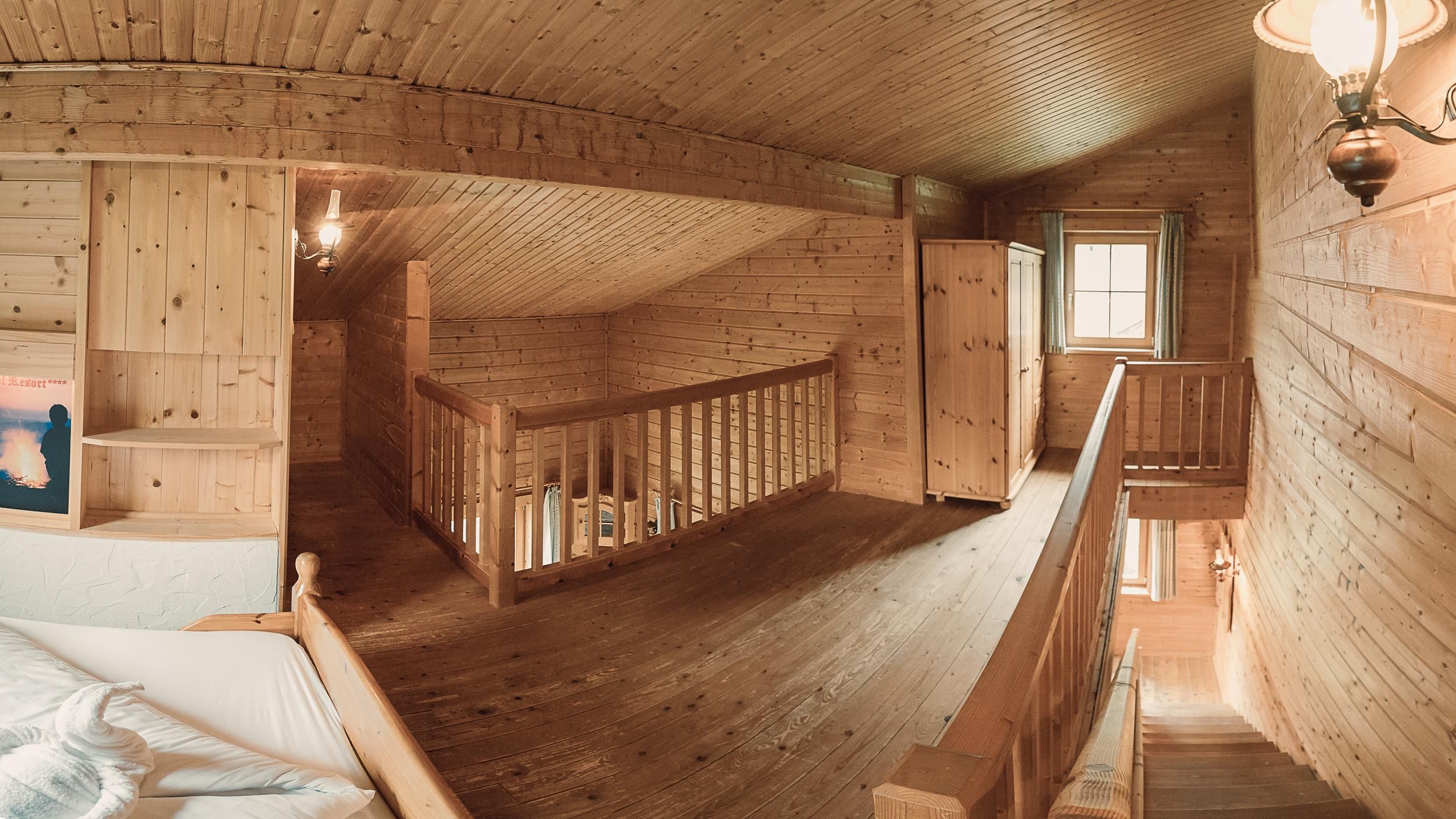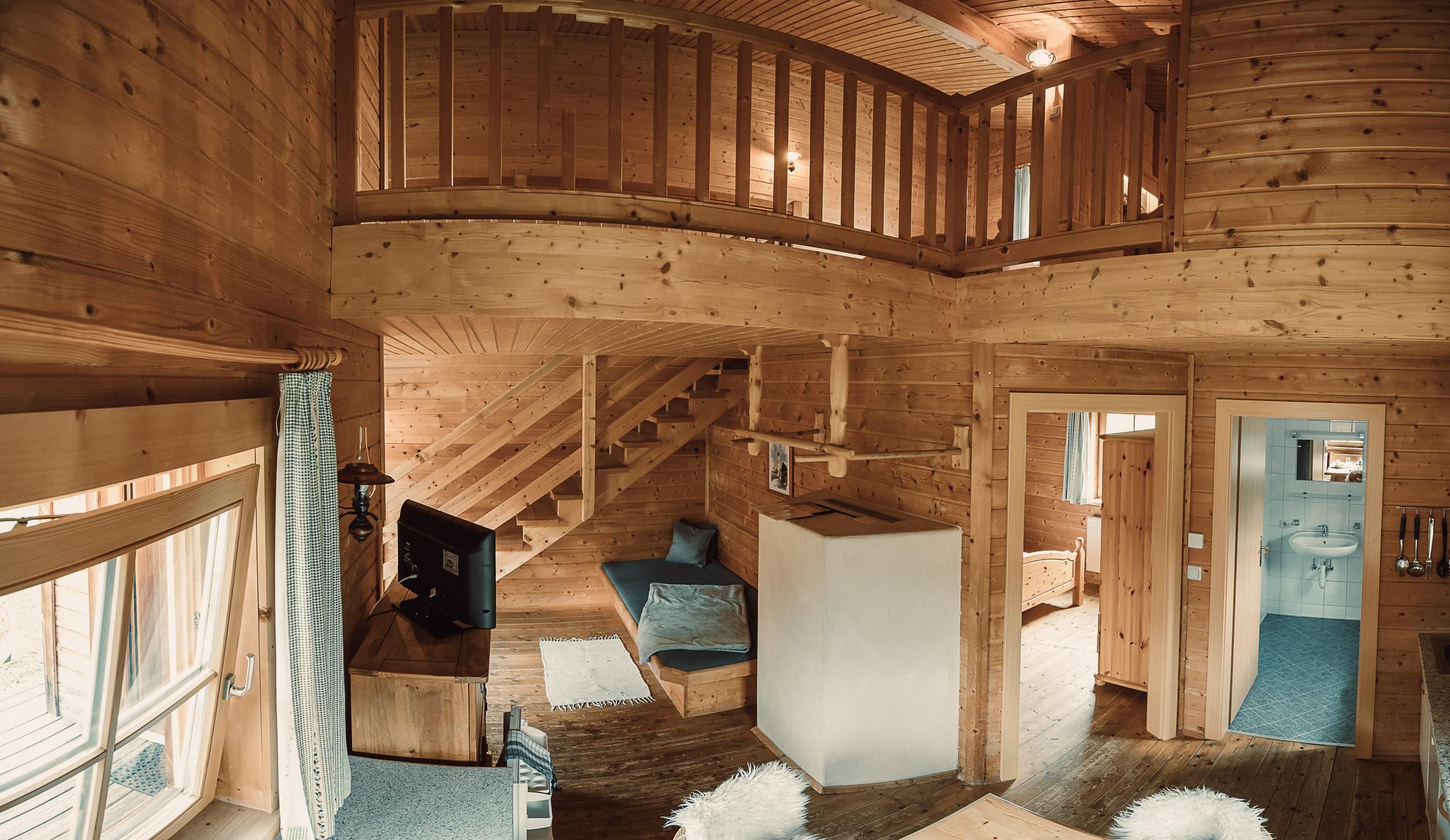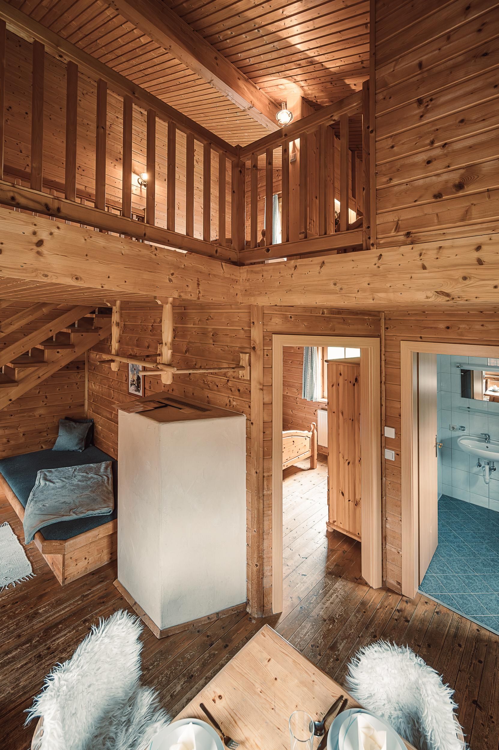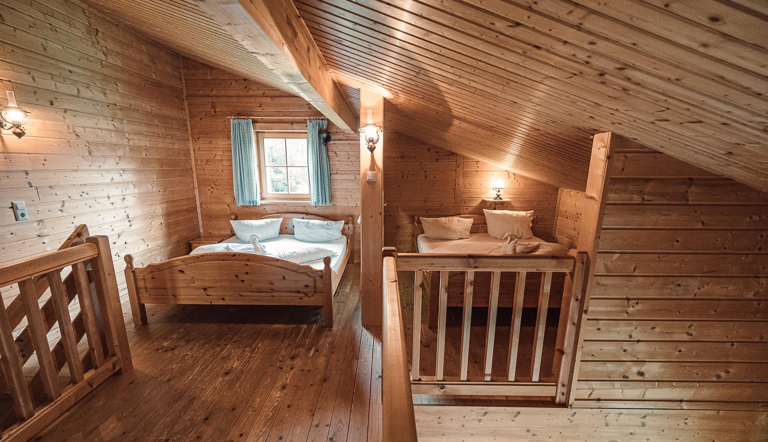 Almhütte Family & Friends – perfekt für größere Familien oder befreundete Paare: Im Erdgeschoss befindet sich ein separat abgetrenntes Schlafzimmer; darüber liegt ein offenes Galerieschlafzimmer, das nur durch eine Trennwand abgegrenzt ist (keine einzelnen Räume). Bei Bedarf auf Anfrage können zwei nebeneinander liegende Hütten zusammen gebucht werden – komfortabel für Gruppen von bis zu 12 Personen.