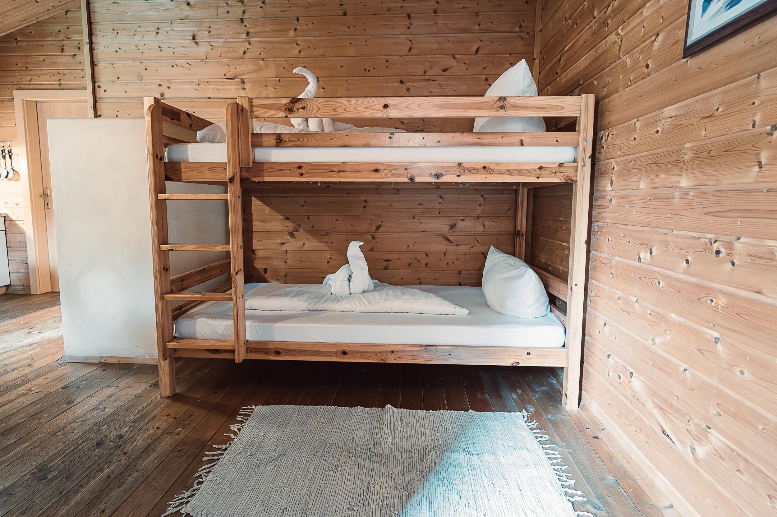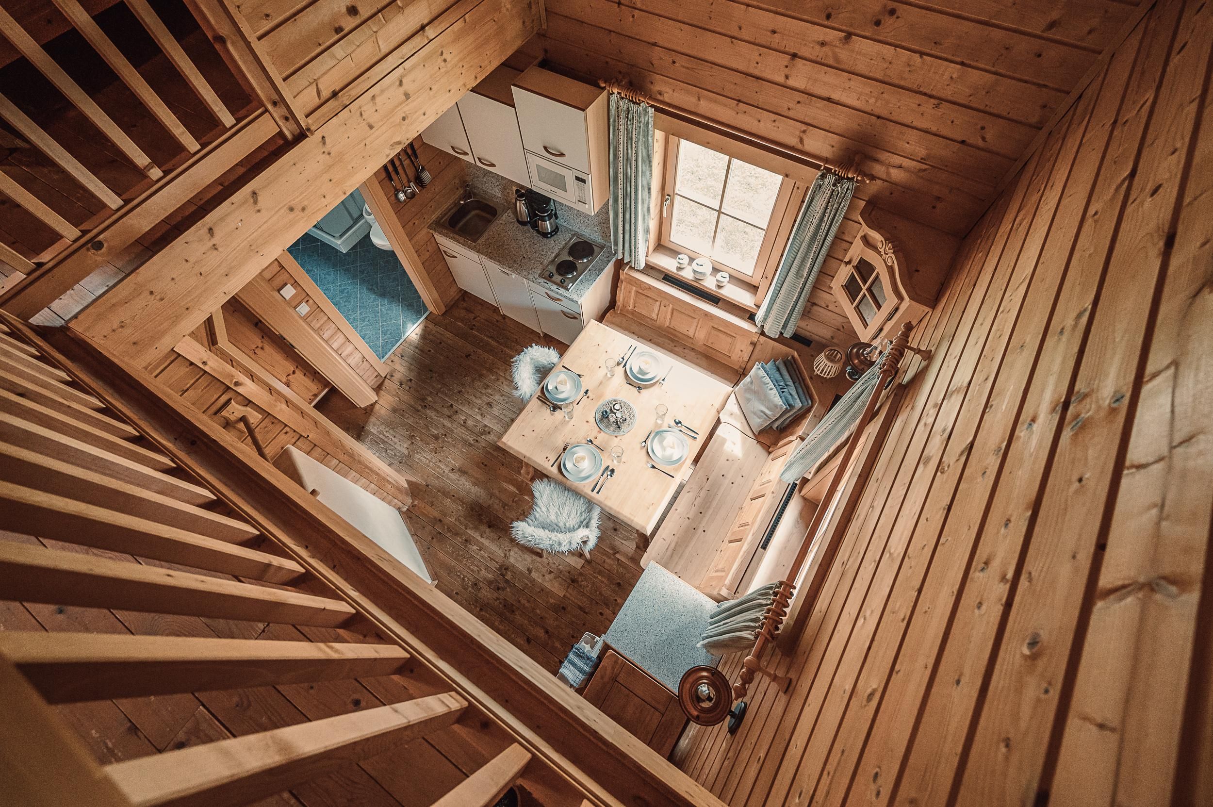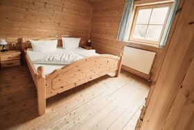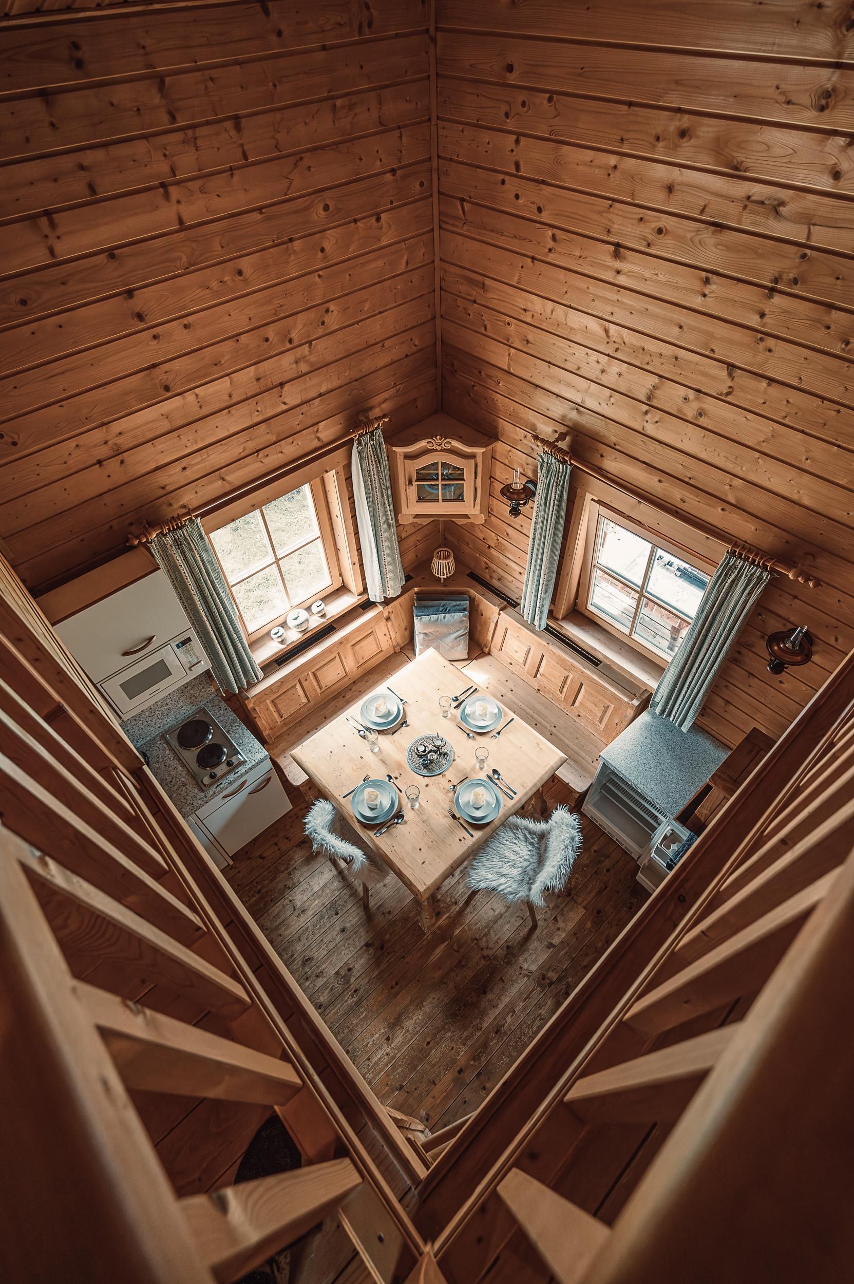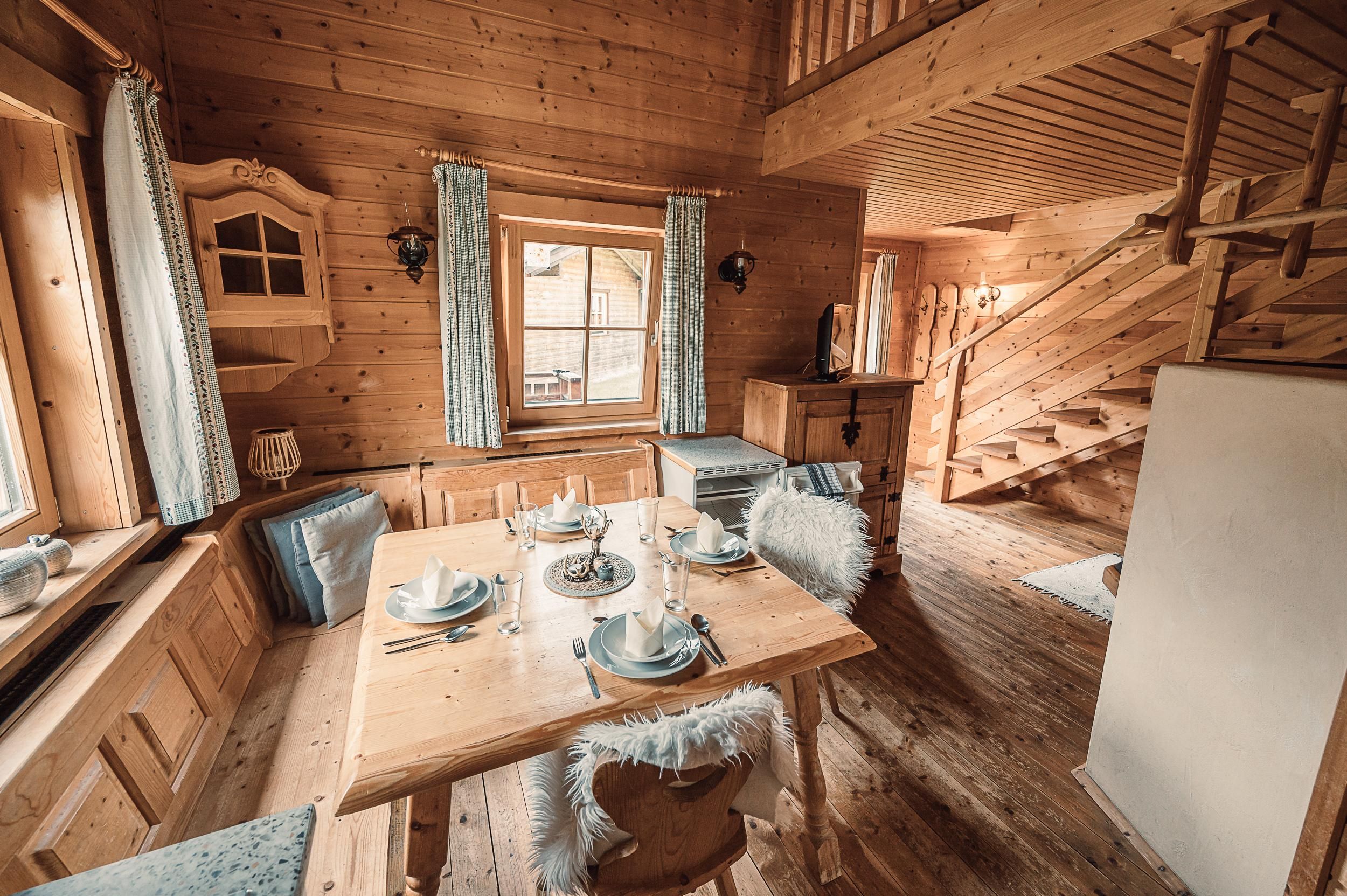 Almhütte Family & Friends – perfekt für größere Familien oder befreundete Paare: Im Erdgeschoss befindet sich ein separat abgetrenntes Schlafzimmer; darüber liegt ein offenes Galerieschlafzimmer, das nur durch eine Trennwand abgegrenzt ist (keine einzelnen Räume). Bei Bedarf auf Anfrage können zwei nebeneinander liegende Hütten zusammen gebucht werden – komfortabel für Gruppen von bis zu 12 Personen.