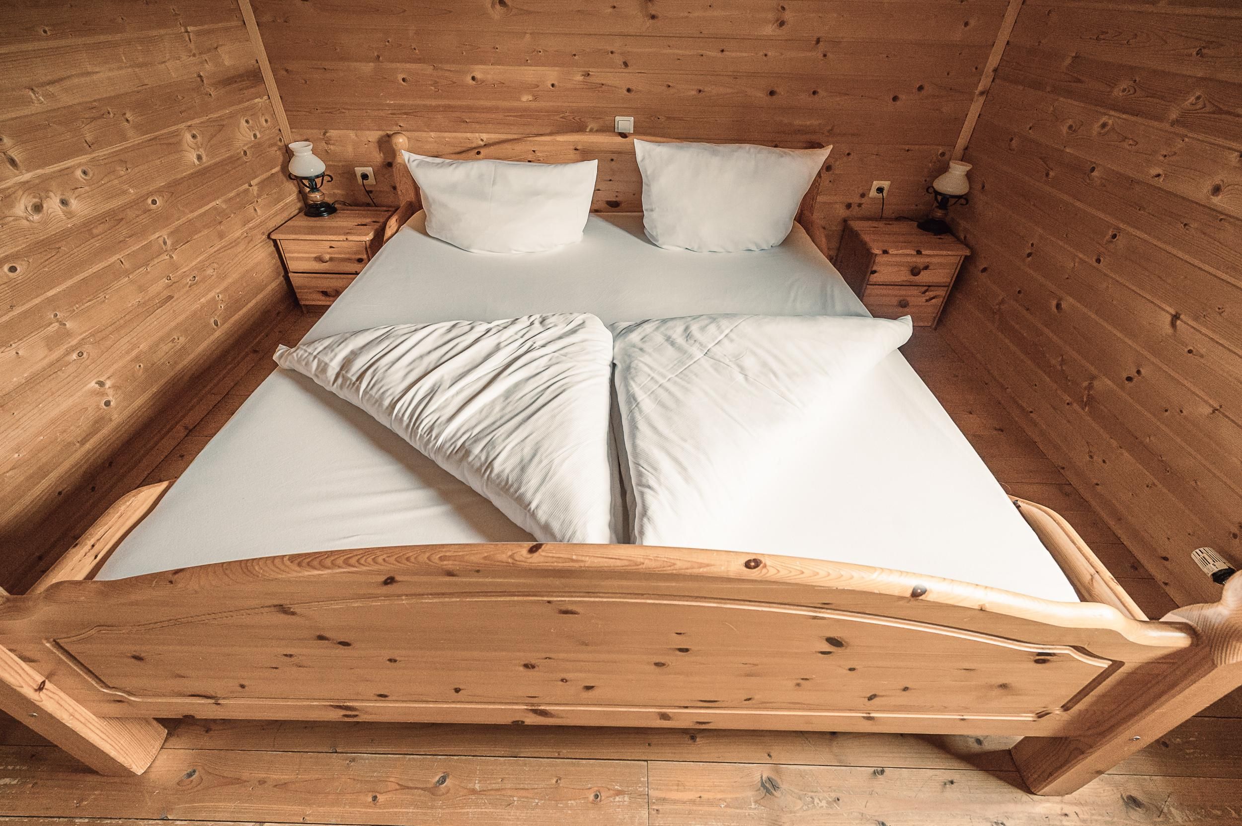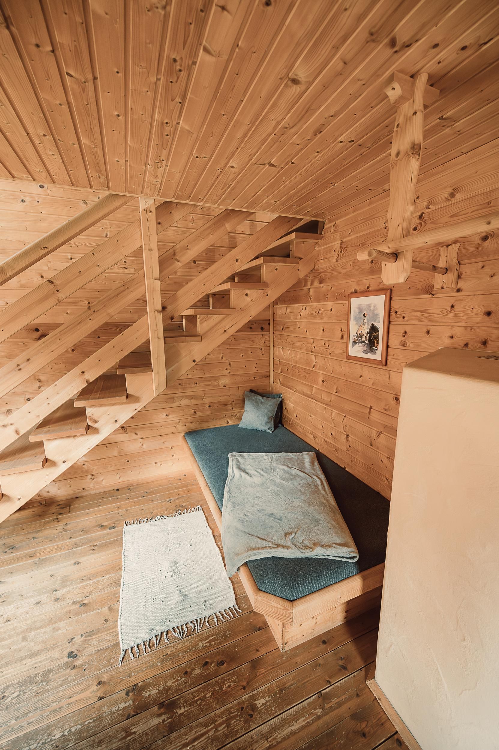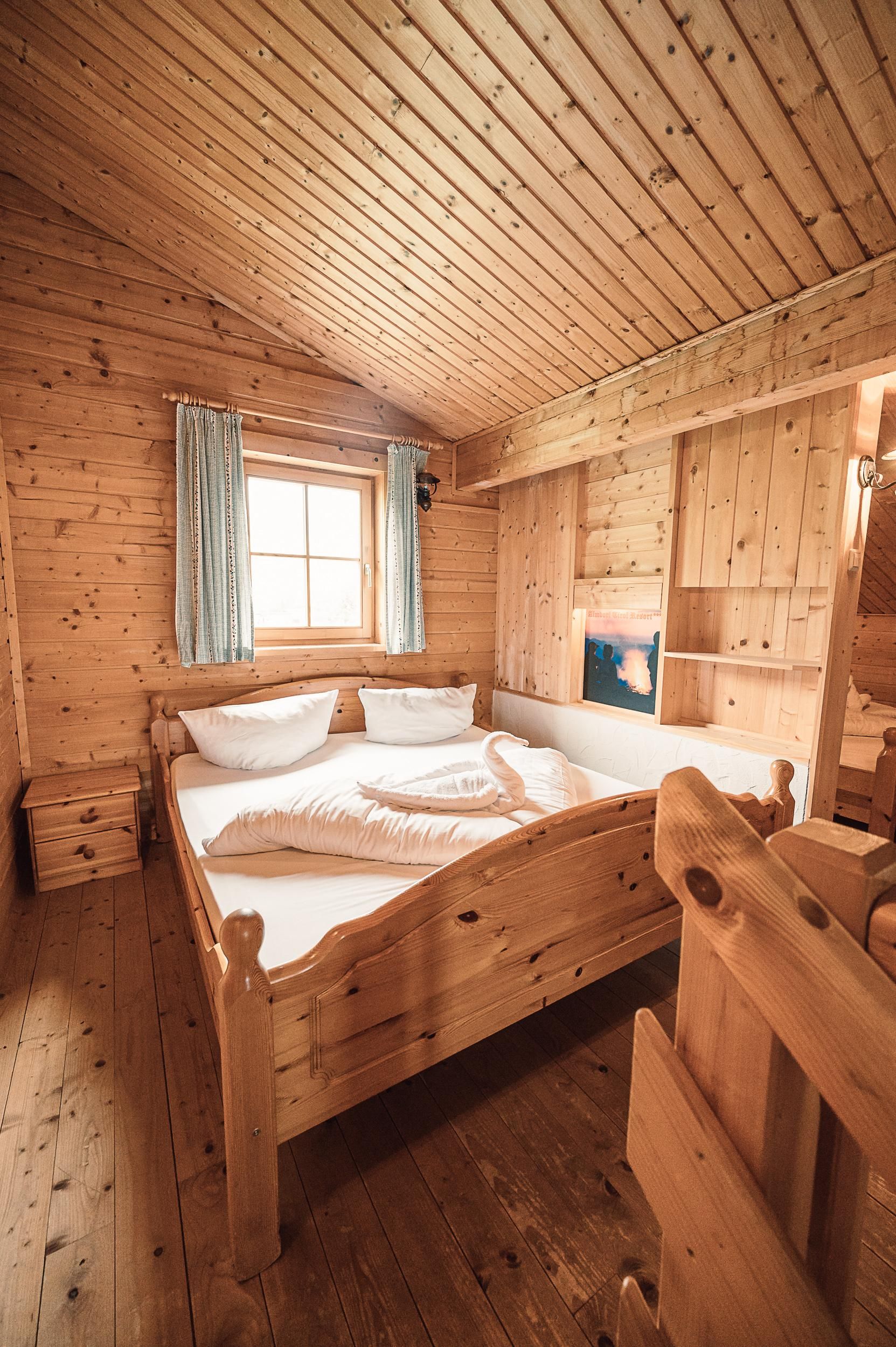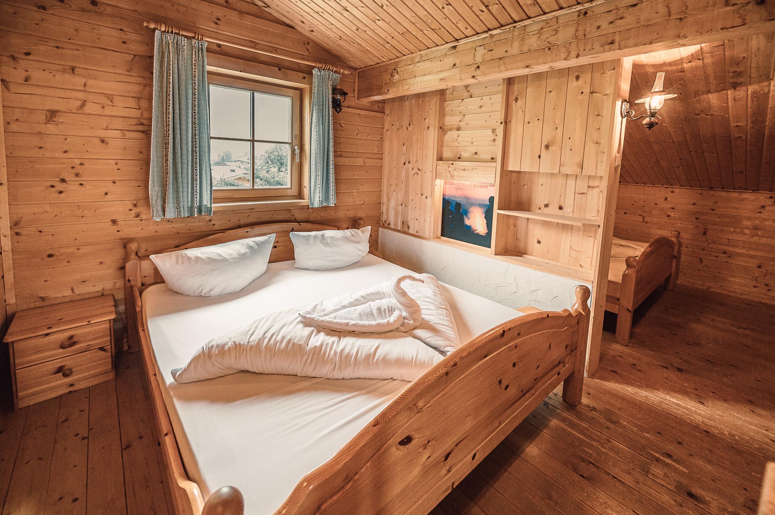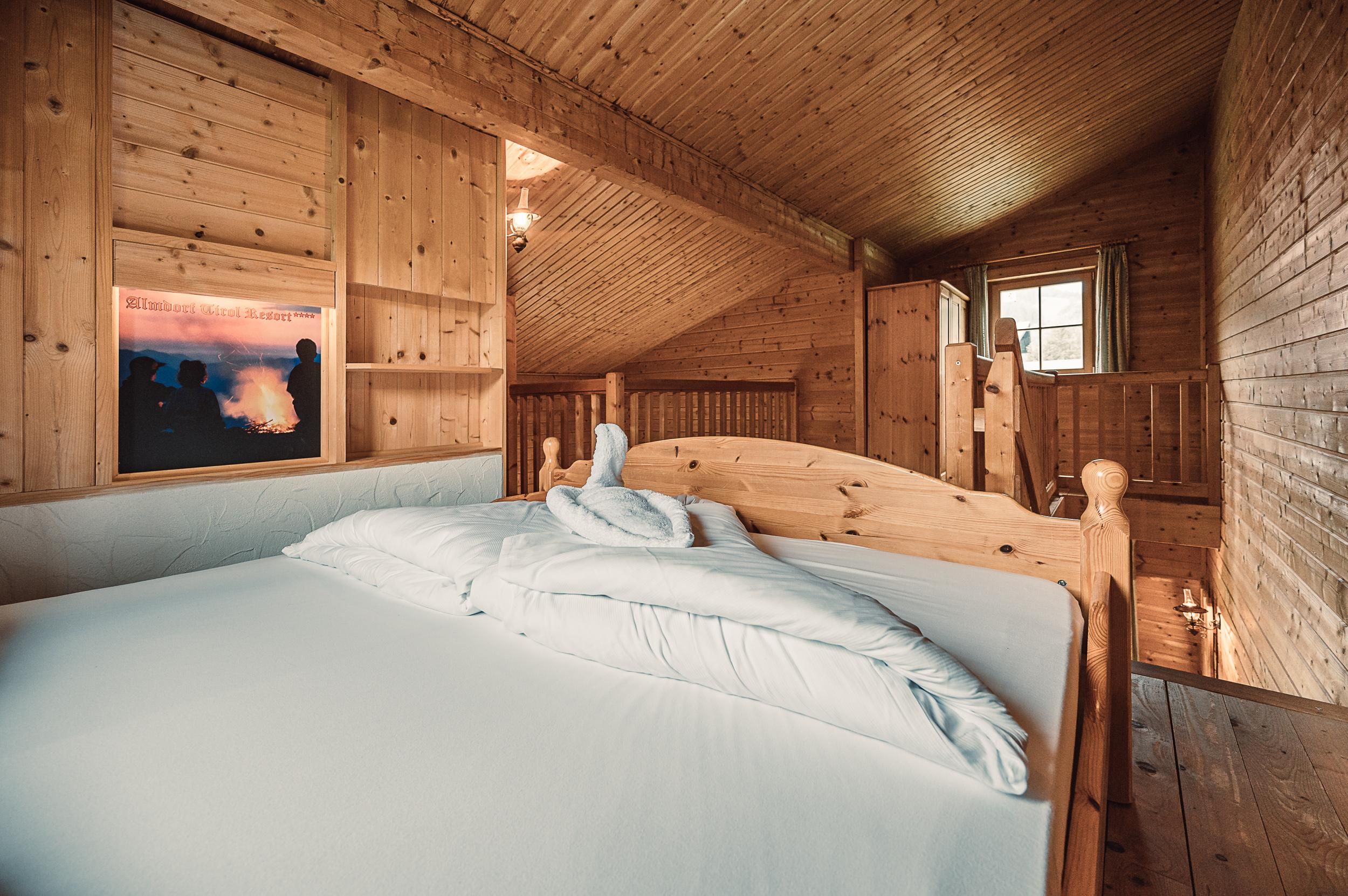 Almhütte Family & Friends – perfekt für größere Familien oder befreundete Paare: Im Erdgeschoss befindet sich ein separat abgetrenntes Schlafzimmer; darüber liegt ein offenes Galerieschlafzimmer, das nur durch eine Trennwand abgegrenzt ist (keine einzelnen Räume). Bei Bedarf auf Anfrage können zwei nebeneinander liegende Hütten zusammen gebucht werden – komfortabel für Gruppen von bis zu 12 Personen.