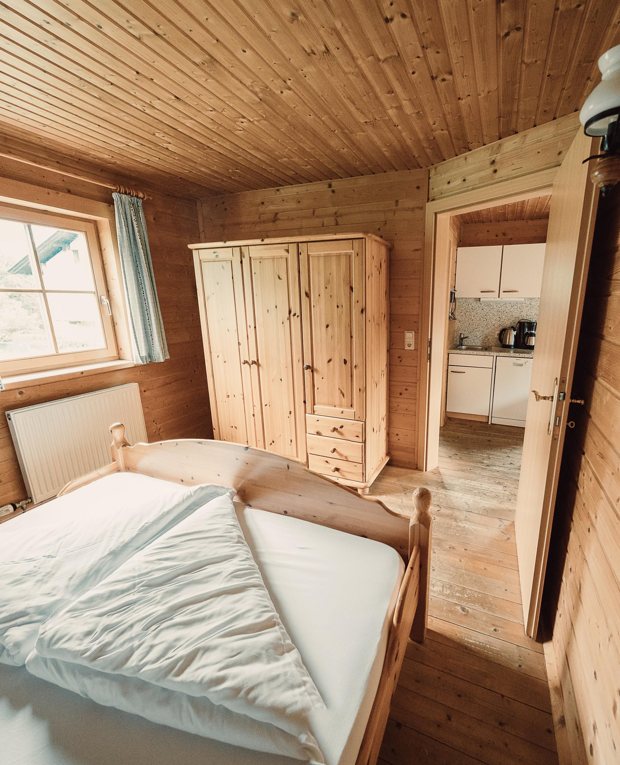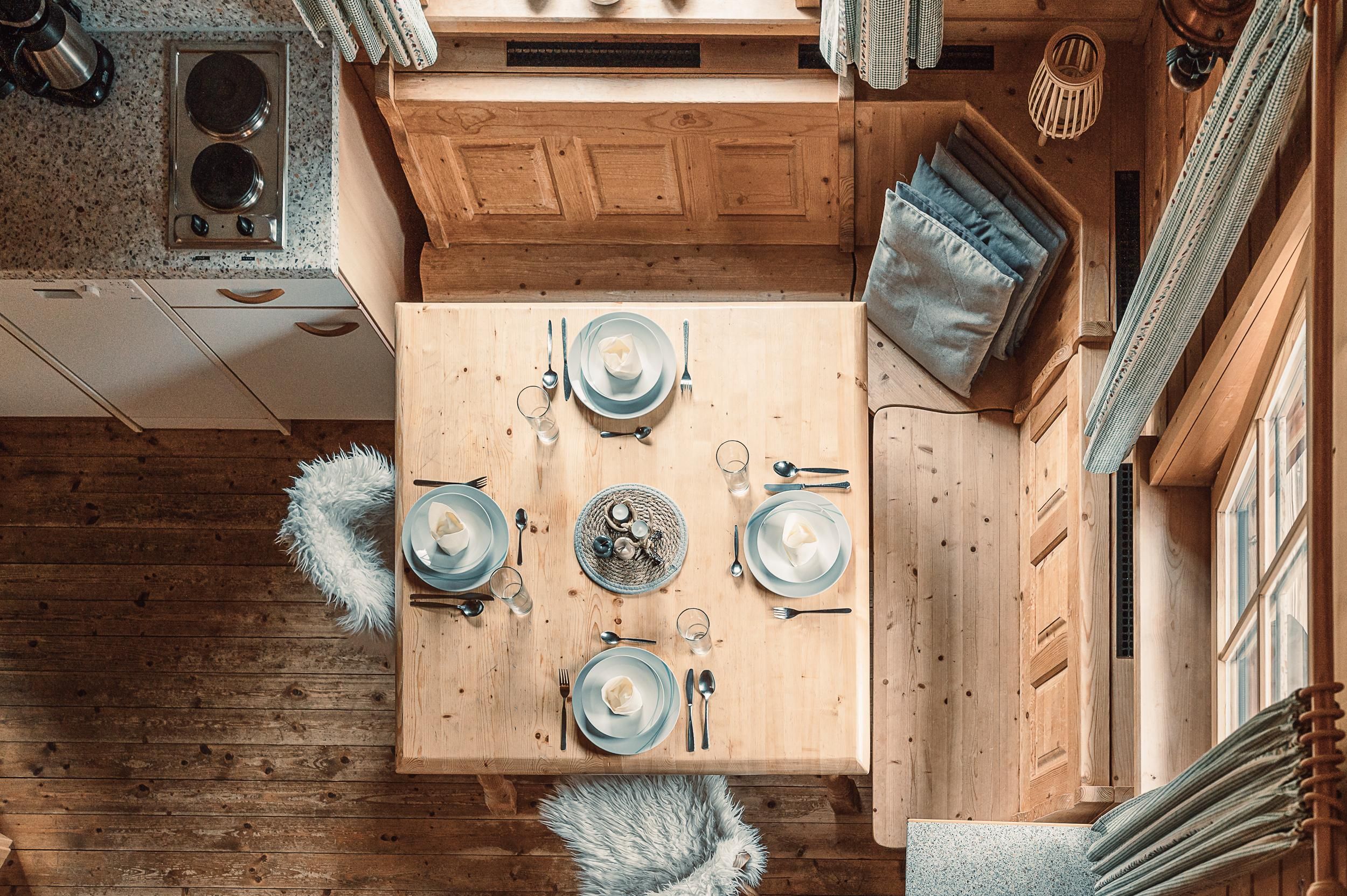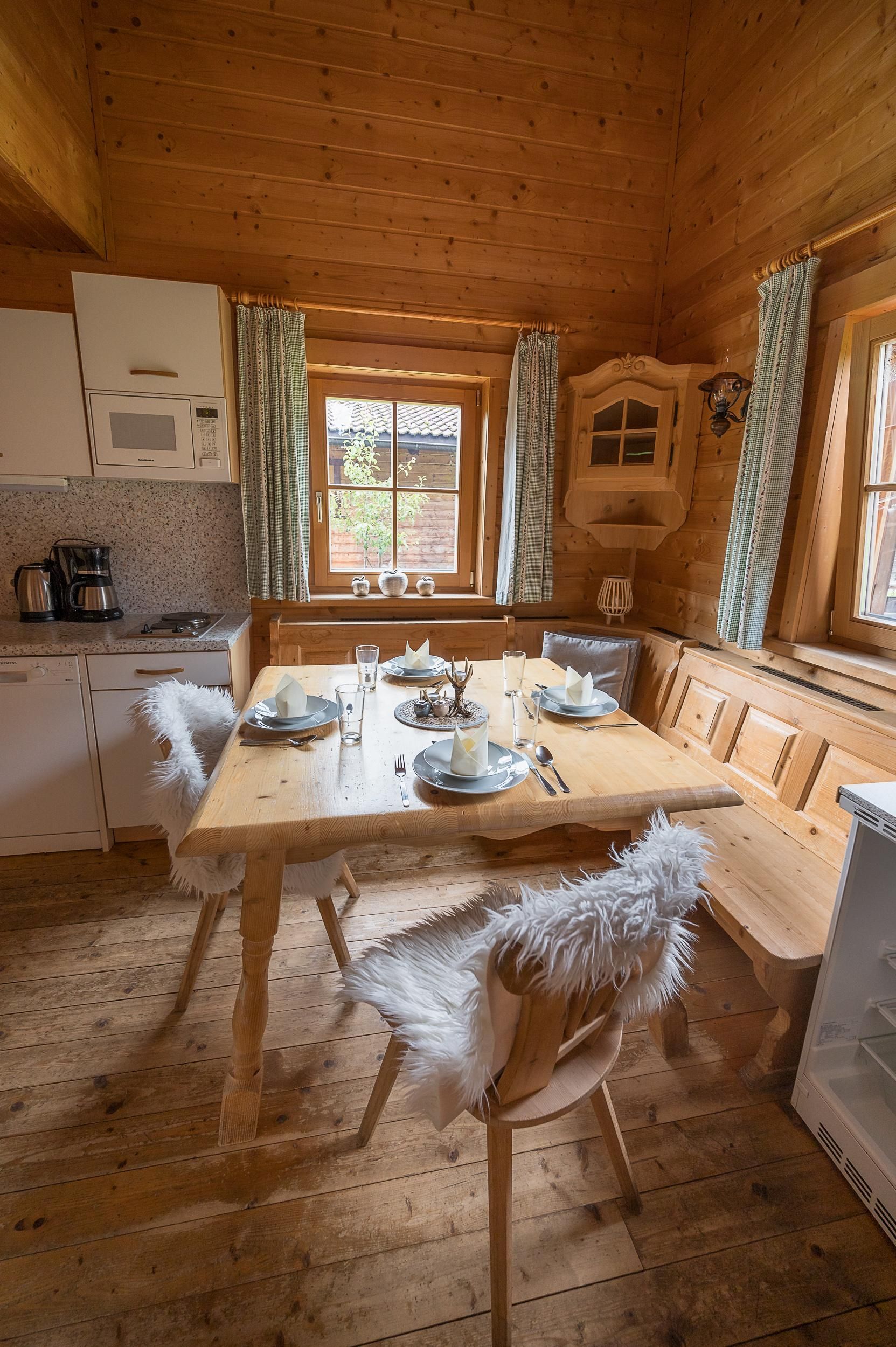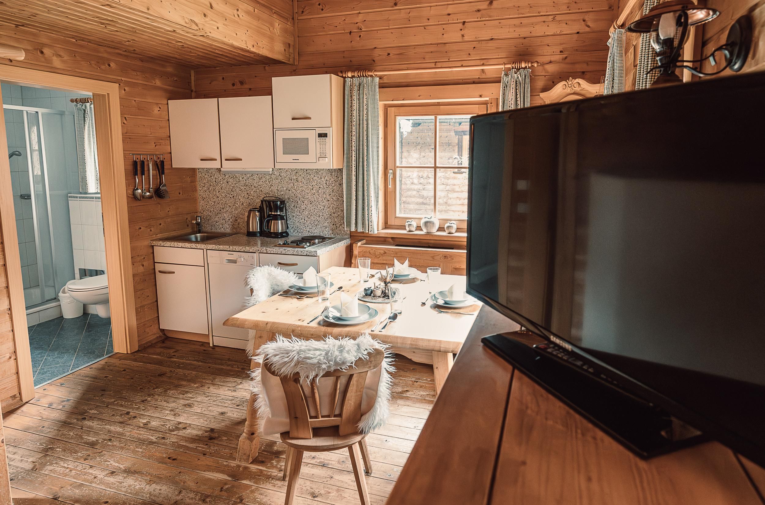 Almhütte Family & Friends – perfekt für größere Familien oder befreundete Paare: Im Erdgeschoss befindet sich ein separat abgetrenntes Schlafzimmer; darüber liegt ein offenes Galerieschlafzimmer, das nur durch eine Trennwand abgegrenzt ist (keine einzelnen Räume). Bei Bedarf auf Anfrage können zwei nebeneinander liegende Hütten zusammen gebucht werden – komfortabel für Gruppen von bis zu 12 Personen.