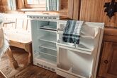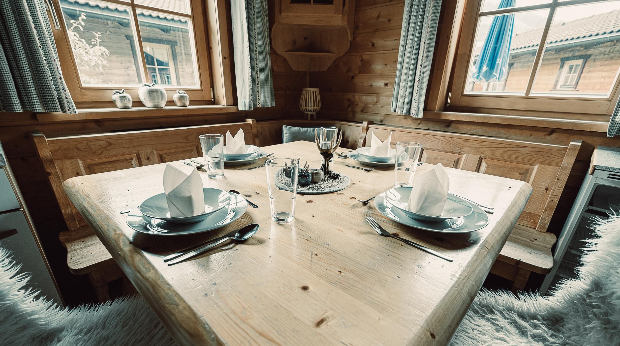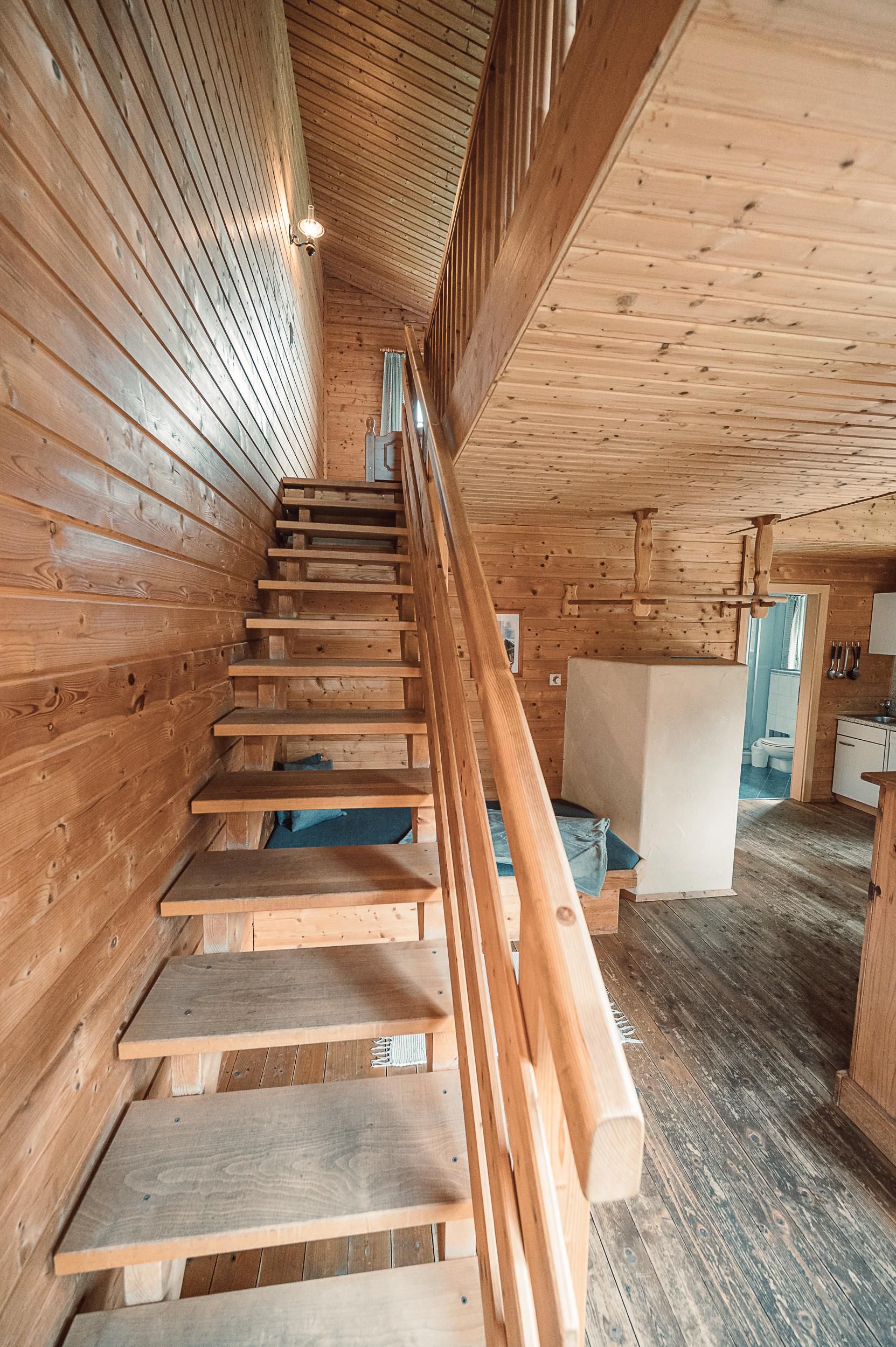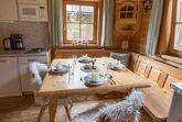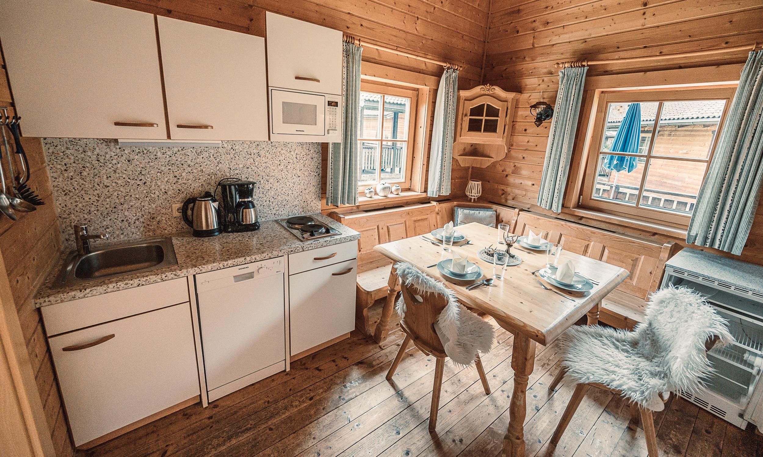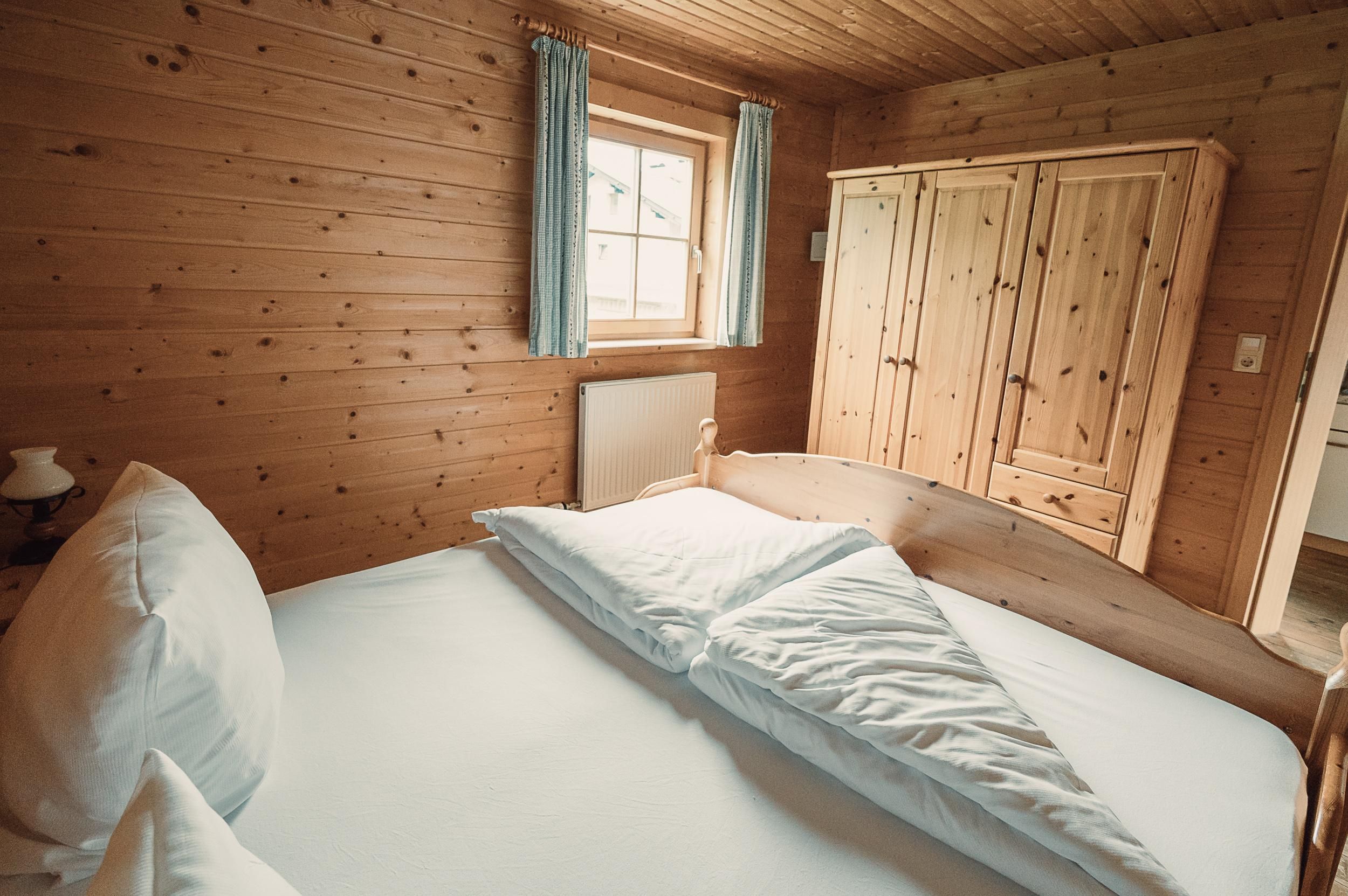 Almhütte Family & Friends – perfekt für größere Familien oder befreundete Paare: Im Erdgeschoss befindet sich ein separat abgetrenntes Schlafzimmer; darüber liegt ein offenes Galerieschlafzimmer, das nur durch eine Trennwand abgegrenzt ist (keine einzelnen Räume). Bei Bedarf auf Anfrage können zwei nebeneinander liegende Hütten zusammen gebucht werden – komfortabel für Gruppen von bis zu 12 Personen.