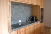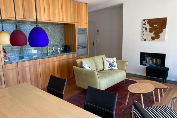 Offene Küche mit Glaskeramik-Induktionsherd, Heissluft-Backofen mit Mikrowelle, Steamer, Geschirrwaschmaschine, Dampfabzug, Kühlschrank, Tiefkühler, Nespresso-Kaffemaschine, Kochgeschirr, Geschirr, Besteck, Trinkgläser, Raclette-Öfeli, Fondue-Caquelon und Rechaud, WIFI