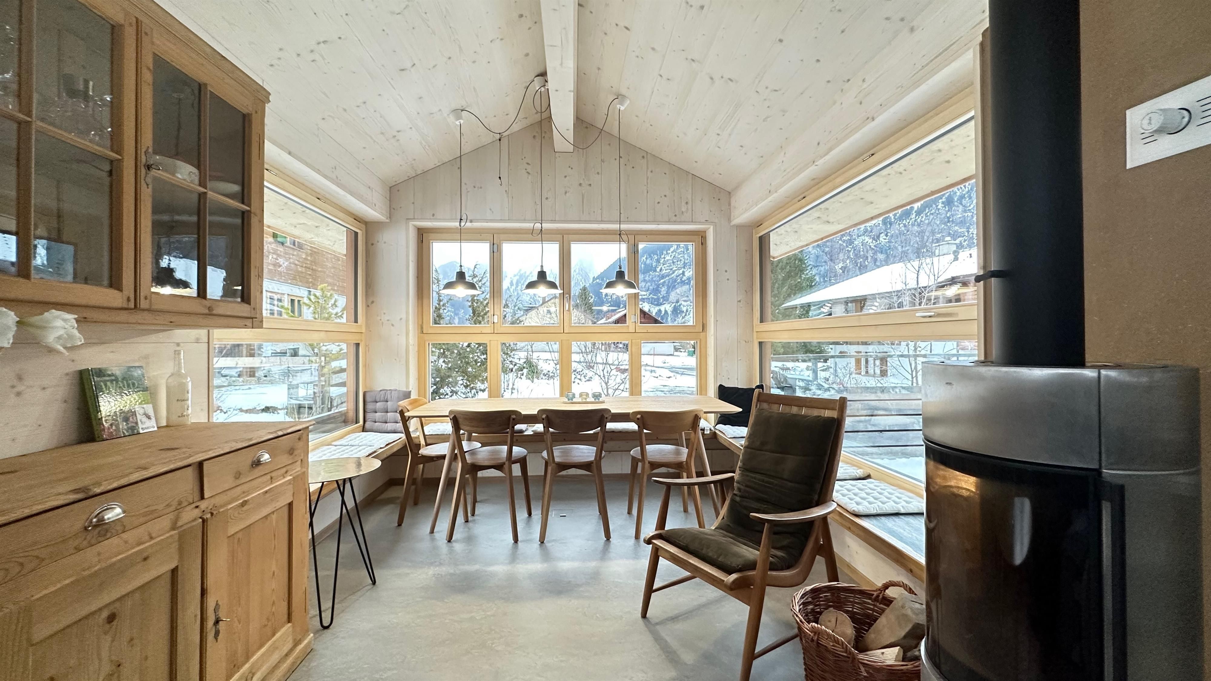 Terrasse mit schöner Bergsicht und Esstisch mit 6 Sitzplätzen, Liegestühle; 4 Gratis-Parkplätze, Schlitten und Velos zur freien Benutzung. Zudem haben wir neben dem Haus einen Wellnessbereich mit einer Sauna und einem Hot Pot angeordnet. Die Sauna steht jederzeit für CHF 10.- zur Verfügung (Vorheizzeit ca. 45 Min). Der Hot Pot kann nur gegen Voranmeldung benutzt werden.