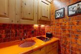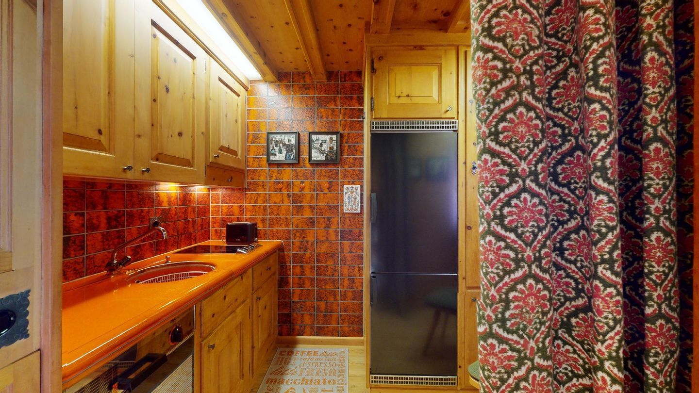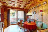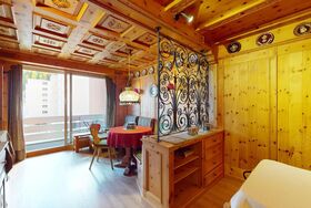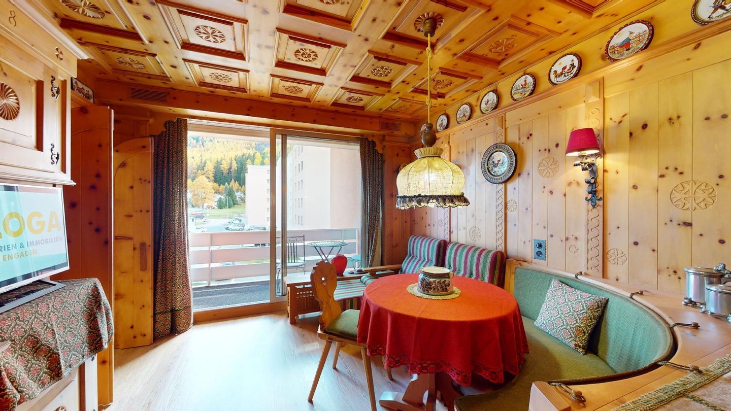 Hochwertig mit Holz verkleidete 1-Zimmerwohnung im 2. Stock für 2 Personen. Eingang mit Garderobe. Wohnzimmer mit Wohn- und Essbereich mit Ausgang auf den Balkon. 2 Schrankbetten. Geschlossene Küche. Separates Badezimmer mit Dusche/WC/Lavabo. Radio, TV und Internet. Aussenparkplatz. Haustiere sind nicht erlaubt. Nichtraucherwohnung.