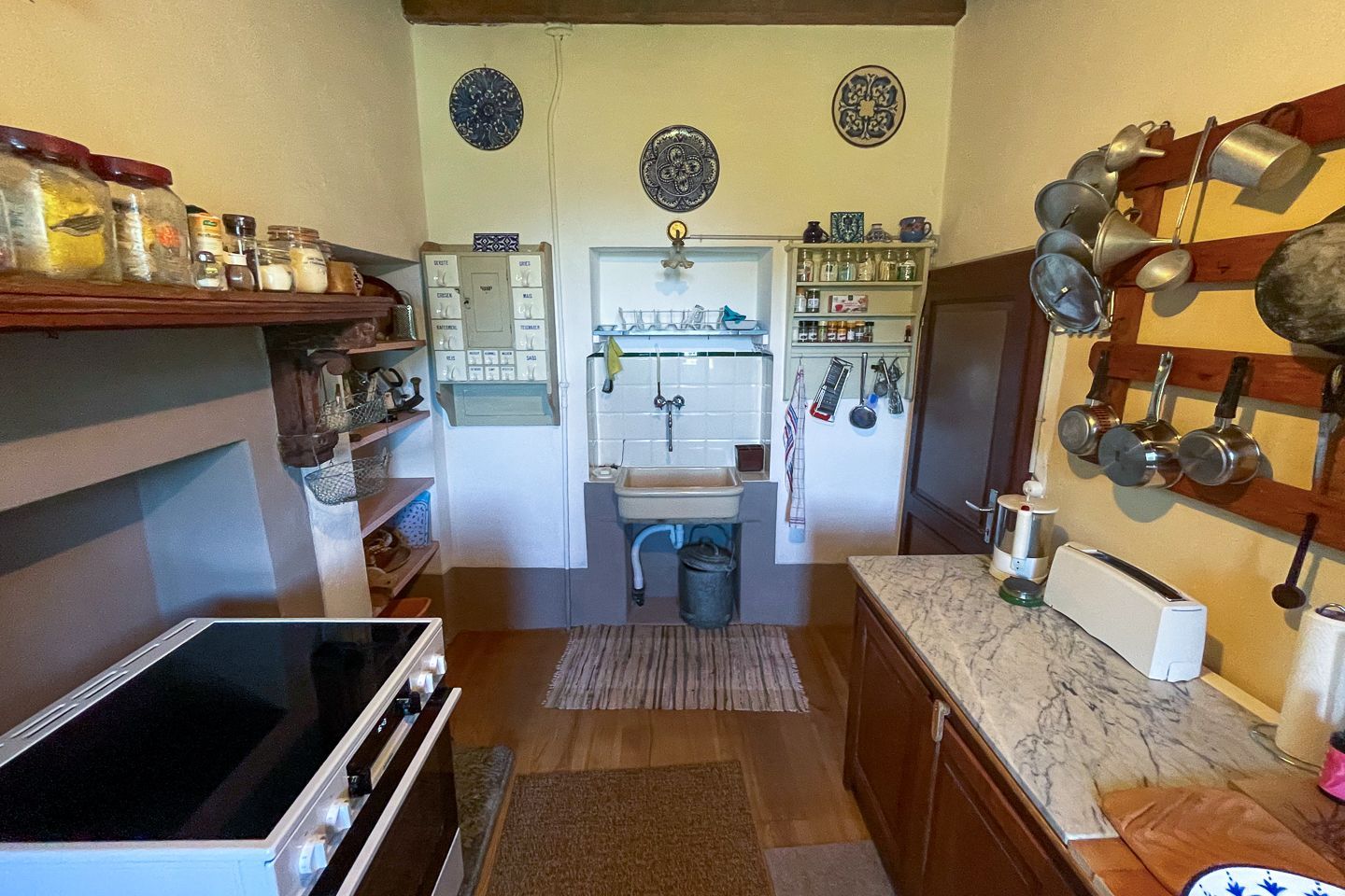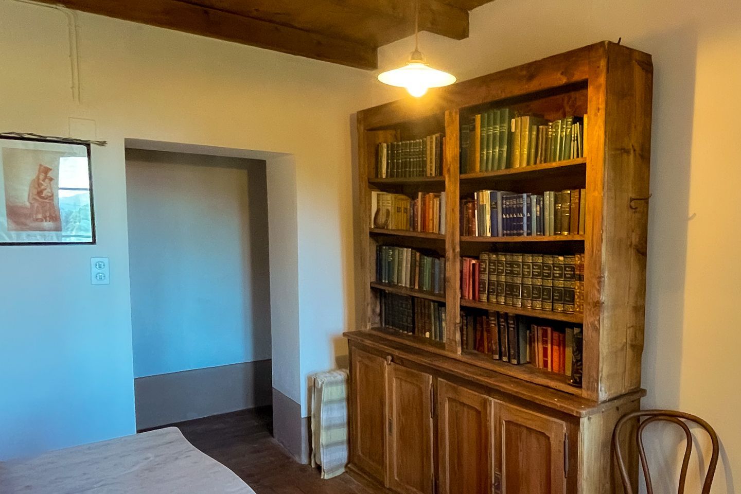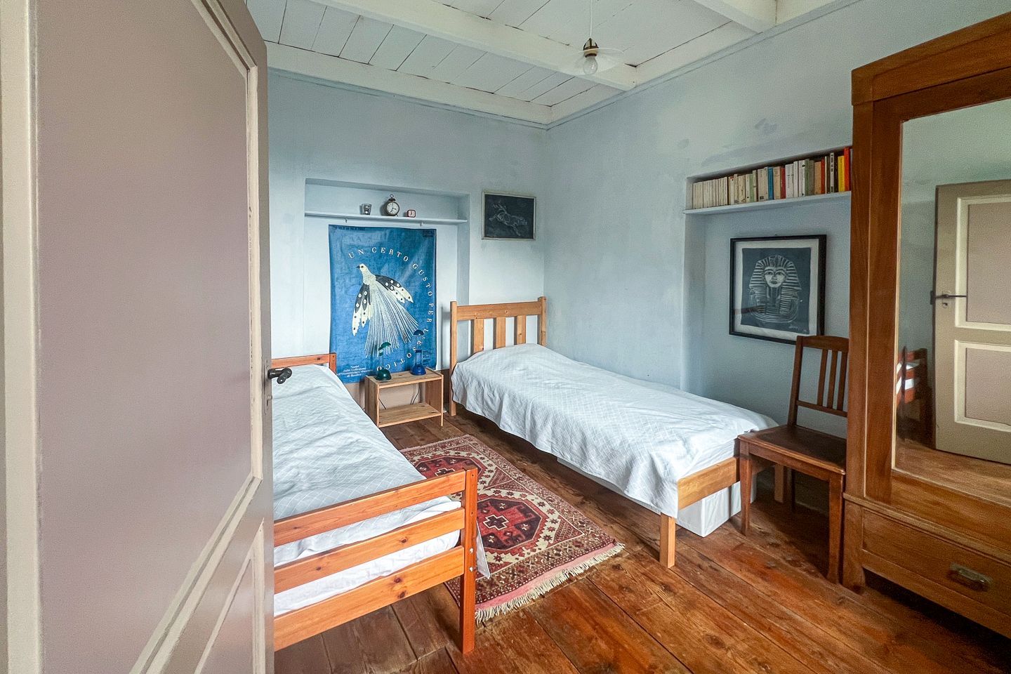 Casa Villa Esperanto verteilt sich auf zwei Etagen. Im Erdgeschoss befinden sich die Küche mit Blick ins Grüne, ein gemütliches Wohnzimmer mit rustikalen Holzbalken sowie eine grosse Terrasse mit herrlichem Ausblick auf die umliegende Natur – perfekt für Frühstück an der Morgensonne oder ein Glas Wein am Abend. Im Obergeschoss liegen ein Schlafzimmer mit Doppelbett und eines mit zwei Einzelbetten. Ebenfalls auf dieser Etage befinden sich ein kleines Badezimmer mit Dusche, eine separate Toilette und eine kleine, antike Büchersammlung. Die Einrichtung ist schlicht, natürlich und charmant – geprägt von Stein, Holz und viel Geschichte.