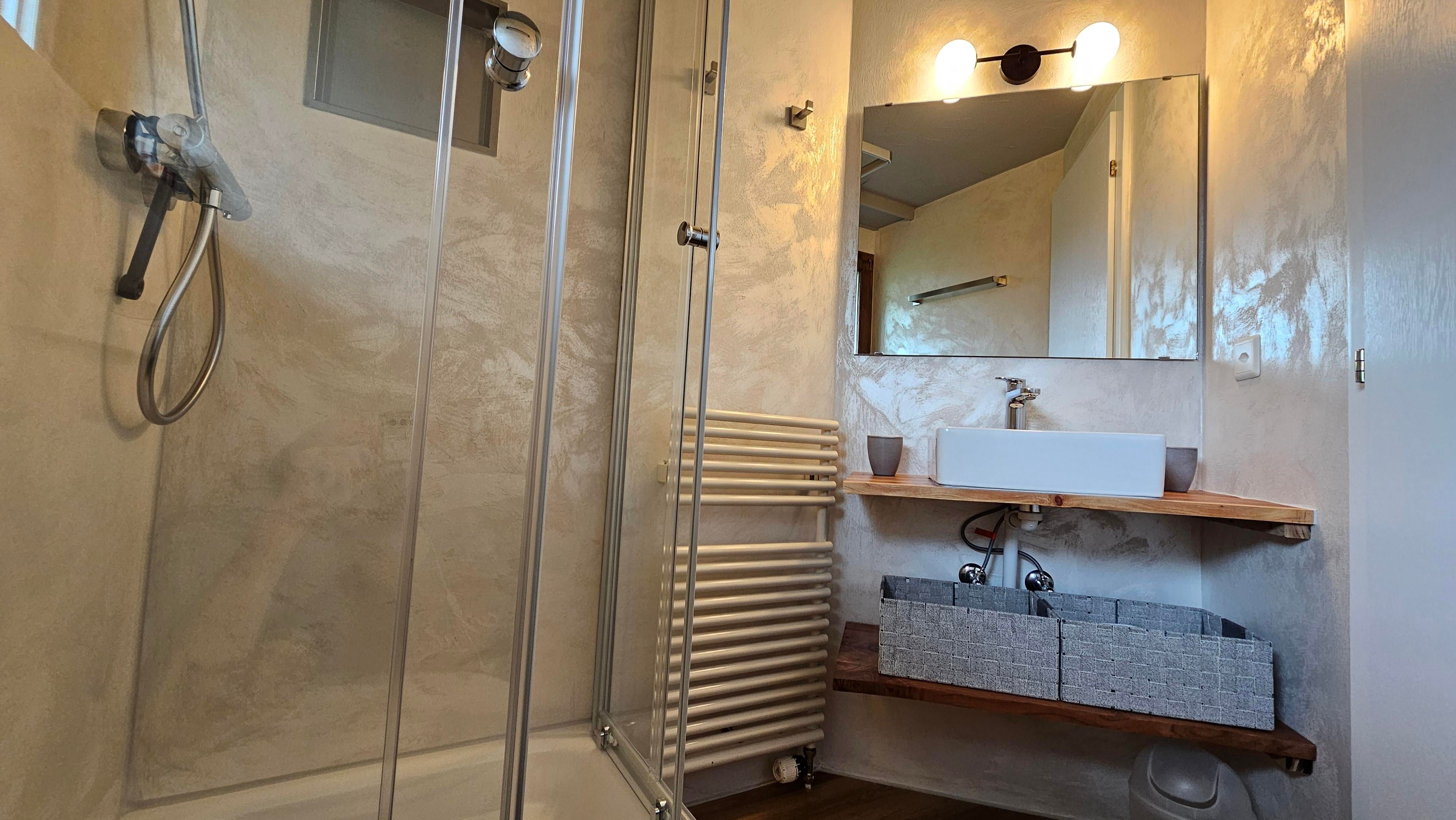 Im Wohnzimmer sorgt eine rustikale Steinwand für gemütlichen Chalet-Charme. Die Küche wurde harmonisch auf die Wandfarbe abgestimmt, wobei die Rückwand mit einer kunstvollen Gipsornamentik beeindruckt. Die beiden Schlafzimmer präsentieren sich jeweils mit einer besonderen Wandgestaltung: Eines mit einer großzügigen Gipswand, das andere mit einer farbenfrohen Swahili-Wand, die dem Raum eine exotische Note verleiht.