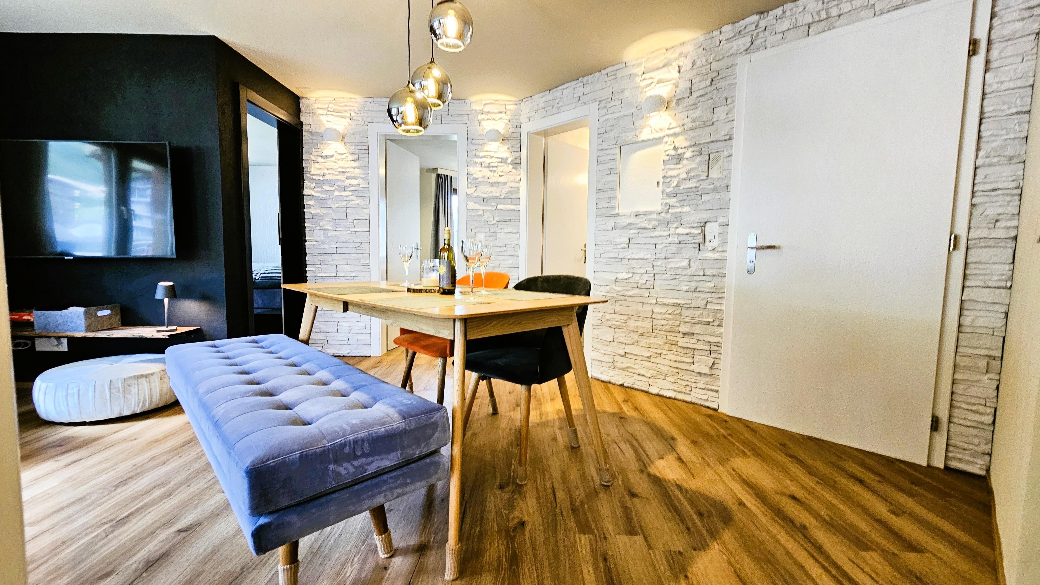Willkommen in der frisch renovierten 4-Sterne Ferienwohnung mit exklusivem Design und hochwertigen Möbeln. Die Wohnung bietet Platz für bis zu 4 Personen und begeistert mit zwei Schlafzimmern, ausgestattet mit luxuriösen Boxspringbetten (180×200 cm). Jedes Zimmer hat seinen eigenen Charakter – eines mit einer kreativen Gipswand, das andere mit einer edlen Swahili-Wand. Zwei stilvolle Badezimmer im Swahili-Design, eine kompakte Küche mit individuell gestalteter Gipswand sowie ein gemütlicher Wohnbereich mit markanter Steinwand runden das Gesamtbild ab. Mit viel Liebe zum Detail und ausgesuchten Materialien gestaltet, hebt sich das Interior deutlich vom Standard ab – ohne Preisaufschlag. Diese Wohnung ist ideal für Gäste, die Sinn für Ästhetik, Qualität und achtsamen Umgang mit dem Raum mitbringen. Wir freuen uns auf Besucher, die das Besondere suchen – und es zu schätzen wissen.