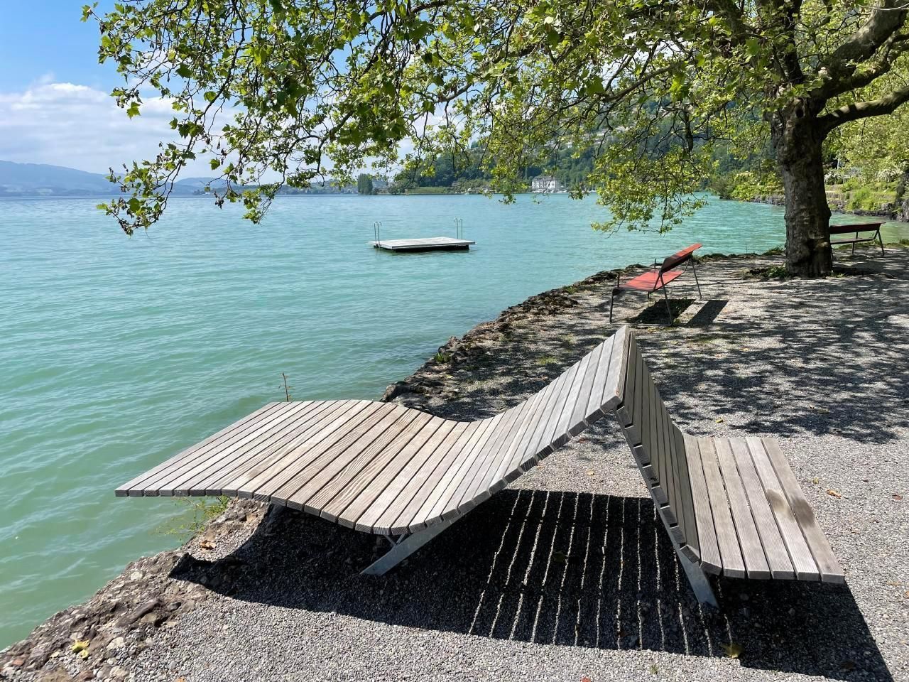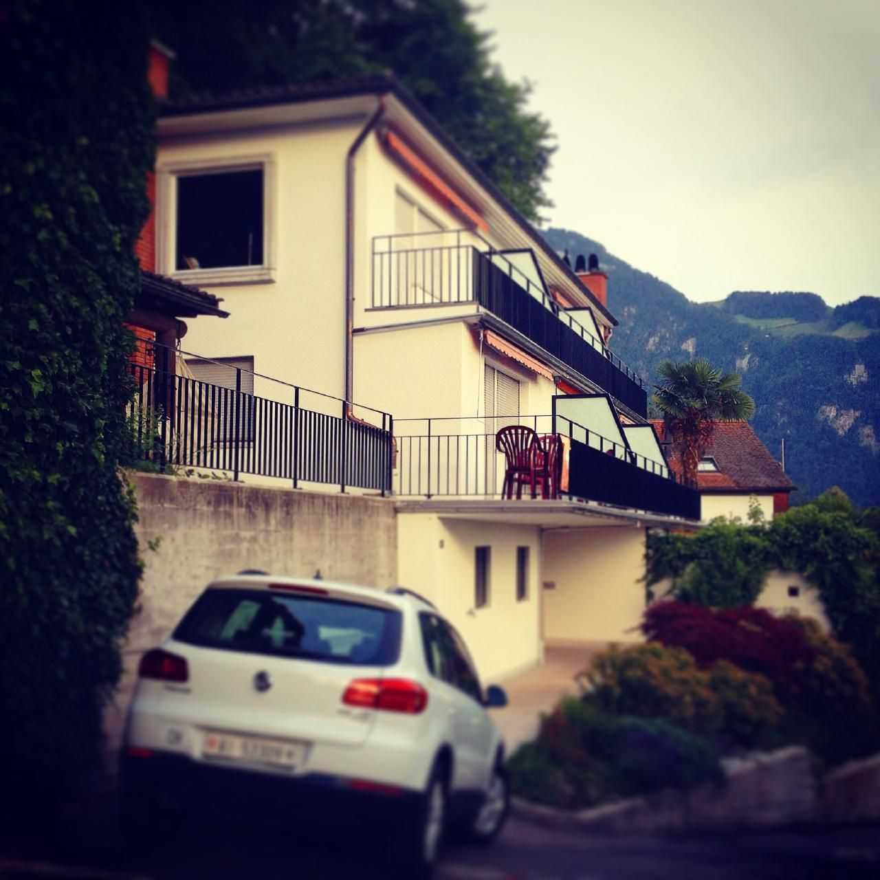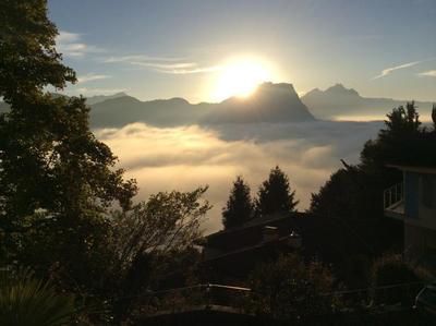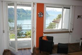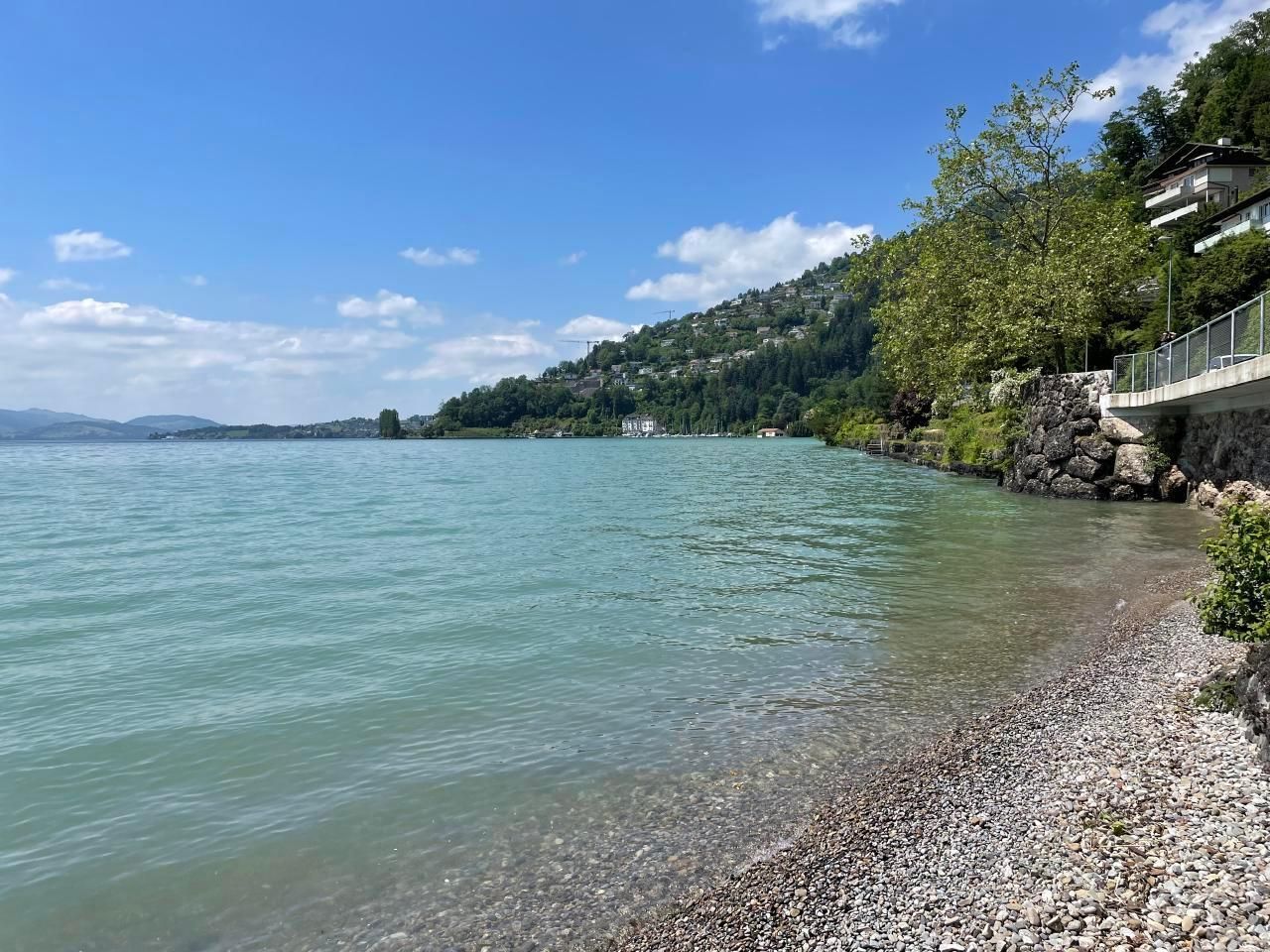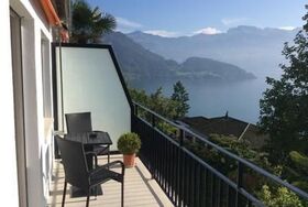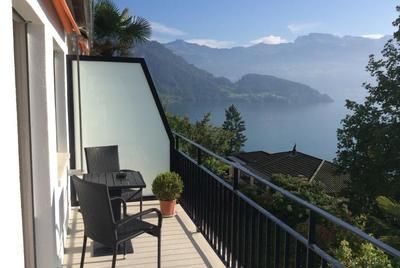 Vielleicht die schönste Aussicht an der Schweizer Riviera: Kleine 2,5 Zimmer Wohnung mit grossem Balkon hoch über dem Vierwaldstätter See. Der Blick reicht hin bis auf Luzern. Ein Parkplatz ist natürlich auch dabei. Komplett eingerichtet mit modernem Induktionsherd, Flatscreen-TV, DVD/Blue-ray Player, Wireless-Lan, Internet, kleinem Flur und Küche. Im Wohnzimmer gibt es eine bequeme Schlafcouch, die auf Wunsch zwei weiteren Erwachsenen eine Übernachtungsmöglichkeit bietet. Im Schlafzimmer steht ein Doppelbett zur Verfügung, Natürlich verfügt die Eigentümergemeinschaft auch über eine Waschmaschine und einen separaten Trockenraum. Zur Wohnung gehören ein kleiner Garten mit Kugelgrill und fantastischer Aussicht. Fussläufig erreichbar ist der frisch renovierte Traumstrand von Unterwilen. Eine verträumte Bucht mit Badeinsel, Grill, Liegen und Seeeinstieg. Perfekt für ein romantsisches Picknick am See.