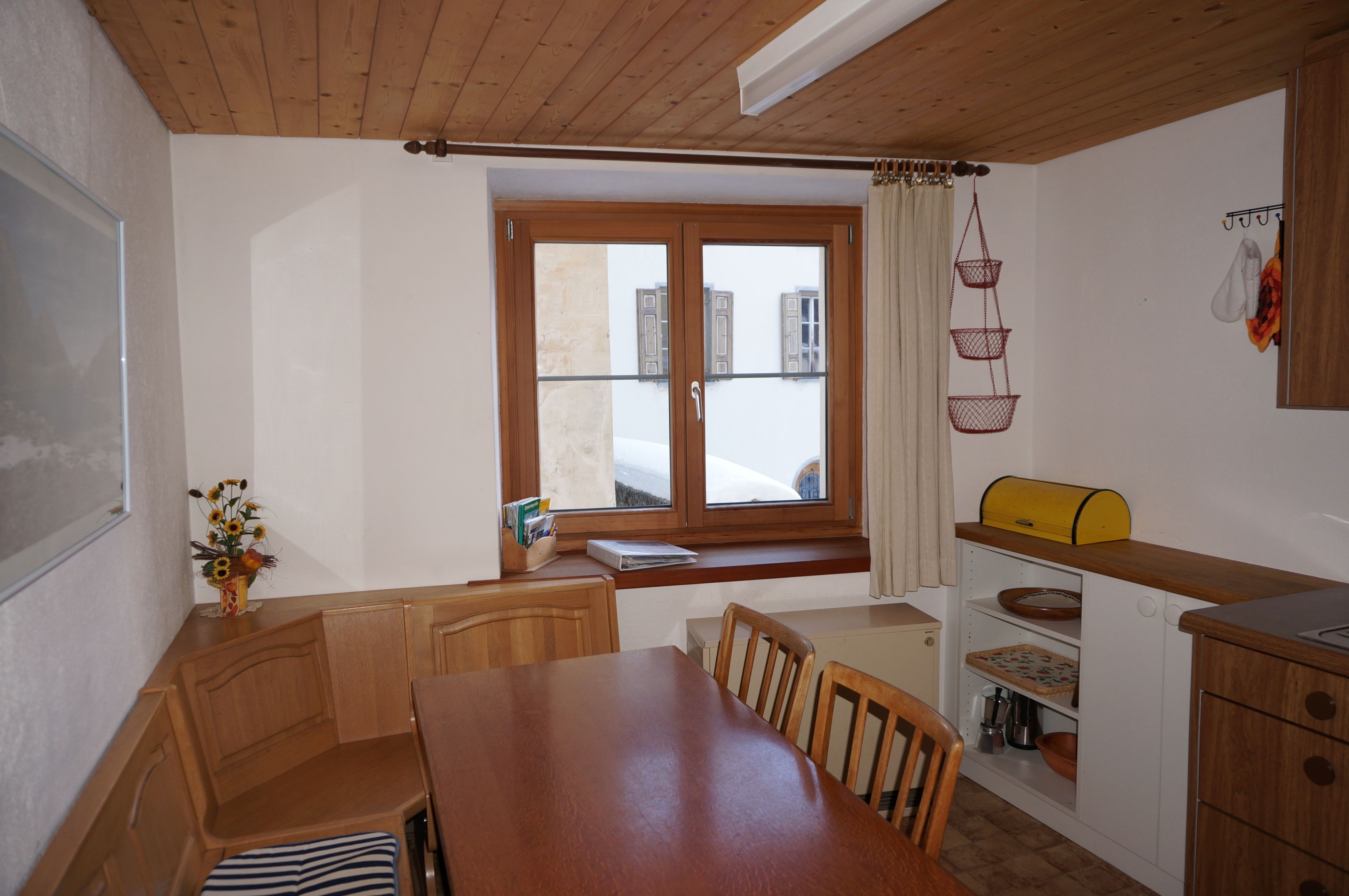 Wohnküche komplett eingerichtet, Eckbank, Tisch und Stühle, Elektroheizung, Kochherd mit 3 Herdplatten, Abzugshaube, Kühlschrank mit Gefrierfach, Kaffeekapselmaschine, Espressomaschine, Fondue- und Raclette-Set,