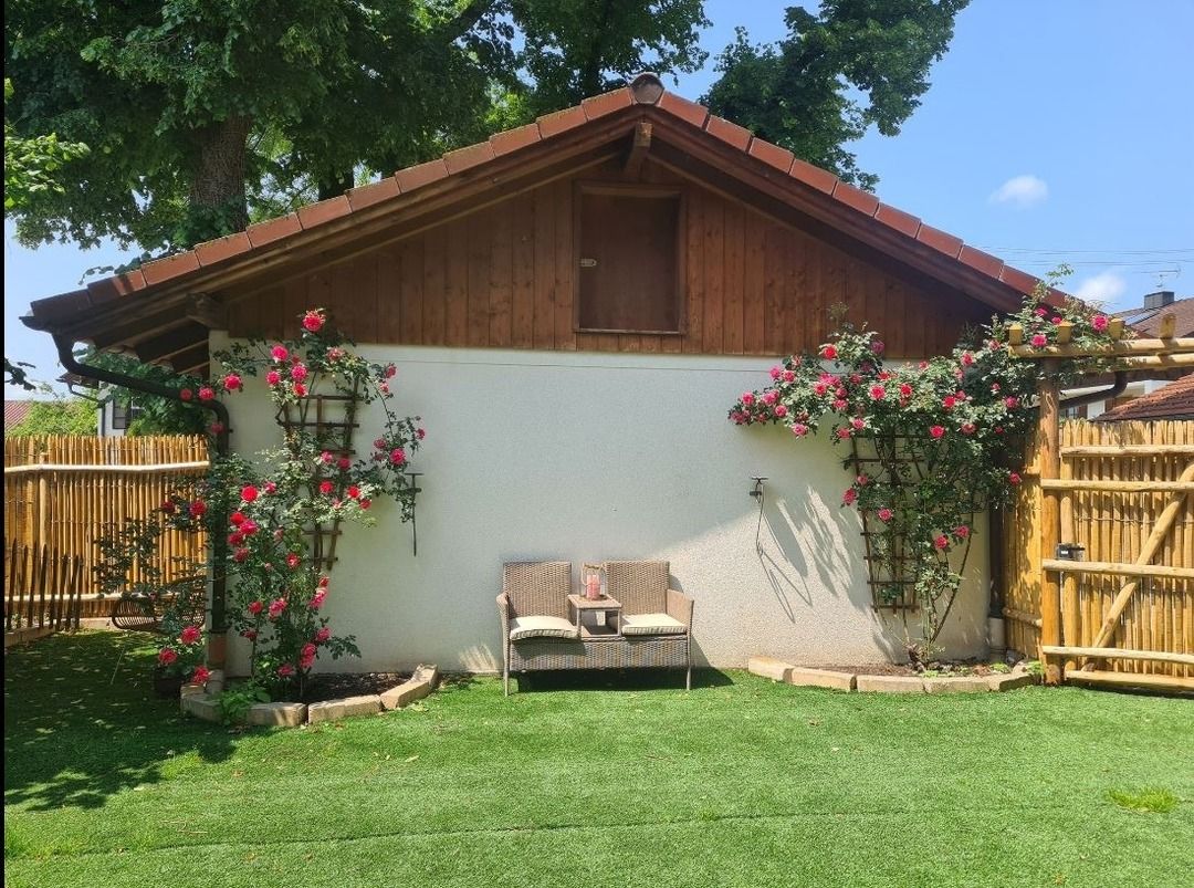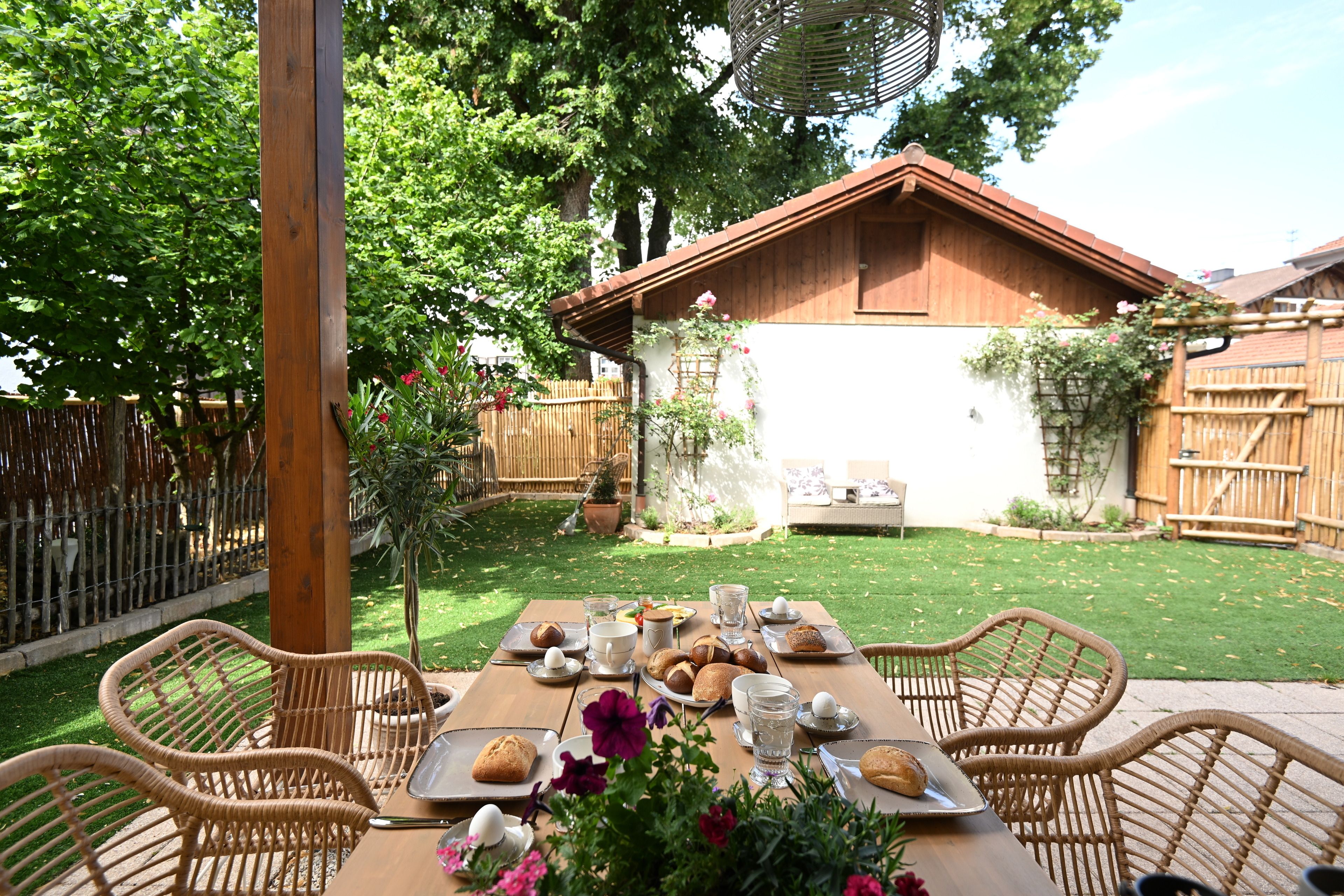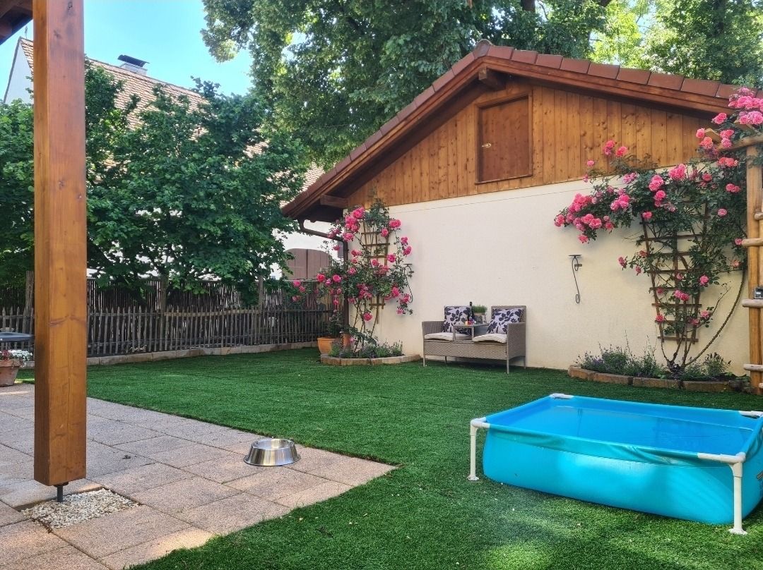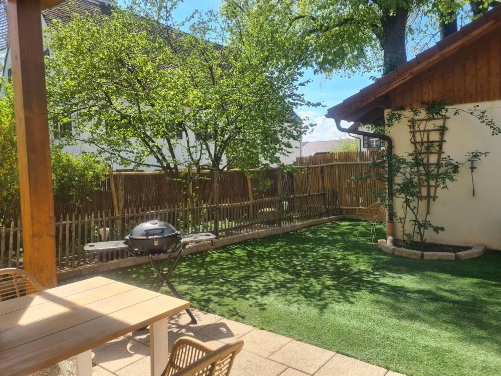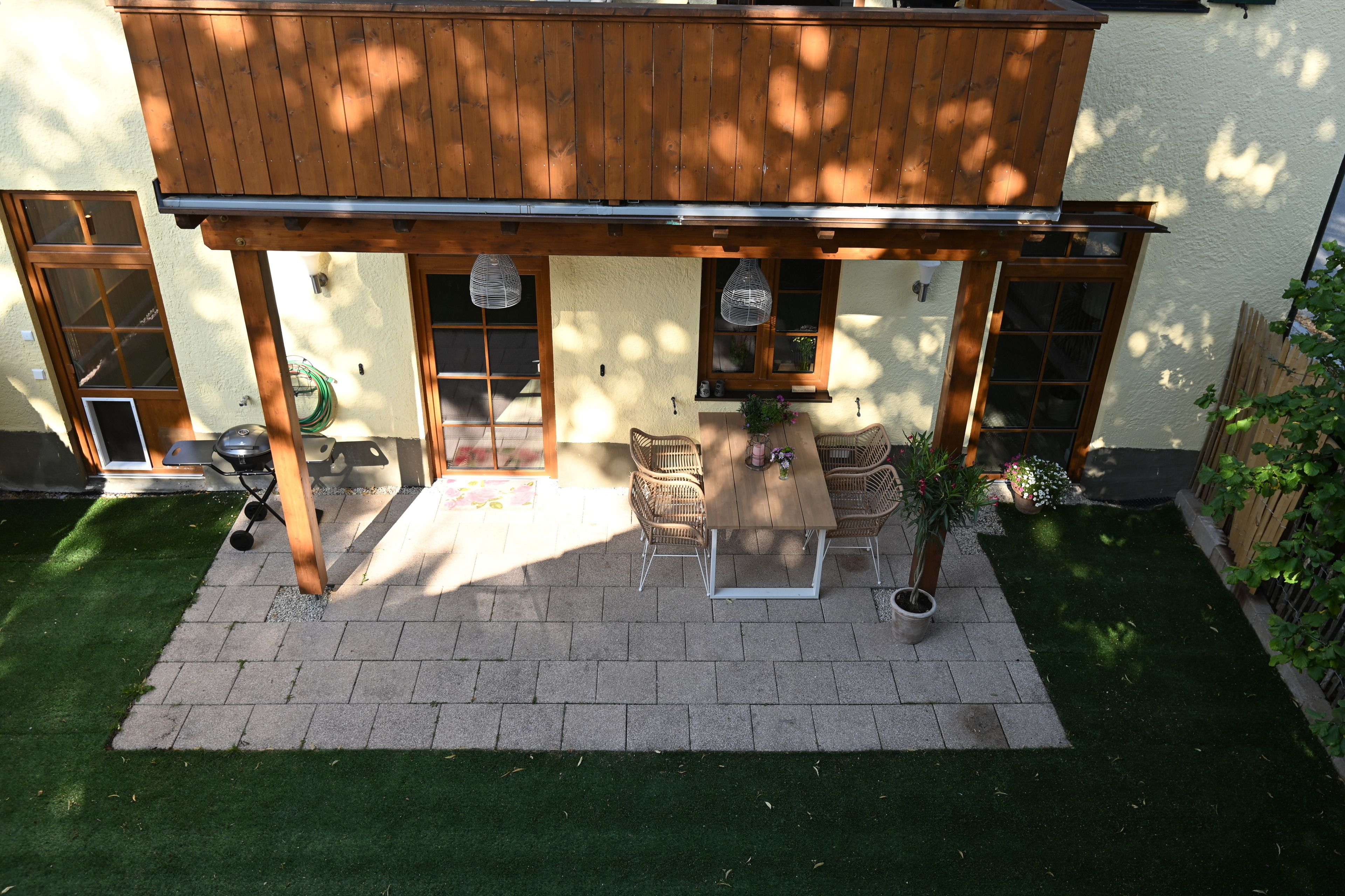 Die Terrasse ist überdacht und beleuchtet und hat einen Elektrogrill für die Sommertage. Der Garten ist rundherum 160 cm hoch eingezäunt, bietet zu 90% Sichtschutz - er ist das Highlight für die Gäste mit Hund denn hier sind auch 2 Hunde herzlich willkommen. Für Hunde und Kinder steht im Sommer ein Kinderplanschbecken oder Hundepool bereit. Der Rasen ist Kunstrasen - Naturrasen hat sich leider nicht gehalten auf der beanspruchten Fläche, aber gerade für die Sommerzeit und die Planschbeckenzeit, aber auch für den Winter ist es ideal da so kaum Dreck in die Wohnung getragen wird.