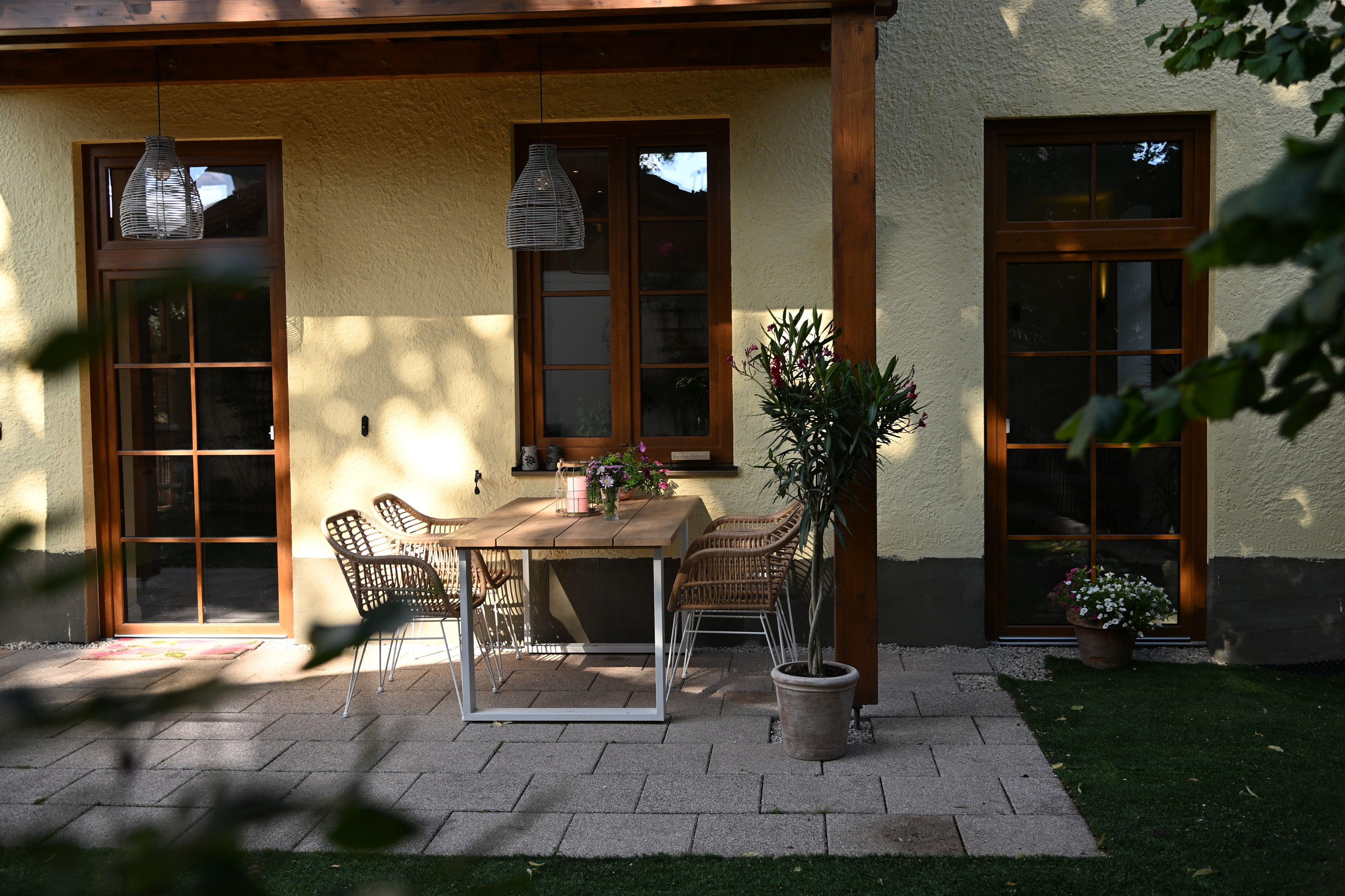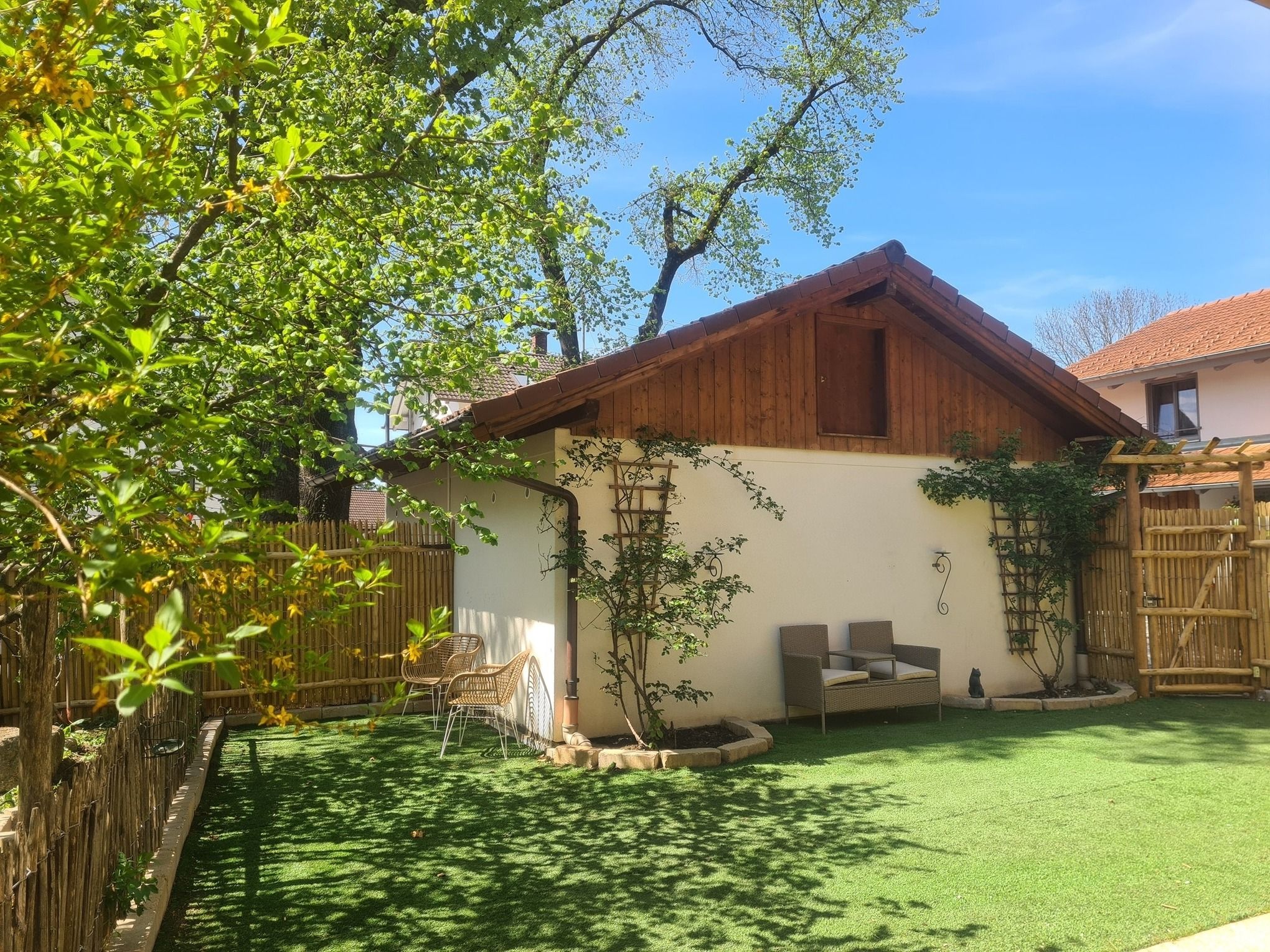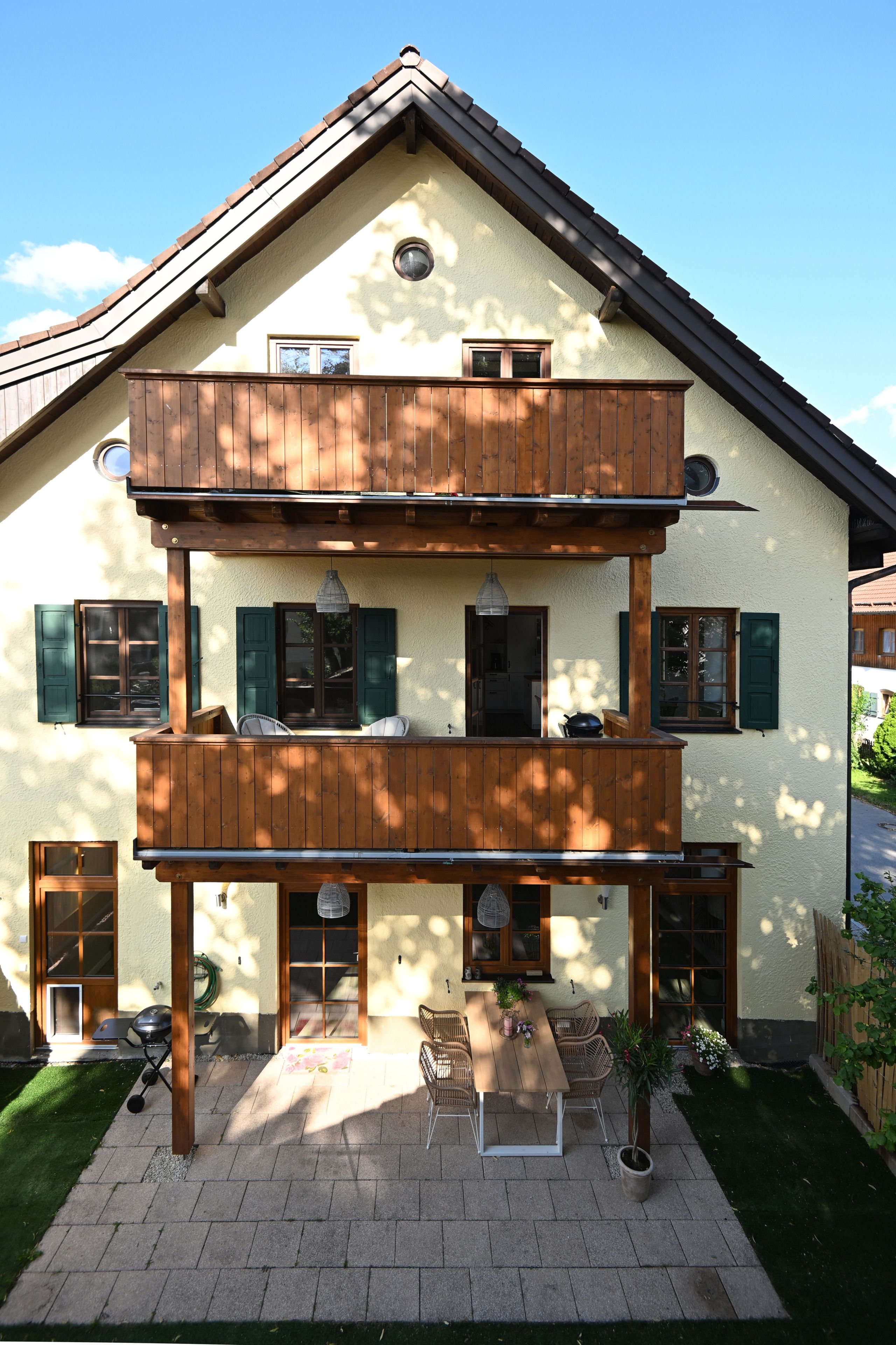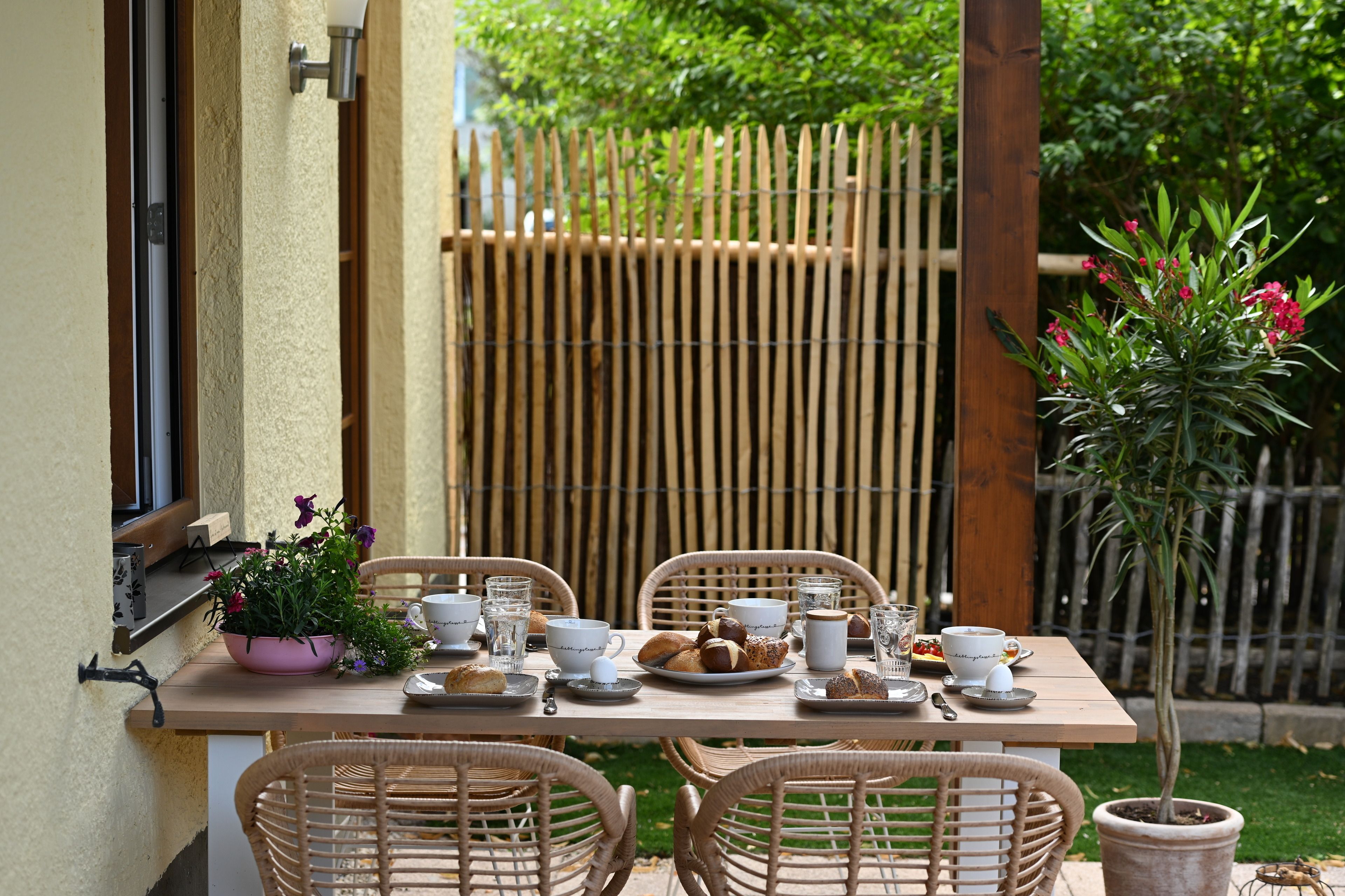 Die Terrasse ist überdacht und beleuchtet und hat einen Elektrogrill für die Sommertage. Der Garten ist rundherum 160 cm hoch eingezäunt, bietet zu 90% Sichtschutz - er ist das Highlight für die Gäste mit Hund denn hier sind auch 2 Hunde herzlich willkommen. Für Hunde und Kinder steht im Sommer ein Kinderplanschbecken oder Hundepool bereit. Der Rasen ist Kunstrasen - Naturrasen hat sich leider nicht gehalten auf der beanspruchten Fläche, aber gerade für die Sommerzeit und die Planschbeckenzeit, aber auch für den Winter ist es ideal da so kaum Dreck in die Wohnung getragen wird.