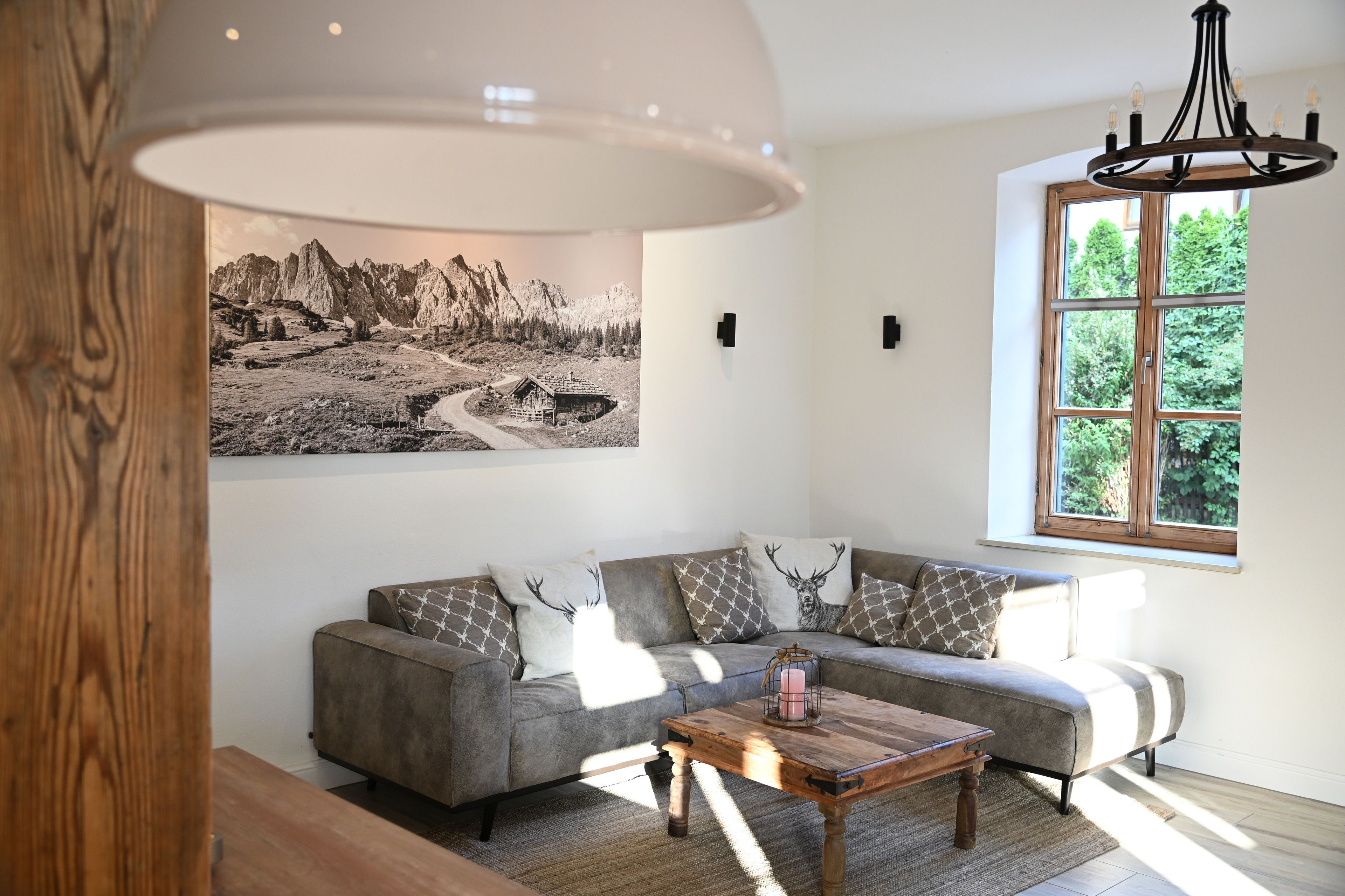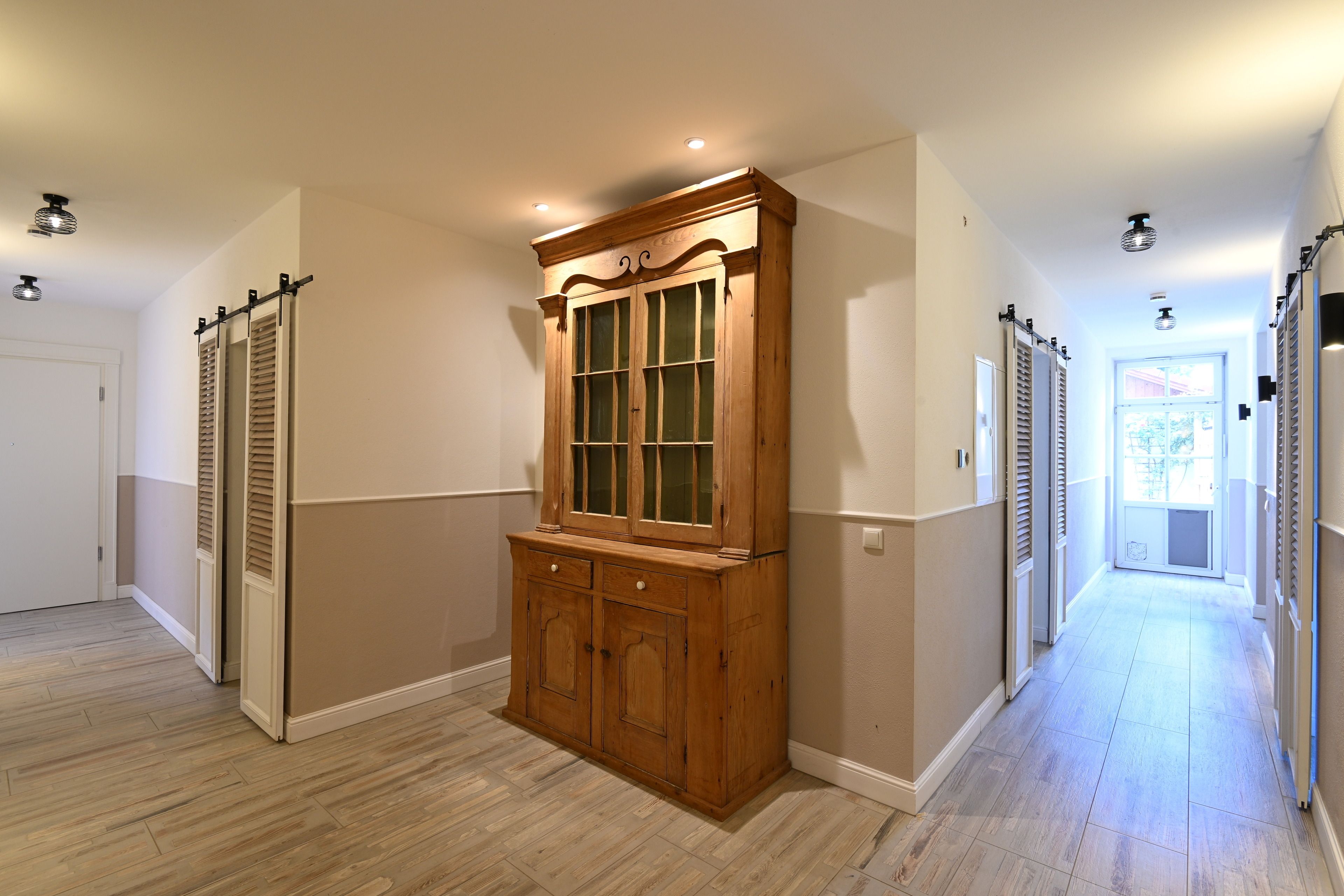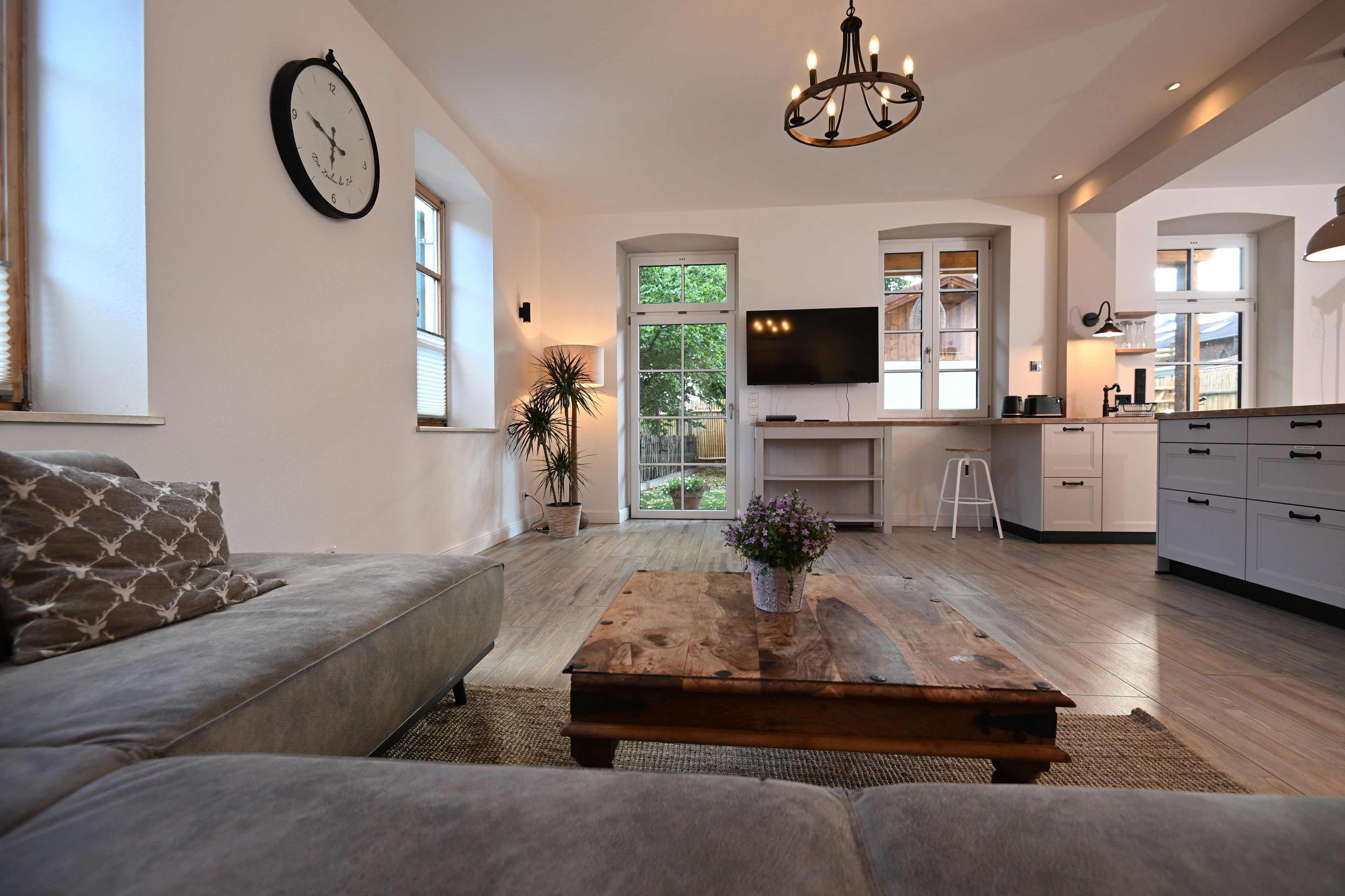 Die hohen Sprossenfenster im gesamten Wohnraum bieten viel natürliches Licht am Tag. Am Abend können Sie die zahlreichen Deckenstrahler nach Zonen individuell dimmen um so gemütliche Zonen zu schaffen oder den gesamten Wohnraum strahlen hell zu erleuchten.