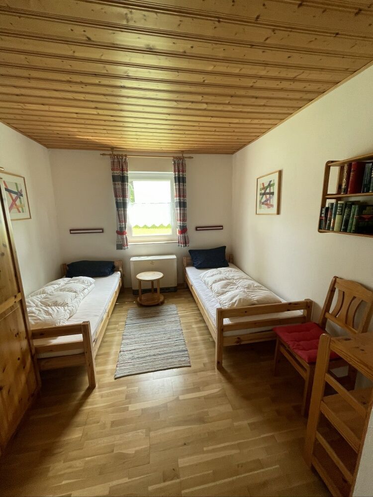 Das Haus bietet Platz für bis zu 8 Personen, ideal für zwei Familien oder eine Gruppe, mit fünf Schlafzimmern und großzügigem Wohnraum. Auf dem über 1100m² großen Grundstück finden Kinder vielfältige Spielmöglichkeiten. Der Esstisch im Wohnzimmer bietet Platz für bis zu 8 Personen. Die Südterrasse mit freiem Blick auf Alpspitze, Buron, Reuter Wanne und Grünten ist mit Gartenmöbeln und Markise ausgestattet. Im Erdgeschoss befinden sich drei neu möblierte Schlafzimmer mit Waschbecken (ein Doppelbett, zwei Zimmer mit je zwei Einzelbetten), ein renoviertes Bad mit Dusche und WC, ein separates WC sowie Abstellraum mit Waschmaschine, Staubsauger, Bügeleisen und Sonnenliegen.