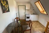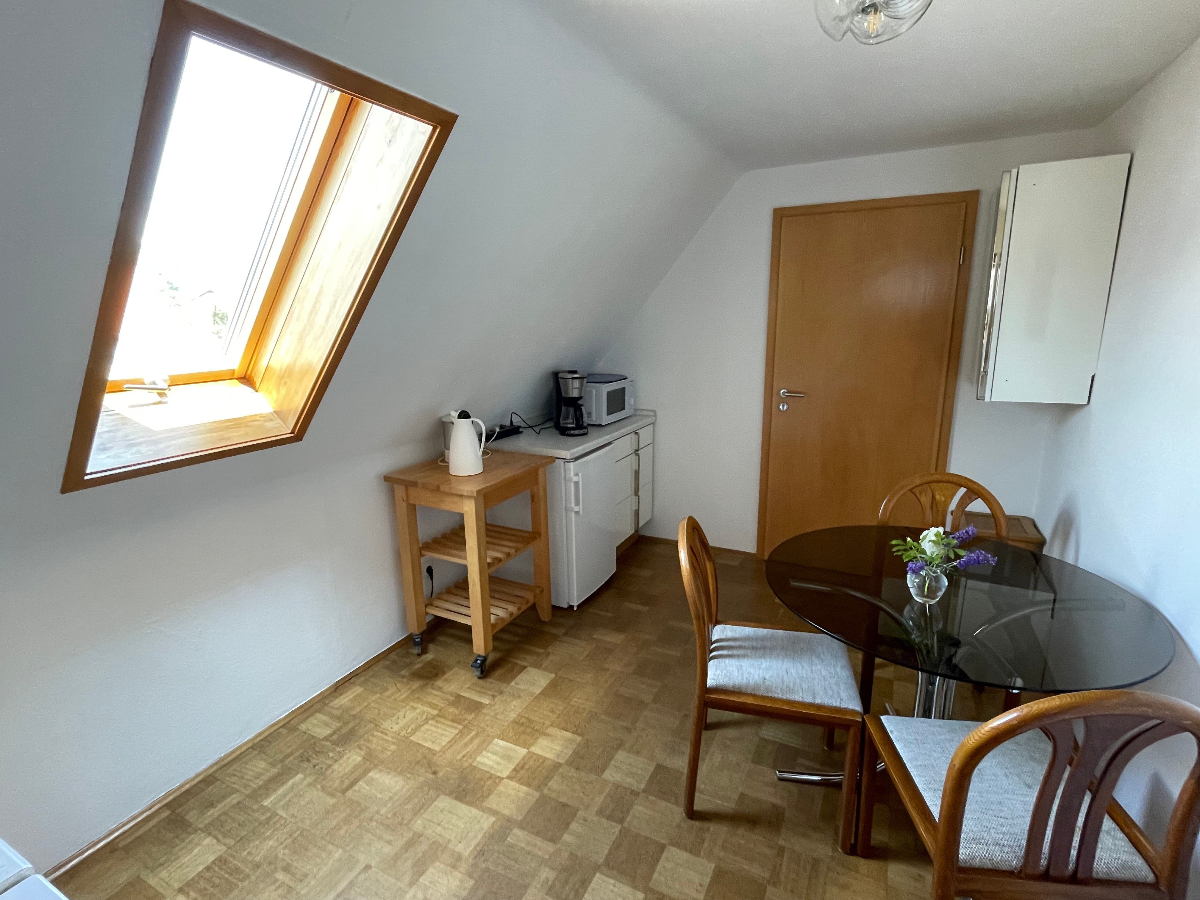 Ca. 40m² und Platz für 2 bis 4 Gäste. Die Wohnung liegt im Dachgeschoss, hat ein Wohn-/Schlafzimmer, ein separates Schlafzimmer, eine gut ausgestattete Wohnküche, Duschbad und WC. Kein Balkon. Allergikergeeignete Nichtraucherwohnung mit vorwiegend Paarkettböden.