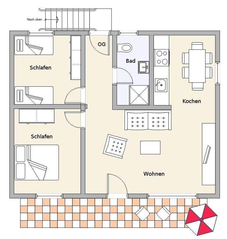 Die Ferienunterkunft Haus 43 Talblick Fewo 1 oben befindet sich im ersten Obergeschoss des Feriendorfs Hohen Bogen und bietet auf 75 m² Platz für bis zu 5 Personen. Die Wohnung verfügt über 2 Schlafzimmer und ist somit ideal für Familien oder kleine Gruppen geeignet.