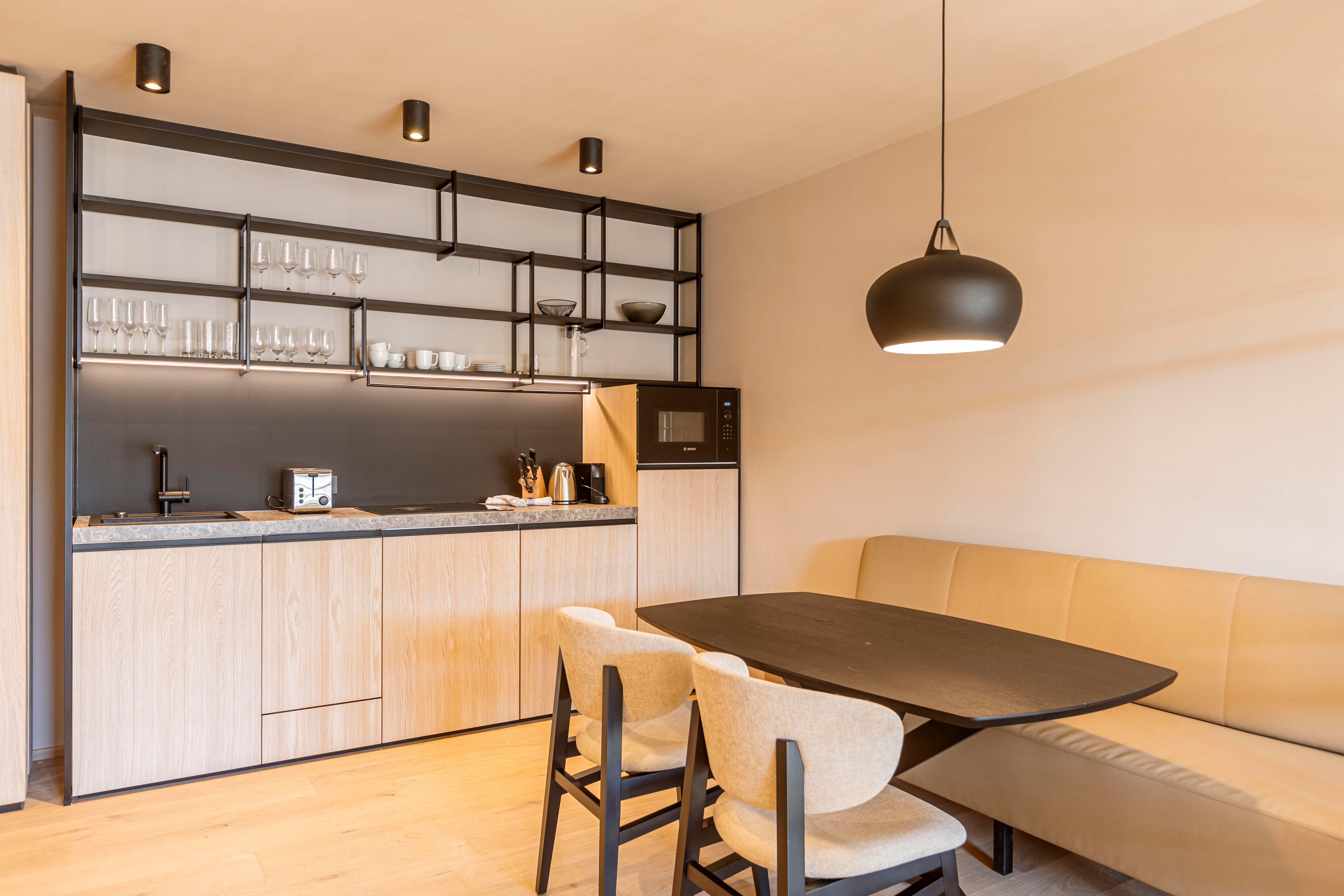 Die offene Küche im Apartment ist voll ausgestattet: Besteck, (Koch-) Geschirr, Cerankochfeld, Mikrowelle mit Backfunktion, Geschirrspüler, Kühlschrank mit Gefrierfach, Toaster, Wasserkocher, Kaffeemaschine.