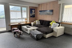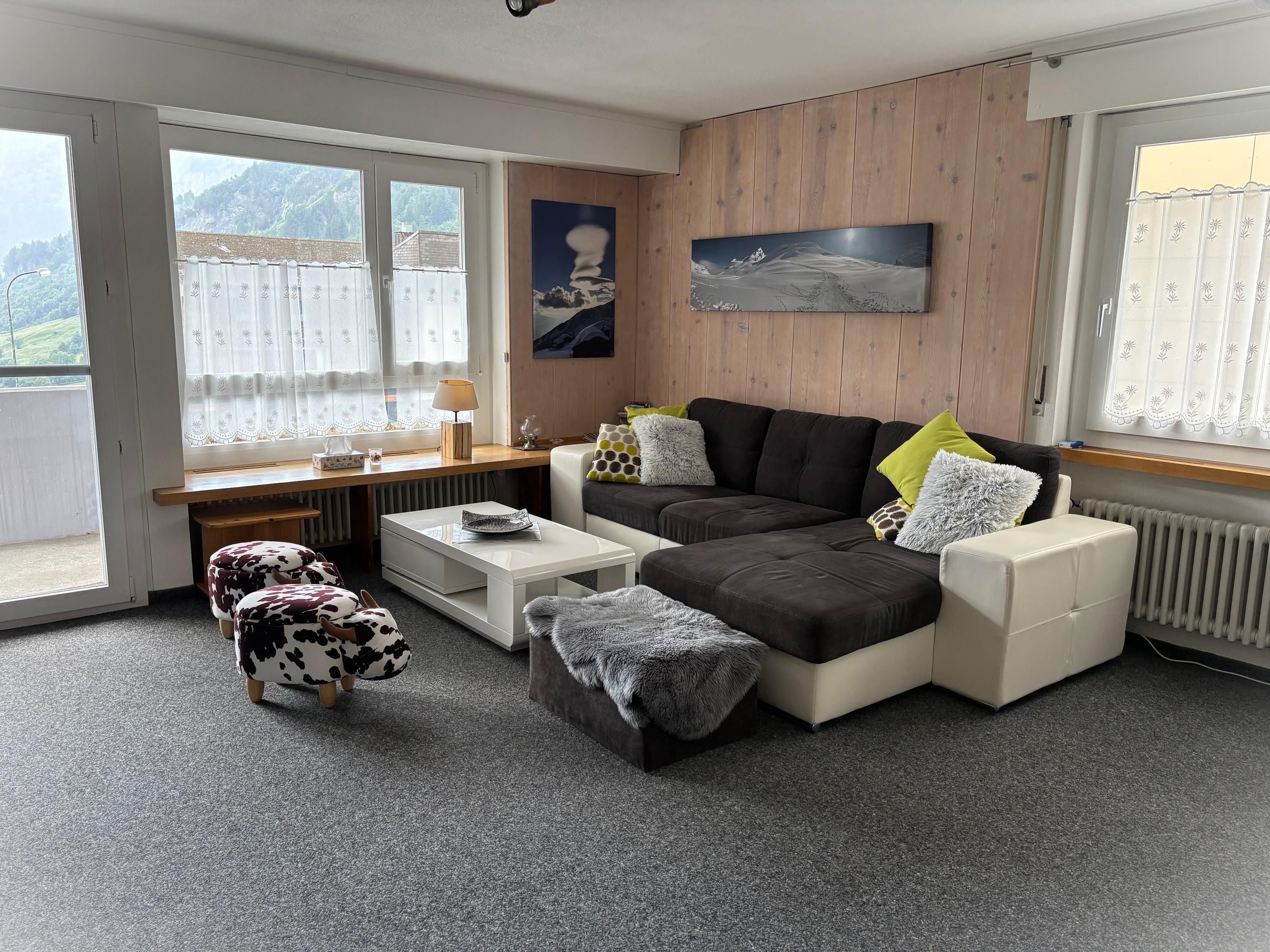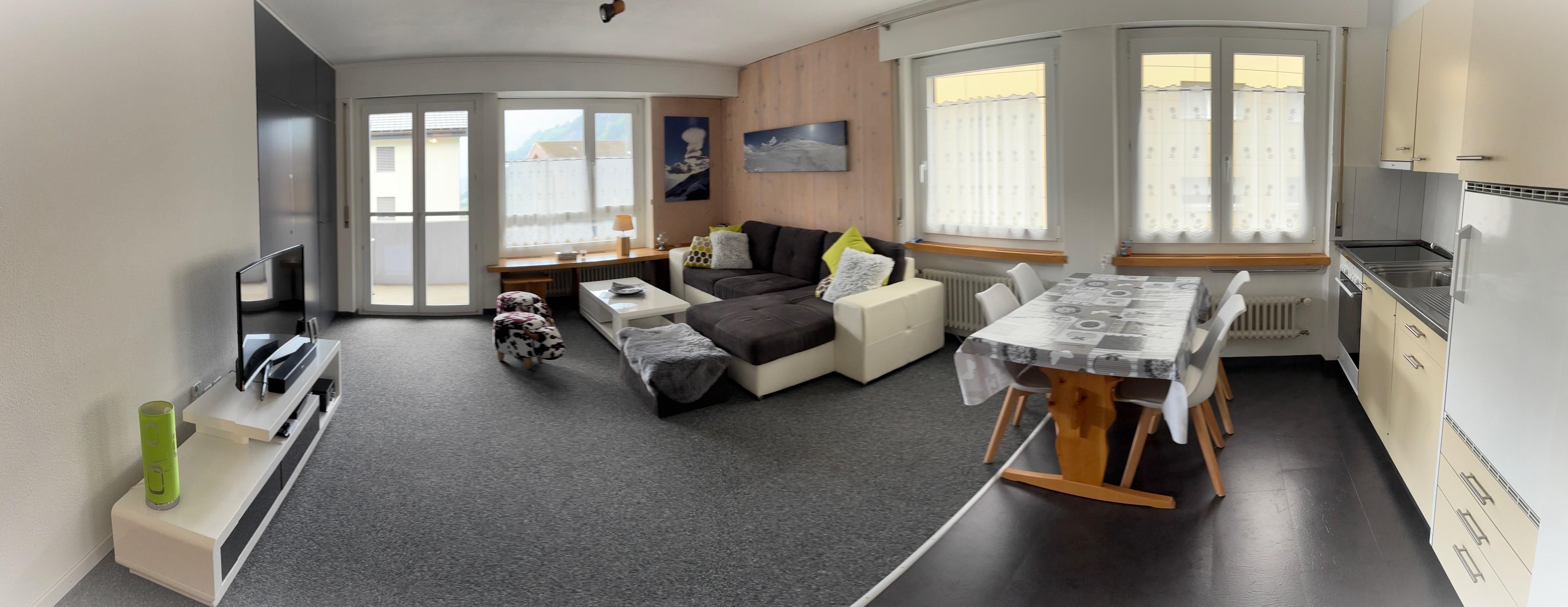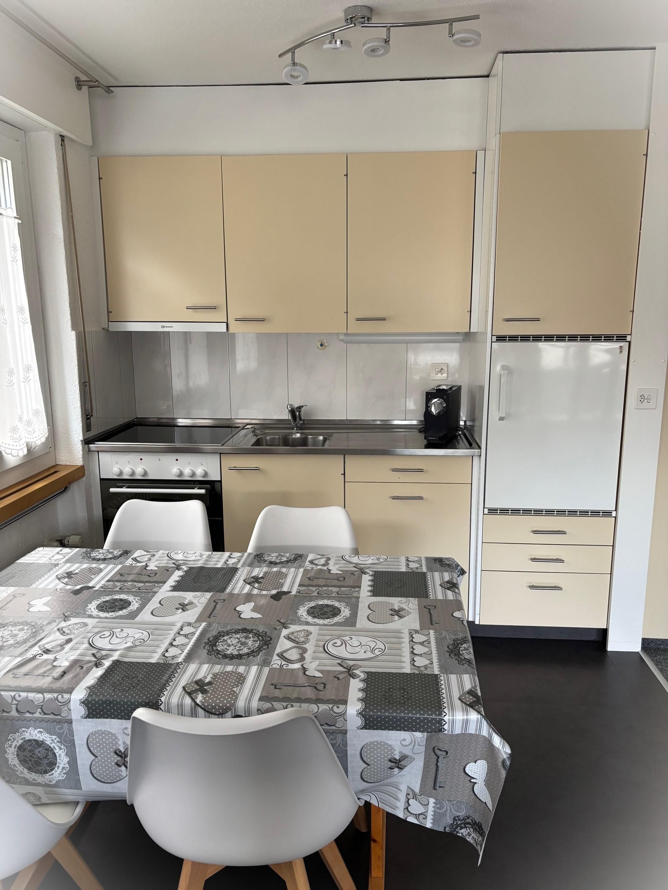 Moderne 2-Zimmerwohnung (55m2) mit Südbalkon: Gemütliches Wohn-/Esszimmer, offene Küche, gratis WiFi, TV, Radio, Schlafzimmer mit Doppelbett und einem Etagenbett, Bad/WC. Aussenparkplatz direkt beim Haus. Nichtraucherwohnung. Haustiere nicht erlaubt.