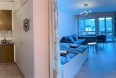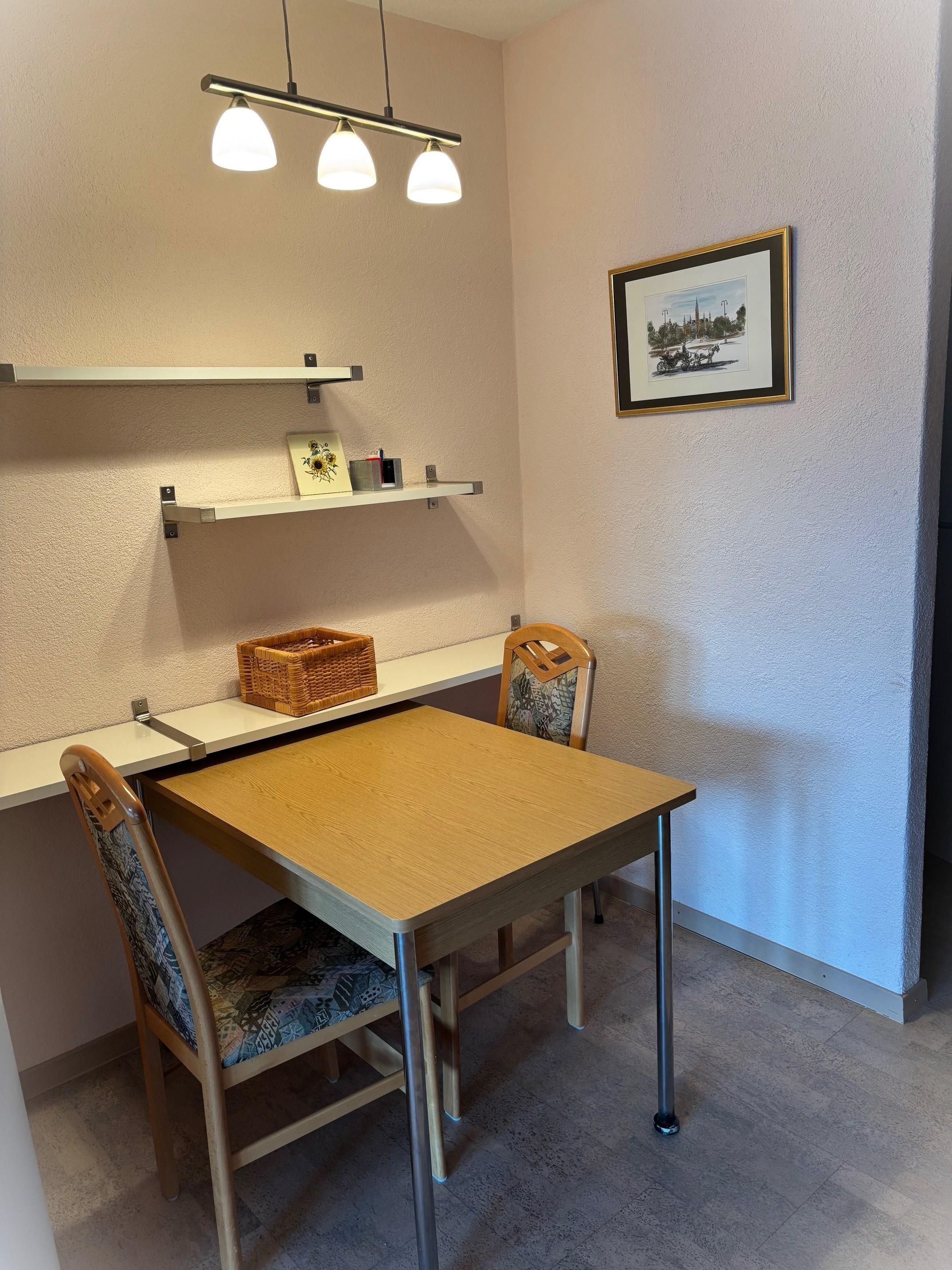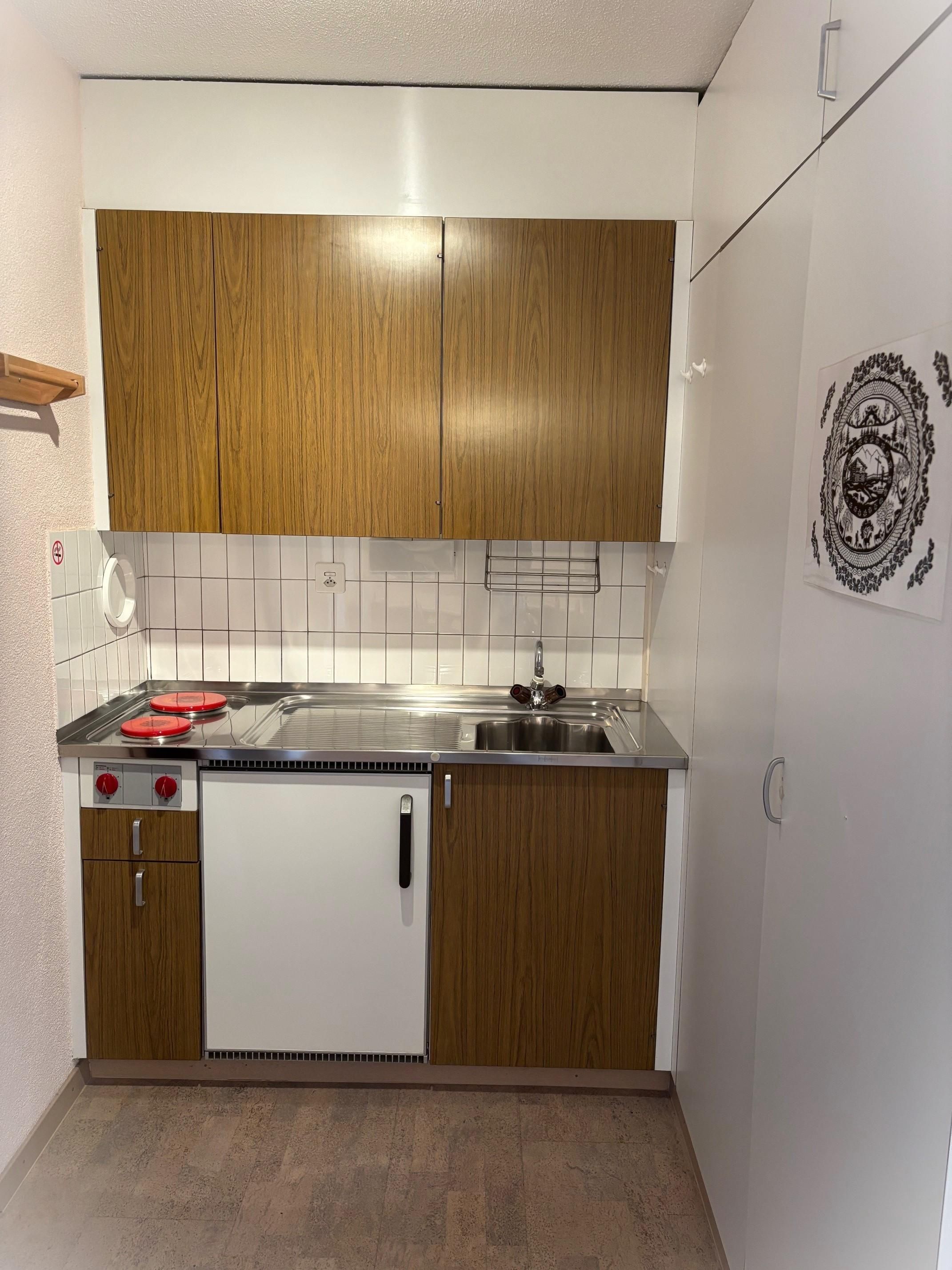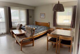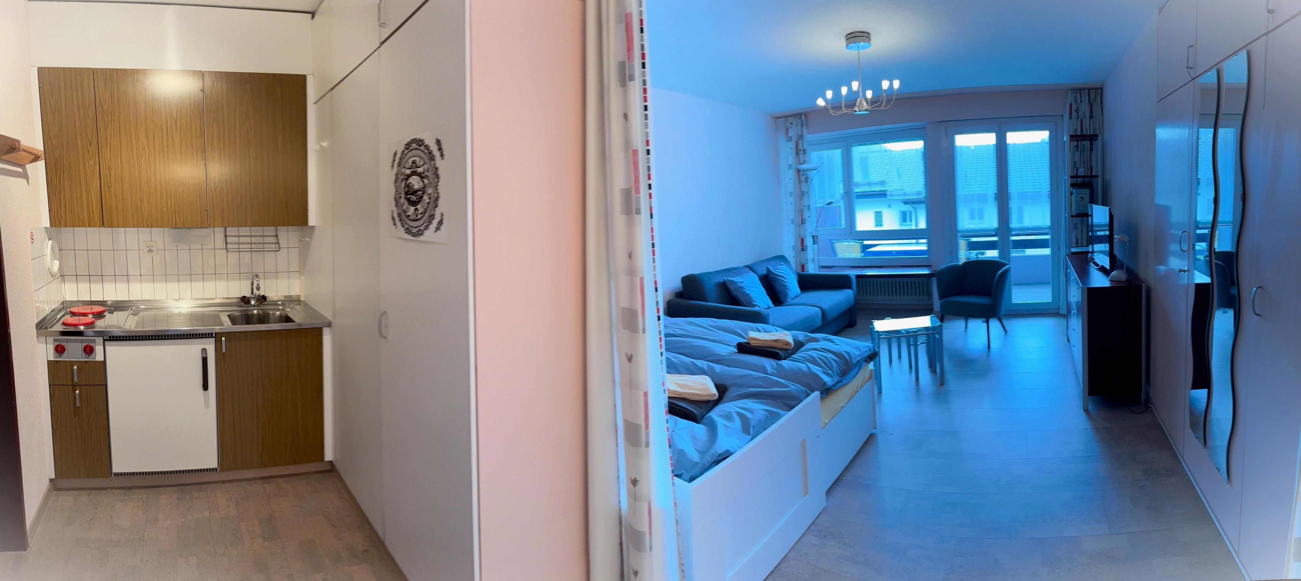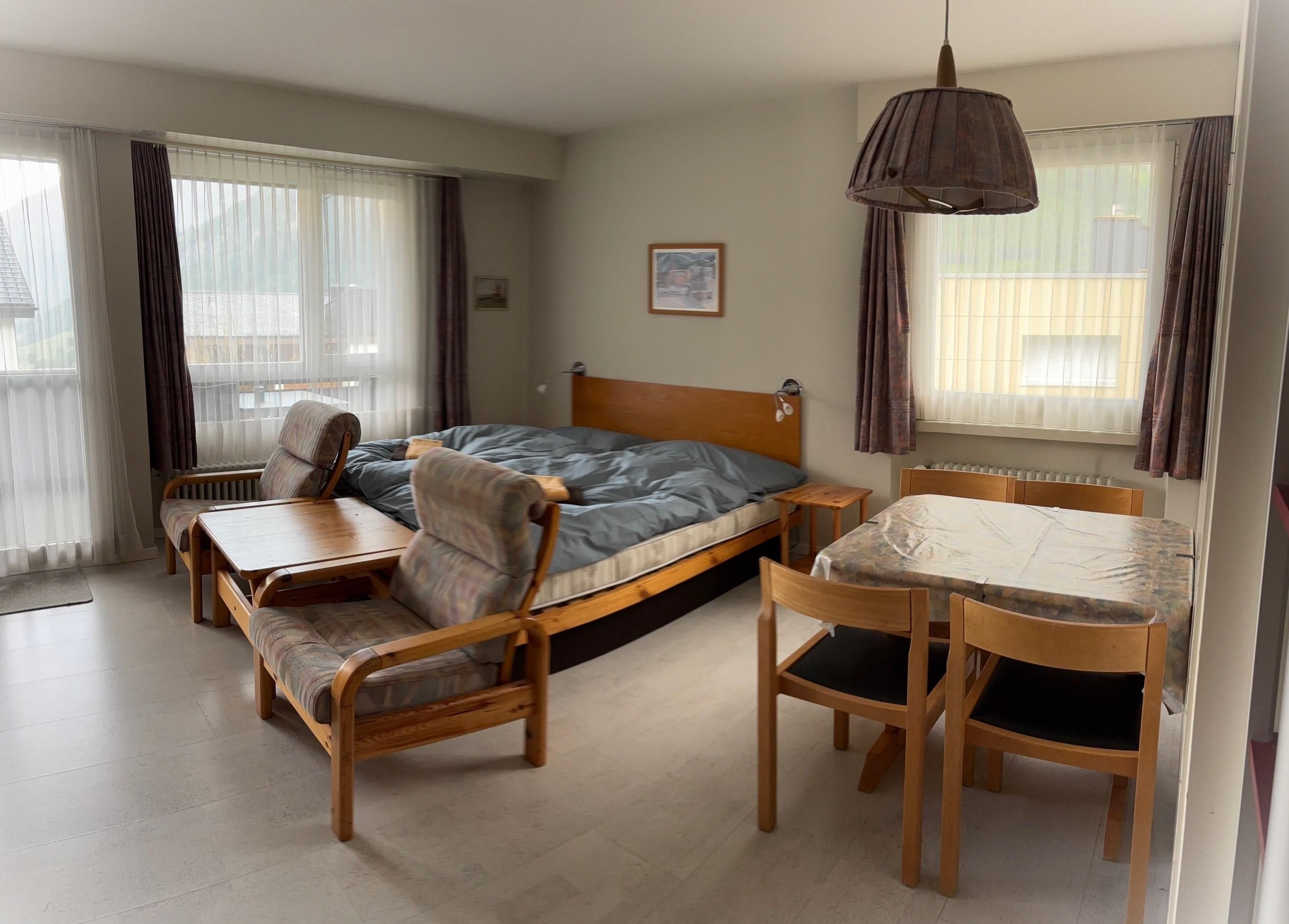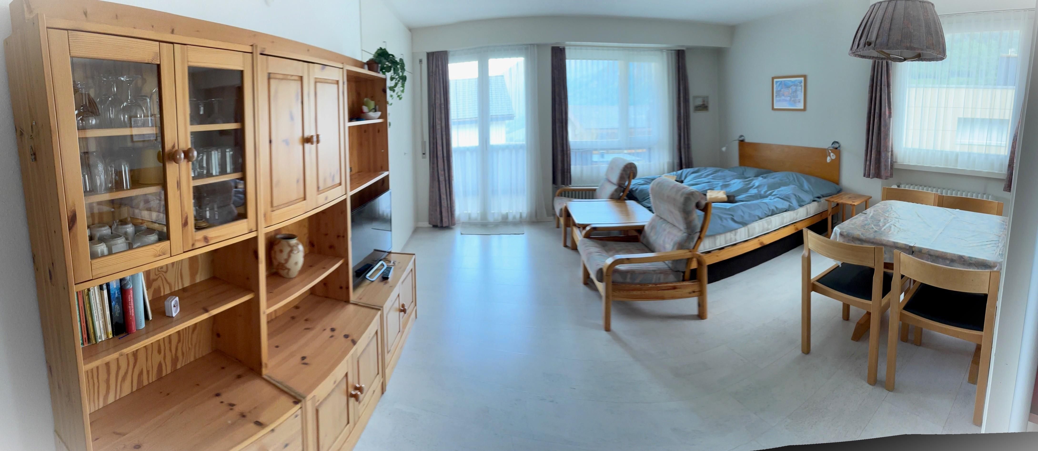 Doppel-Studio mit 2 Südbalkonen (53m2): Zwei gemütliche 1-Zimmerwohnungen mit Verbindungstüre, zwei helle Wohn-/Ess-/Schlafzimmer, davon einmal mit Doppelbett und einmal mit 2 Einzelbetten plus Schlafsofa, gratis WiFi, 2 TV / Radio, zwei vollausgestattete Küchen, 2 Bad/WC. Aussenparkplatz direkt beim Haus. Nichtraucherwohnung. Haustiere willkommen.