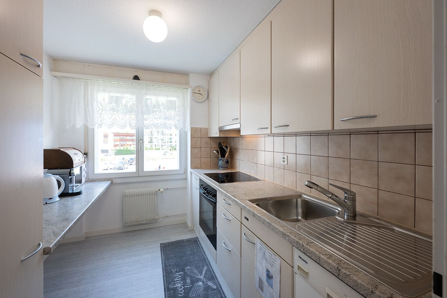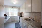 Separate Küche mit Fenster und Dampfabzug, mit 4-Platten Glaskeramikherd, Kühlschrank mit Tiefgefrierfach,