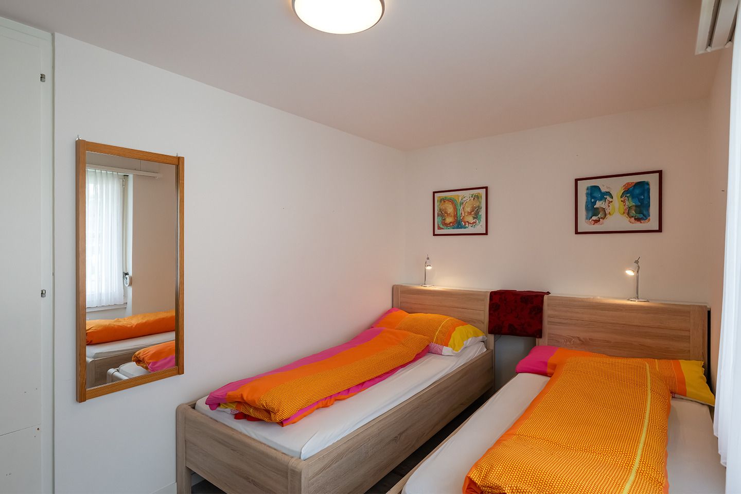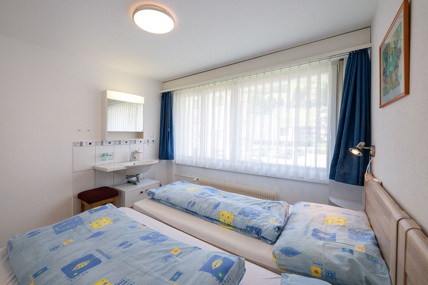 1 Schlafzimmer mit Doppelbett (2 Betten, 90x200), Lavabo und Spiegel.