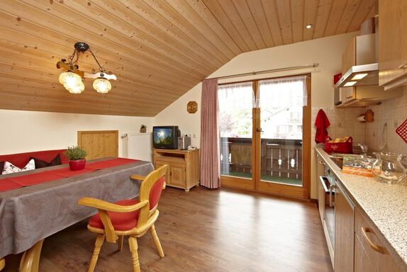 Gemütliche Ferienwohnung im 2. Stock für 2 Personen mit einem Wohnraum mit Küchenzeile, separatem Schlafzimmer, geräumiger Bad mit Dusche/WC, sowie schönem Westbalkon mit Blick auf unseren Hausberg, das Hörnle. Die Wohnung ist mit einem Flat-TV, Stereoanlage und Telefon ausgestattet. Kostenloses LAN/WLAN!