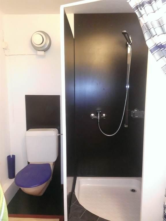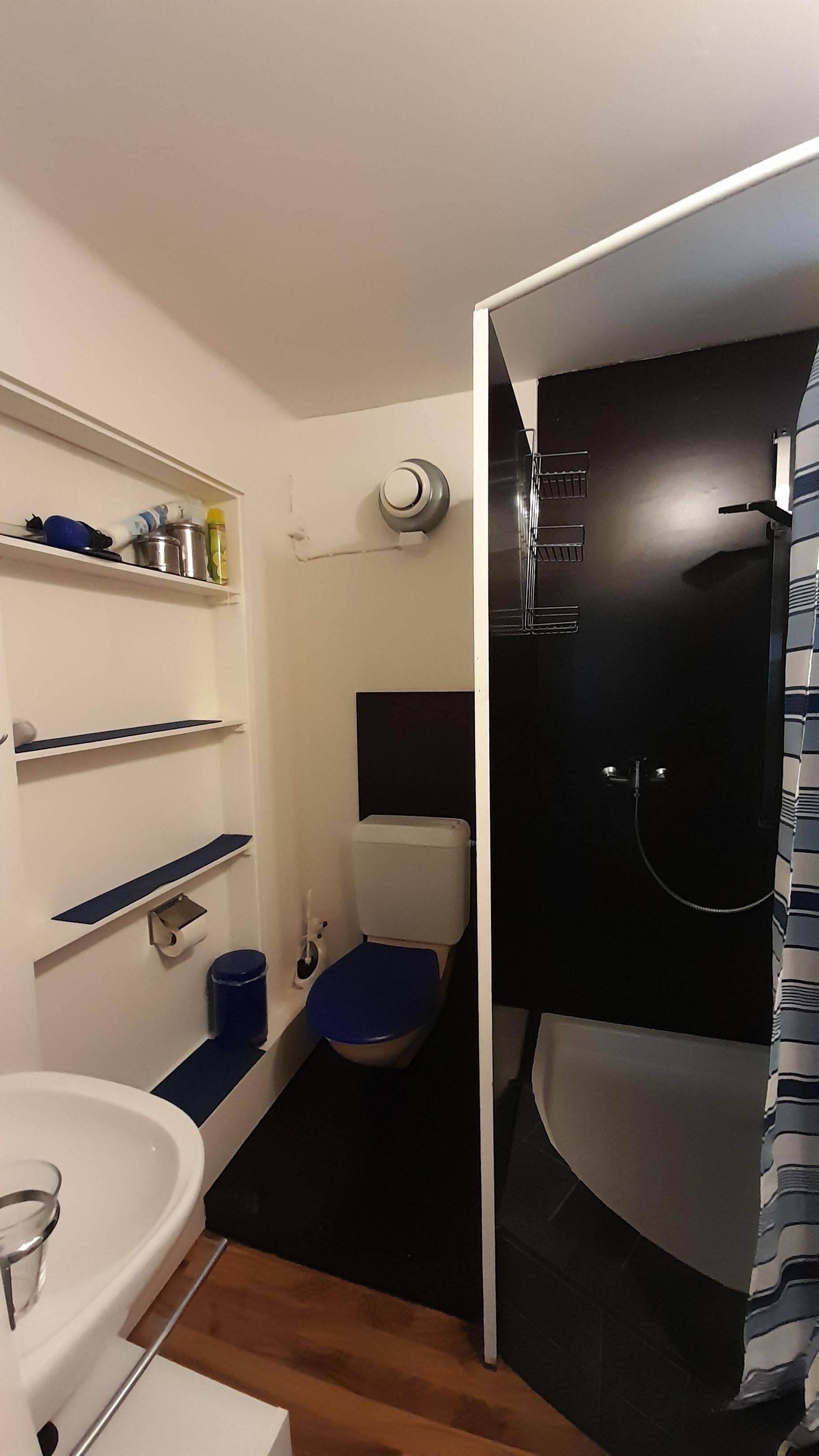 Auch gibt es im Wohnraum eine Gardine zur Zimmer Trennung bei Übernachtung auf dem Schlafsofas. Kleines Badezimmer mit Dusche WC und Lavabo.