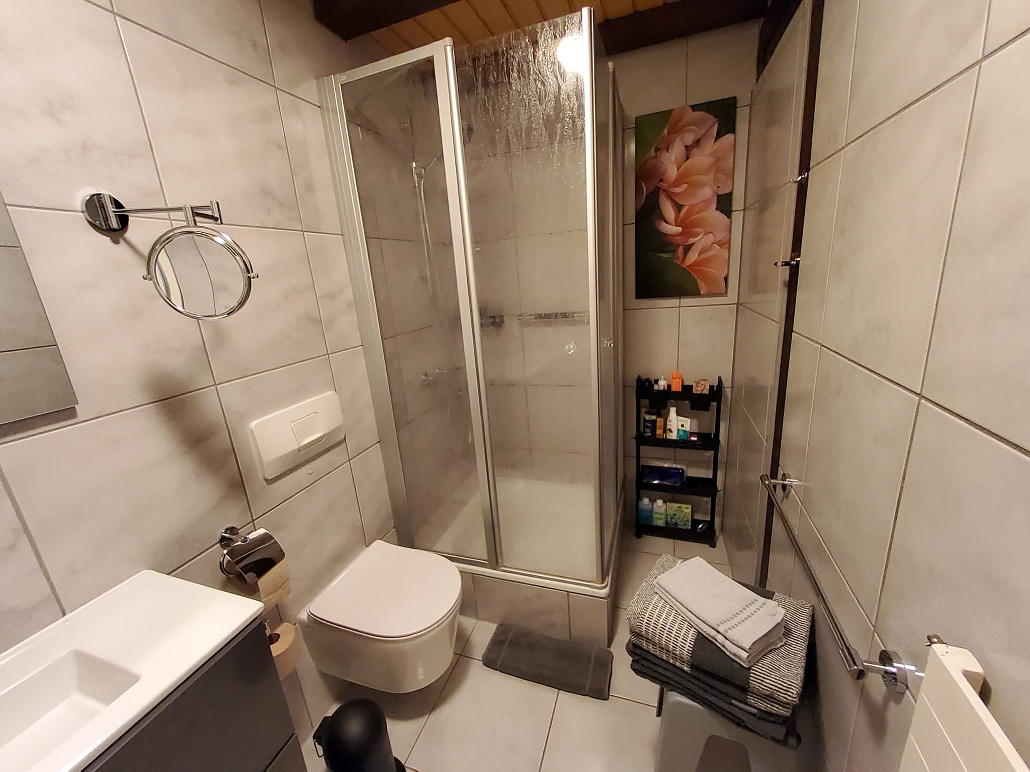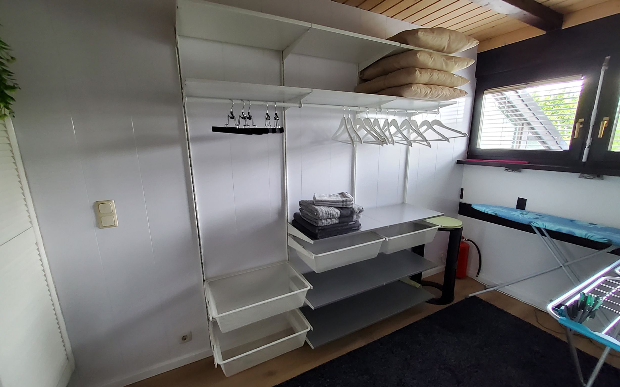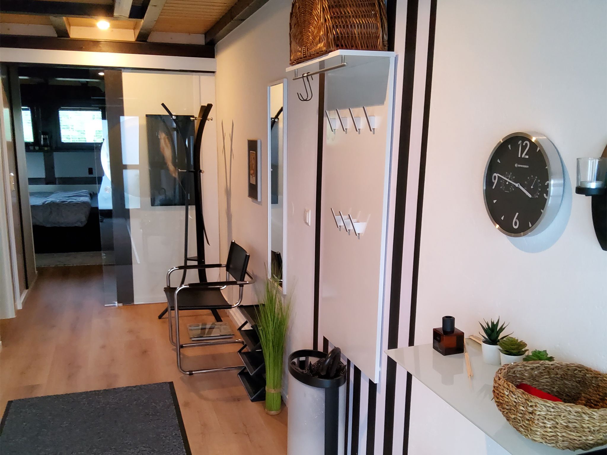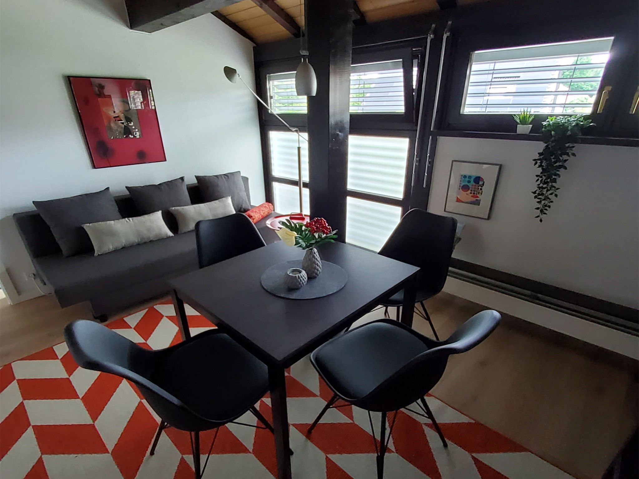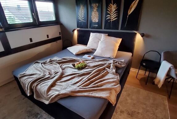 Schlafen wie im Hotel – Wohnen wie zuhause! Diese stilvoll eingerichtete Wohnung für bis zu drei Personen befindet sich im ersten Stock eines charmanten Zweifamilienholzhauses mit separatem Zugang über eine Außentreppe. Helle Räume, elegante Holzbalkendecken und Glasschiebetüren schaffen ein behagliches Wohngefühl. Das Wohn-/Schlafzimmer bietet ein hochwertiges Boxspringbett, das auch als Daybed genutzt werden kann, eine gemütliche Sitzecke, TV, DAB-Radio, Ventilator, Insektenschutz und effektive Verdunkelung. Das Ankleidezimmer überzeugt mit viel Stauraum und Extras wie Bügelbrett, Bügeleisen und Wäscheständer. Das Bad ist modern ausgestattet mit Dusche, WC, Waschtisch mit Auszügen, Kosmetikspiegel, Duschhocker und Föhn. Die großzügige Wohnküche bietet alles für den Alltag: vollständige Einbauküche mit allen Geräten, Geschirr, Nespresso-Maschine, Mikrowelle und Waschtrockner sowie eine zusätzliche Schlafcouch. Außerdem steht ein teilausgebauter Dachboden zur flexiblen Nutzung. Ob als Abstellraum, Fitnessbereich oder Homeoffice – Sie gestalten Ihren Raum individuell. Wir freuen uns auf Ihren Besuch!