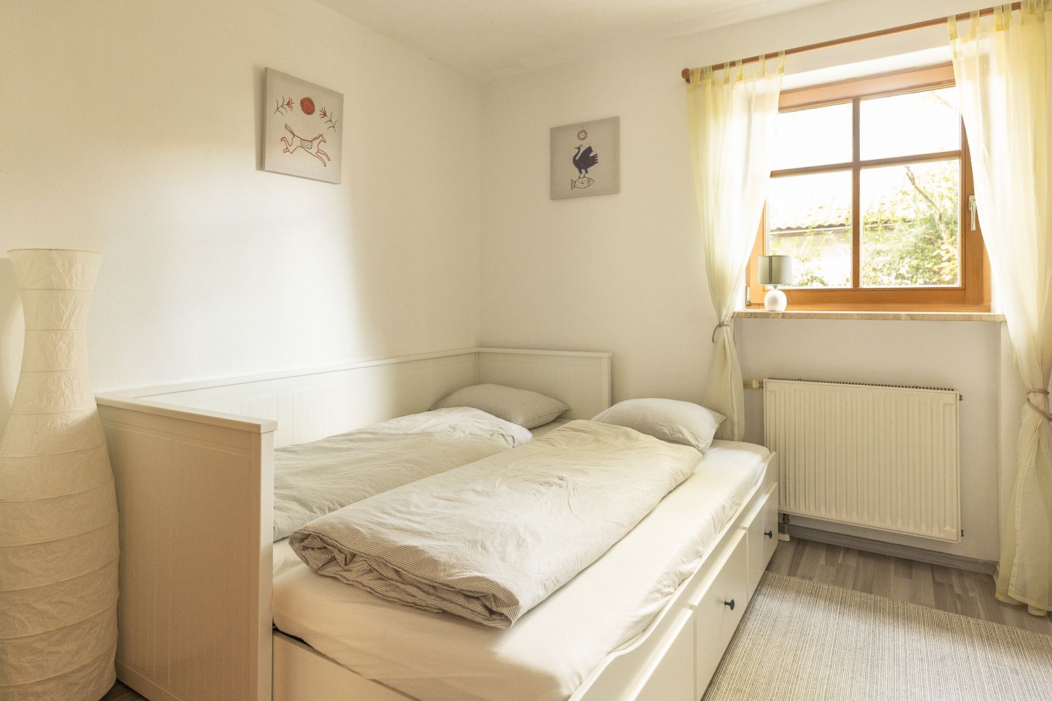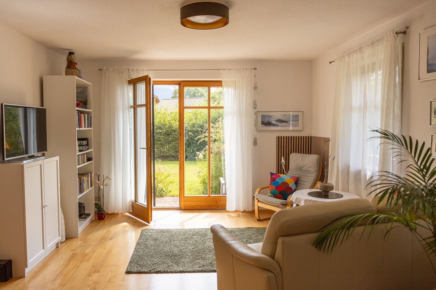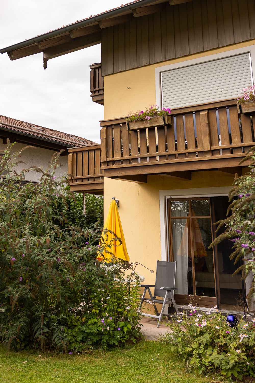 Großzügige drei Zimmer Gartenwohnung nur wenige Minuten vom Chiemseeufer in Übersee entfernt. Der Chiemseerundweg verläuft direkt vor dem Garten. Nur wenige Minuten zu Fuß an den Chiemsee, zum Bäcker oder in den traditionellen Biergarten, finden Sie im geschützten Garten dennoch Ruhe zum Entspannen oder Lesen. Der komplett ausgestattete Wohn- und Essbereich lädt mit dem elektrischen Kamin zum Verweilen ein. Daneben befindet sich eine weiter überdachte Terrasse. Das Hauptschlafzimmer ist mit einem extra breiten Bett (2 Meter) ausgestattet womit auch noch ein Kind bis 6 Jahre bei den Eltern bequem Platz hätte. Das zweite Schlafzimmer kann mit Sofa, Einzelbett oder Doppelbett konfiguriert werden. Neben dem barrierefreien Bad mit Waschmaschine, gibt es ein zusätzliches WC. Die Wohnung ist Barrierearm, allerdings sind die Tür mit 80 cm nicht Rollstuhlgerecht und es gibt einen Absatz zur Terasse und am Hauseingang. Vor dem Haus haben Sie einen eigenen Parkplatz außerdem steht ein Kanu zur freien Verfügung.