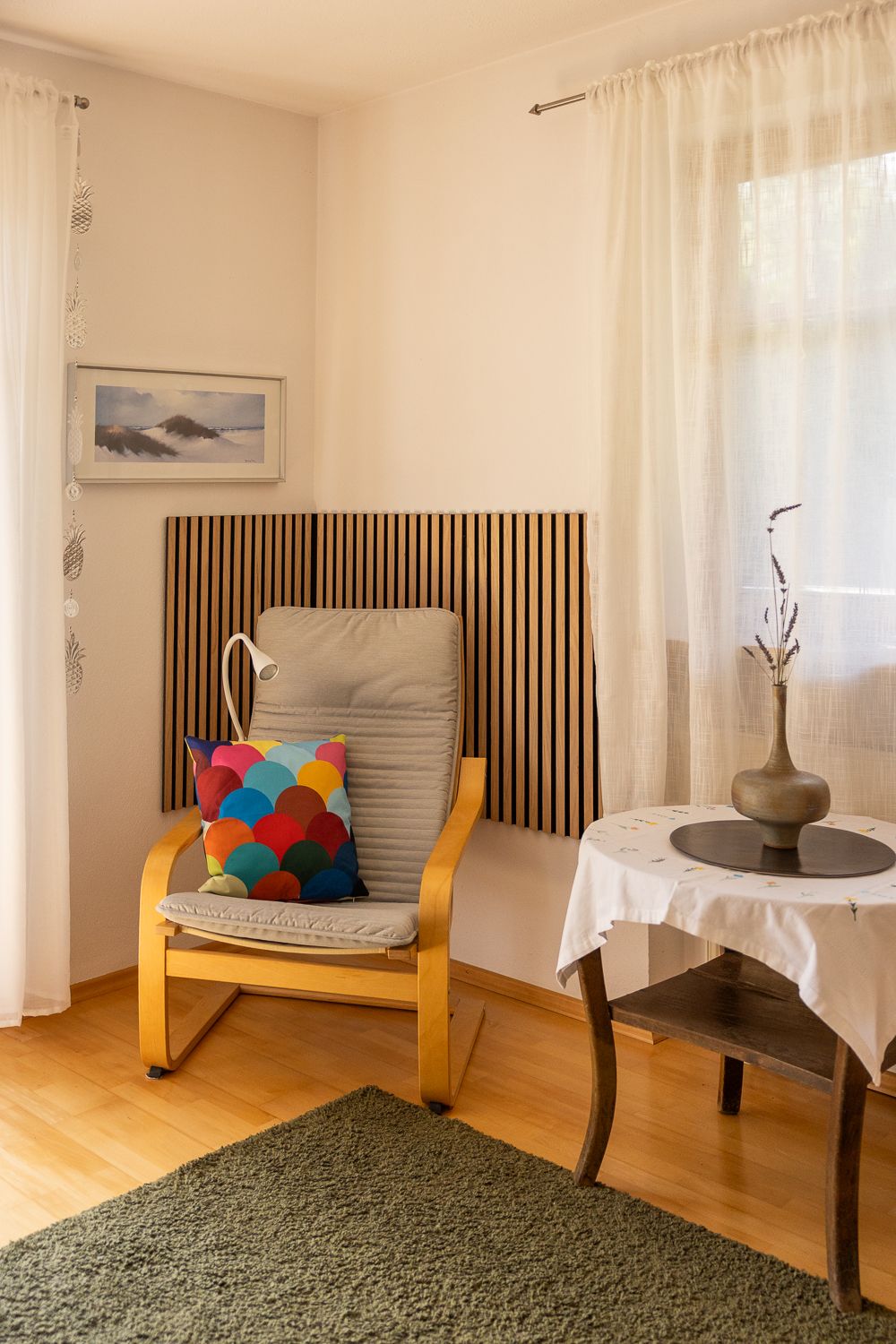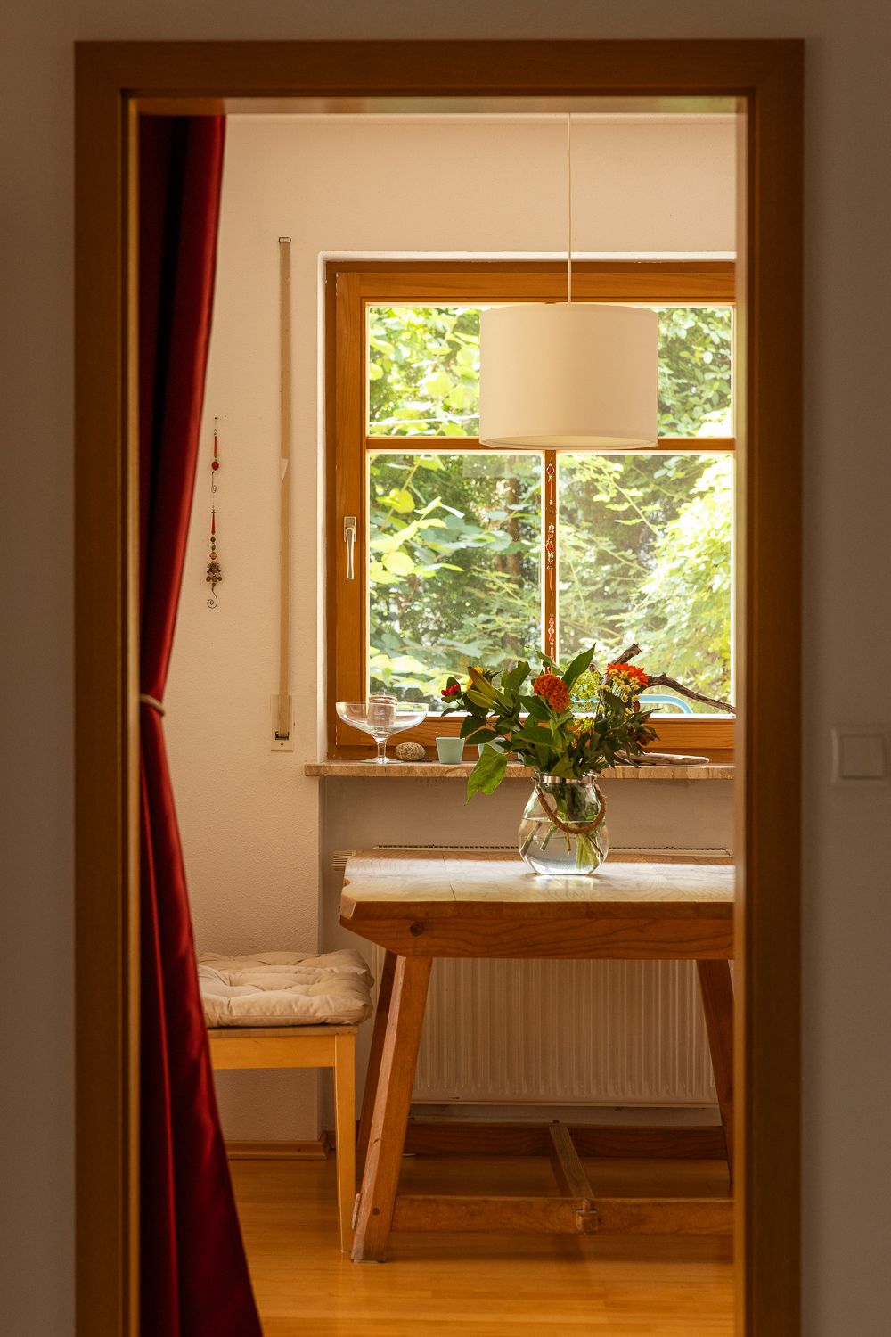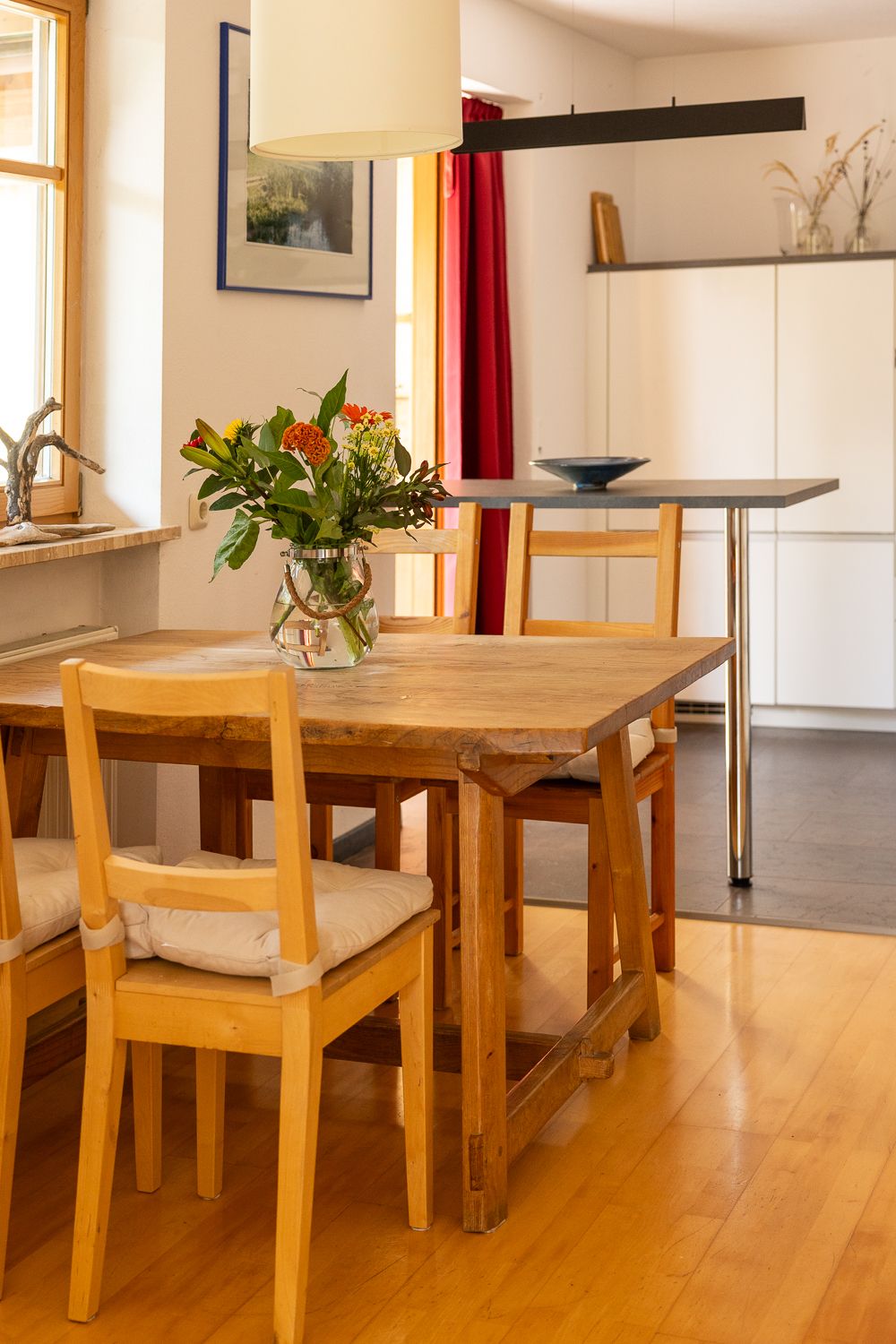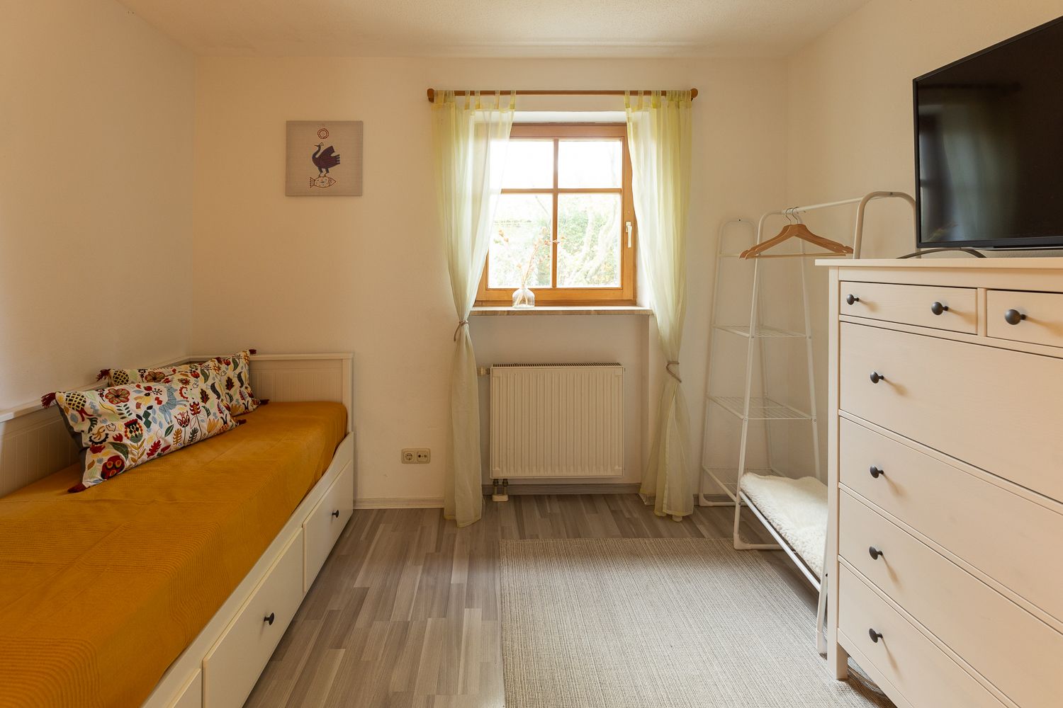 Großzügige drei Zimmer Gartenwohnung nur wenige Minuten vom Chiemseeufer in Übersee entfernt. Der Chiemseerundweg verläuft direkt vor dem Garten. Nur wenige Minuten zu Fuß an den Chiemsee, zum Bäcker oder in den traditionellen Biergarten, finden Sie im geschützten Garten dennoch Ruhe zum Entspannen oder Lesen. Der komplett ausgestattete Wohn- und Essbereich lädt mit dem elektrischen Kamin zum Verweilen ein. Daneben befindet sich eine weiter überdachte Terrasse. Das Hauptschlafzimmer ist mit einem extra breiten Bett (2 Meter) ausgestattet womit auch noch ein Kind bis 6 Jahre bei den Eltern bequem Platz hätte. Das zweite Schlafzimmer kann mit Sofa, Einzelbett oder Doppelbett konfiguriert werden. Neben dem barrierefreien Bad mit Waschmaschine, gibt es ein zusätzliches WC. Die Wohnung ist Barrierearm, allerdings sind die Tür mit 80 cm nicht Rollstuhlgerecht und es gibt einen Absatz zur Terasse und am Hauseingang. Vor dem Haus haben Sie einen eigenen Parkplatz außerdem steht ein Kanu zur freien Verfügung.