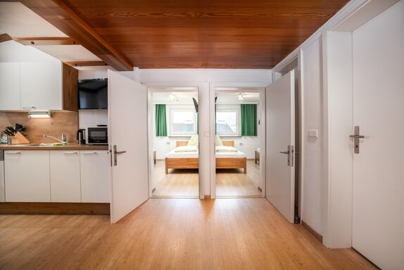 2 separate Schlafzimmer mit jeweils einem Doppelbett sowie einem Einzelbett