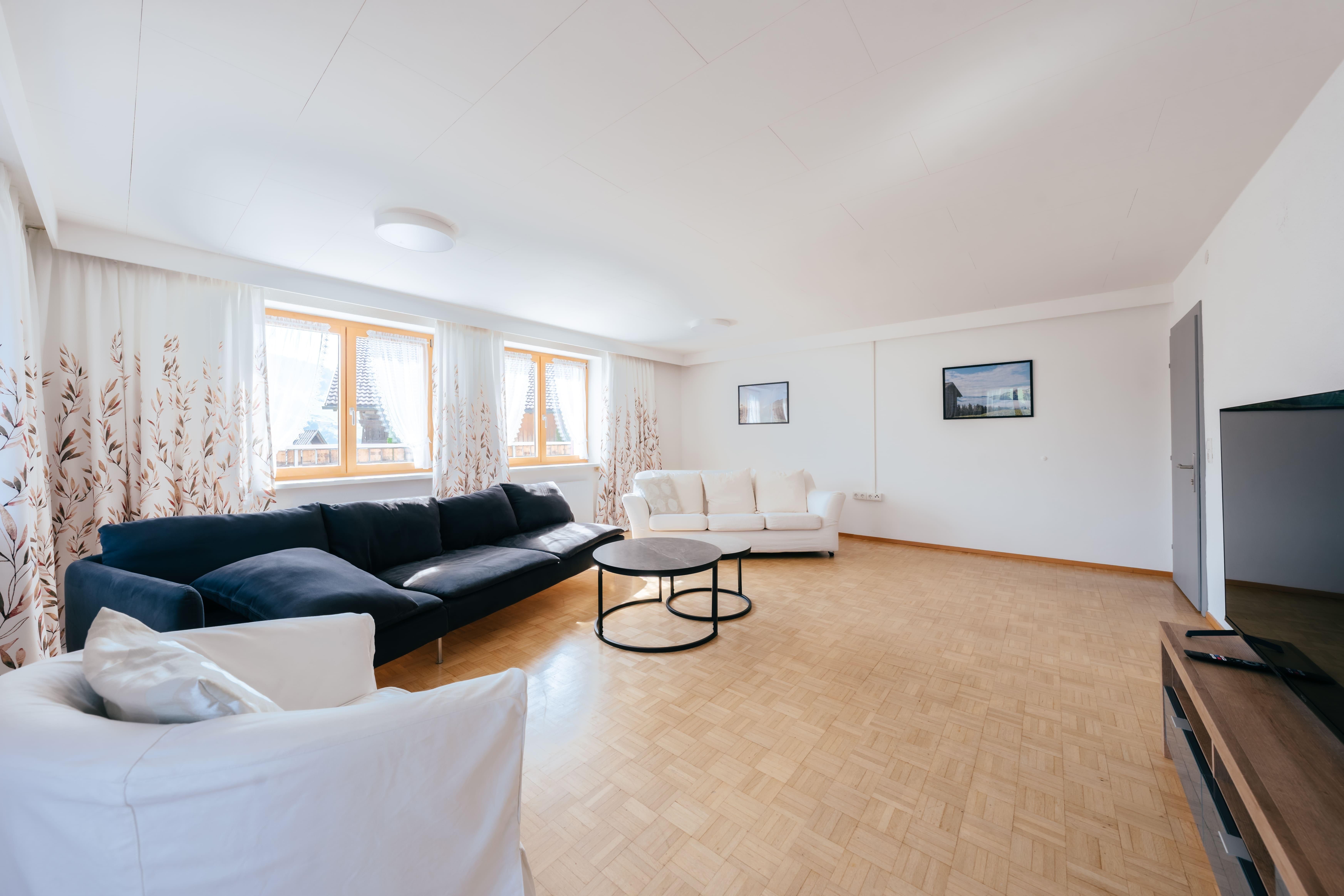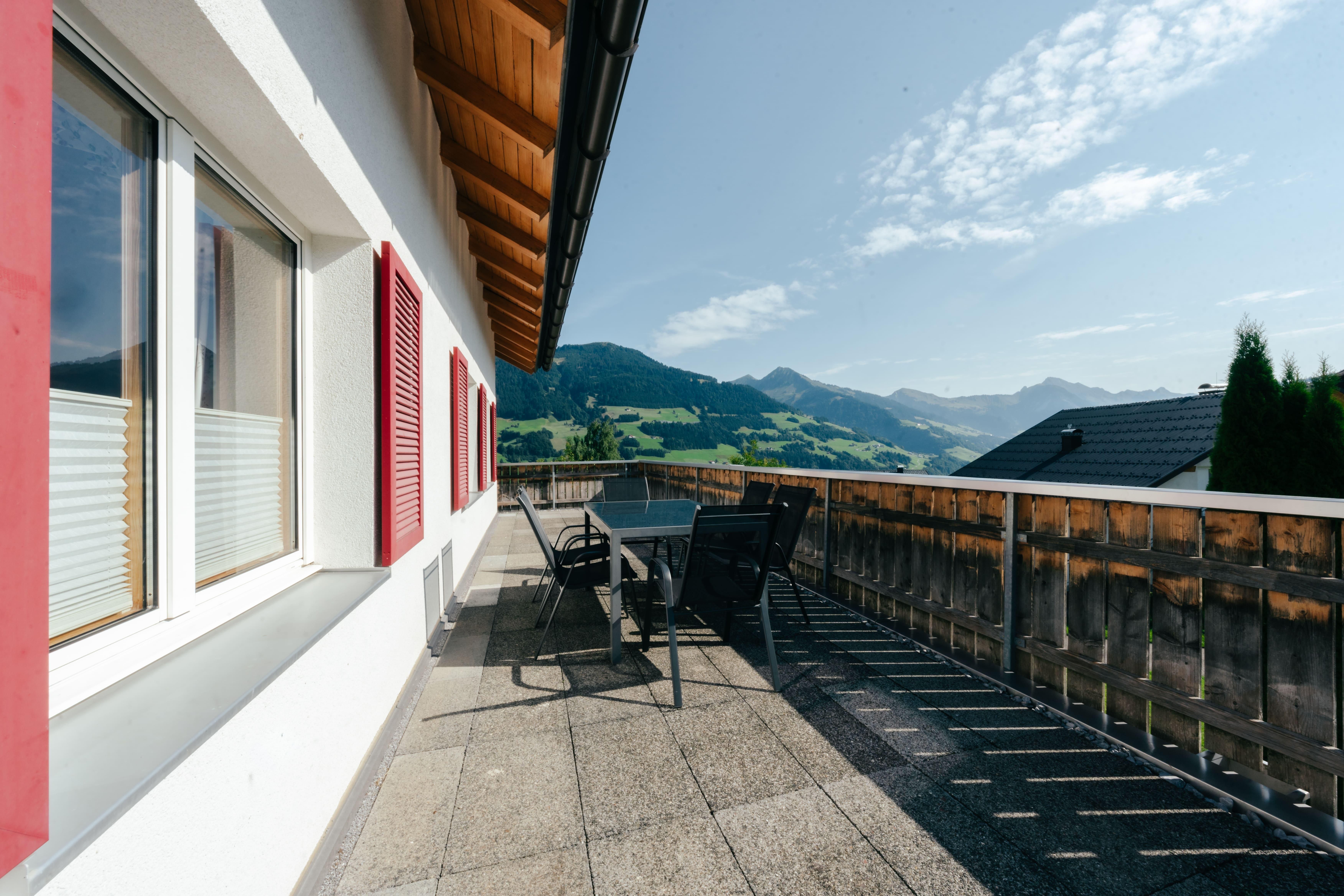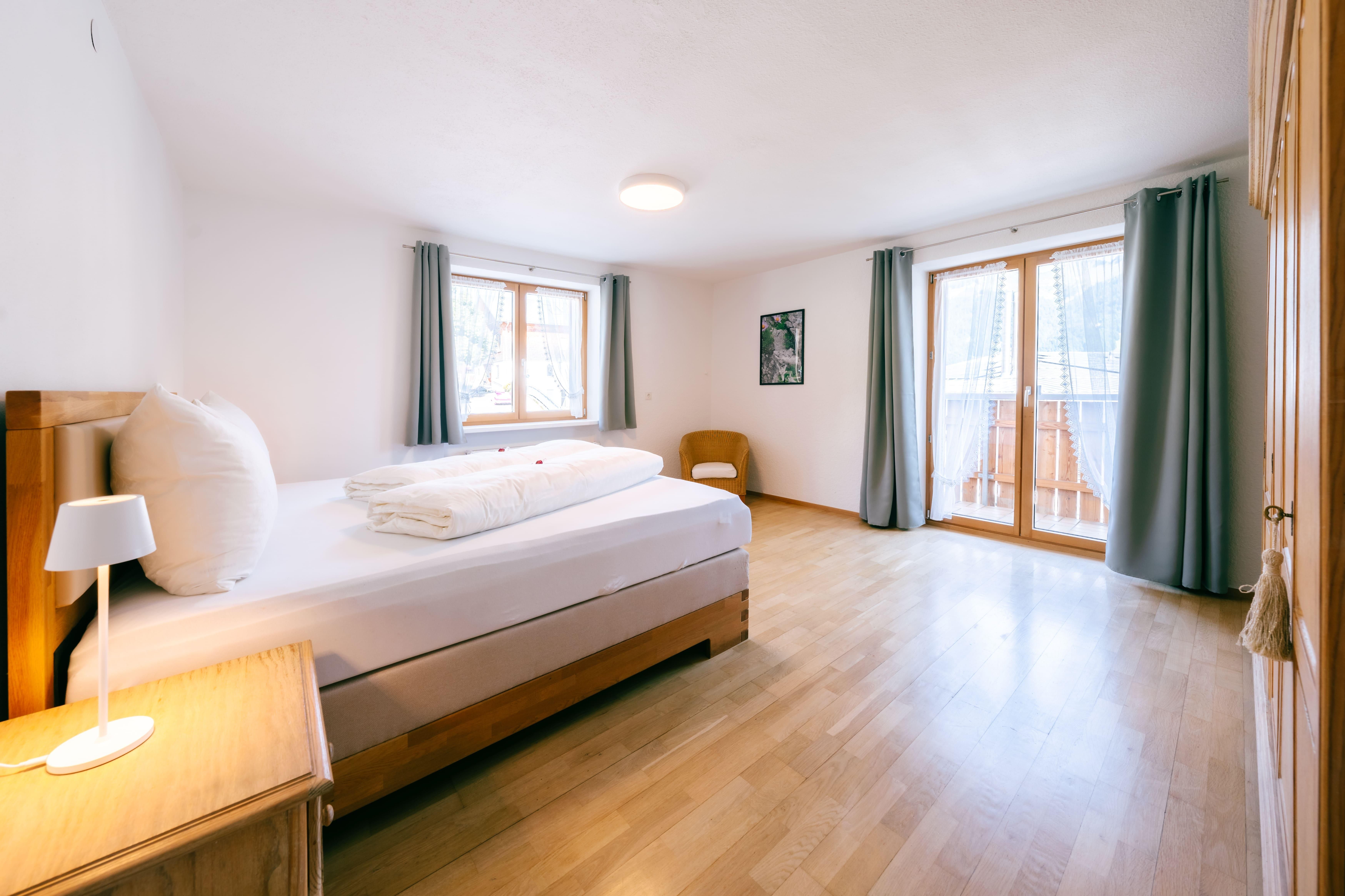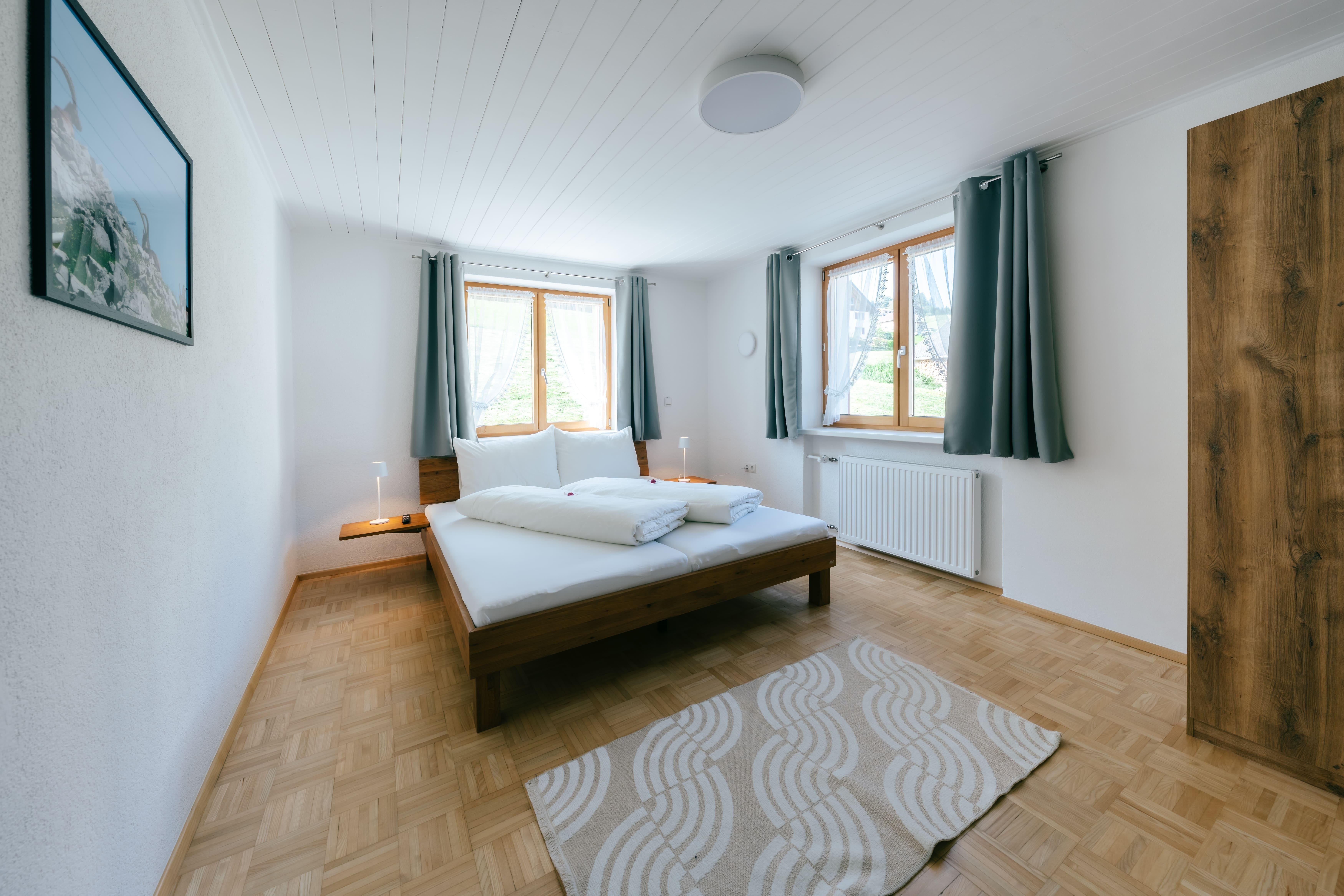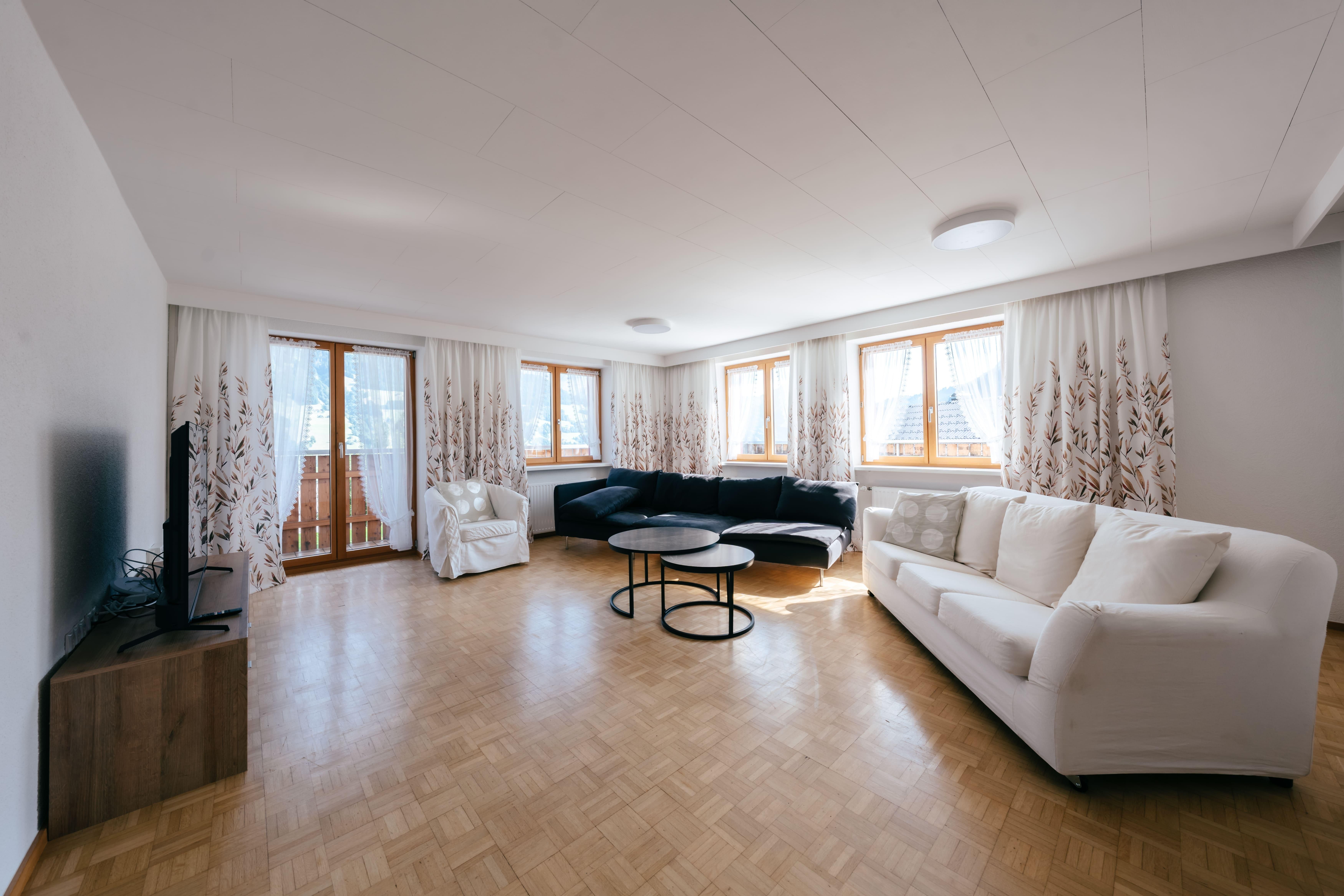 Die Wohnung verfügt über 5 gemütliche Schlafzimmer, ein einladendes Wohnzimmer sowie eine große Terrasse und Balkone, die sich über drei Hausseiten erstrecken. Genießen Sie hier die herrliche Ruhe, frische Bergluft und den Blick in die Natur.