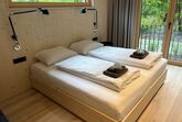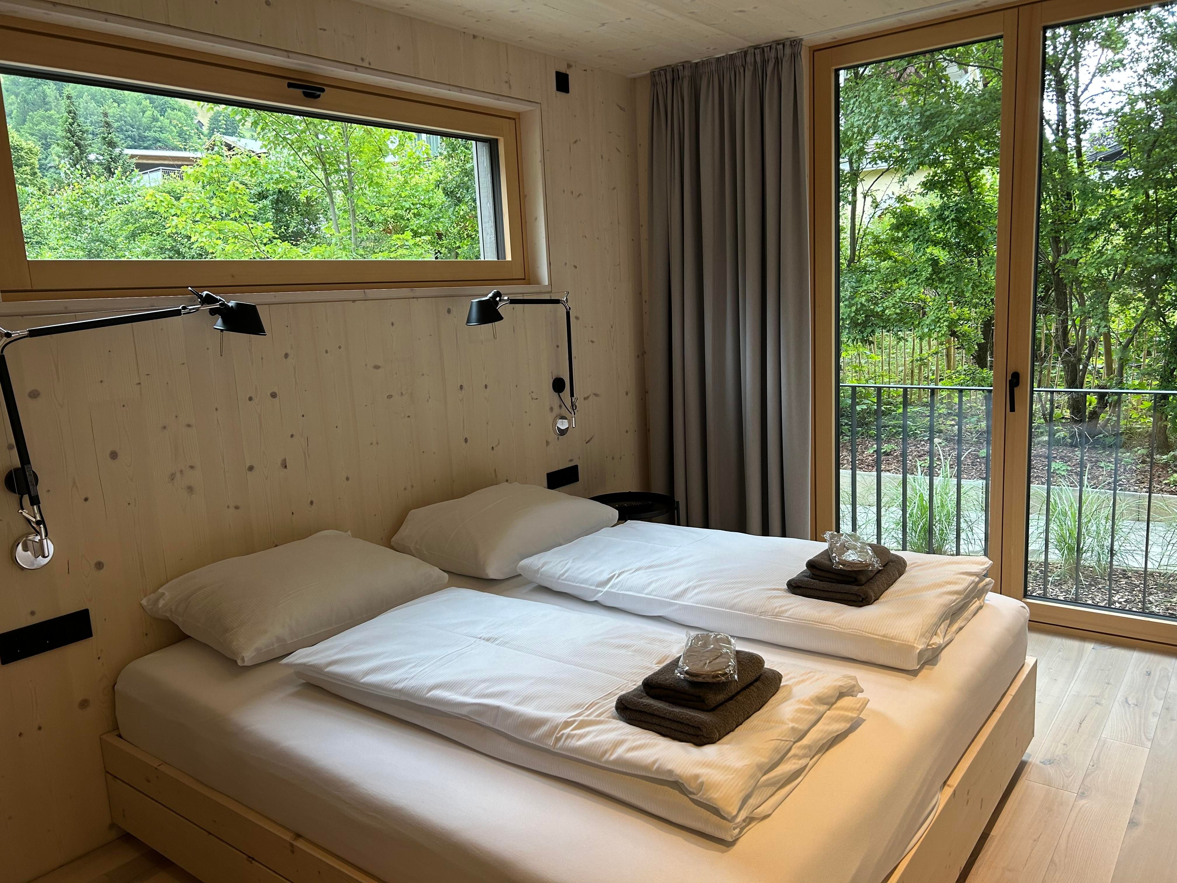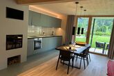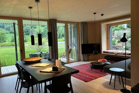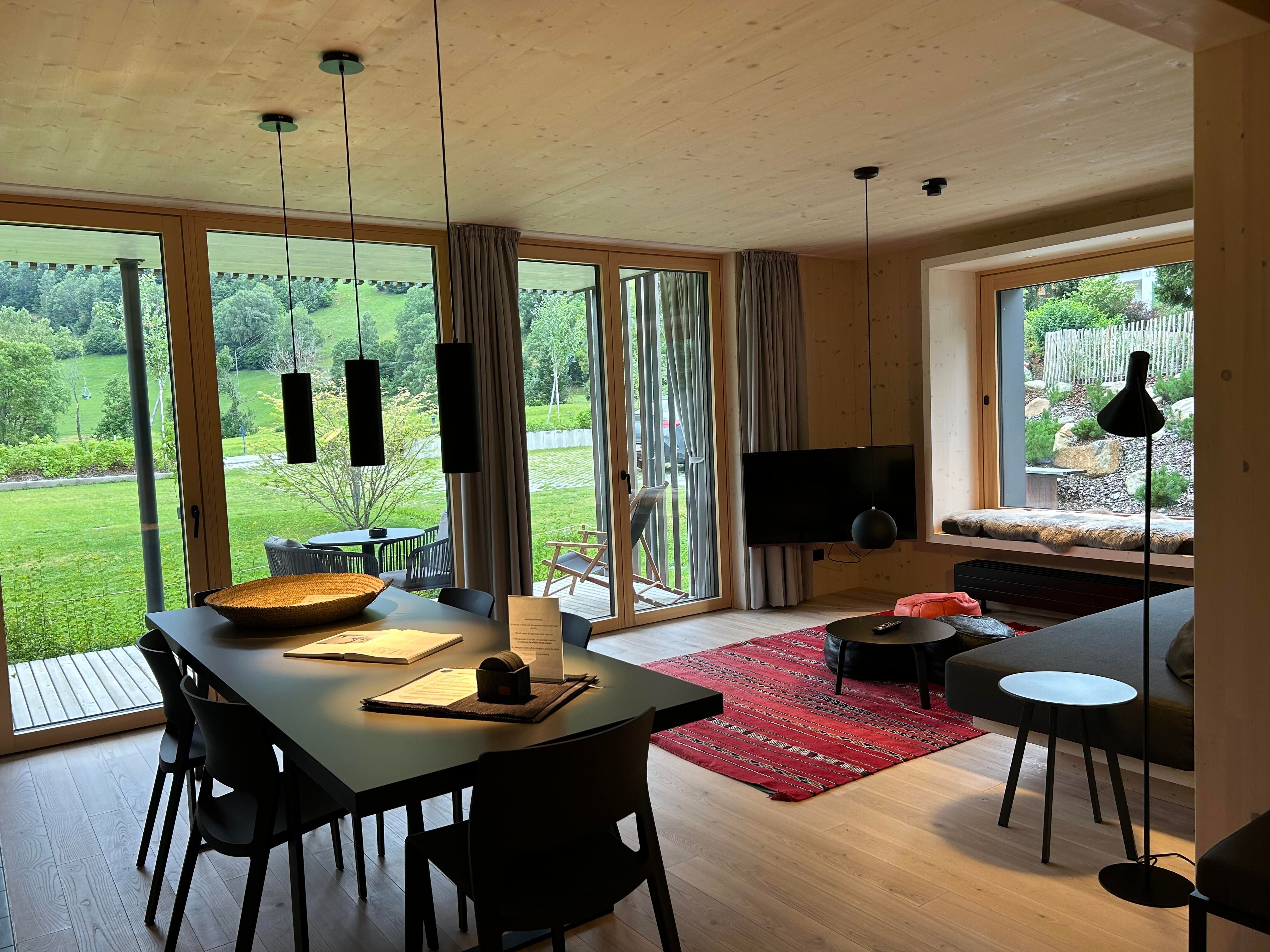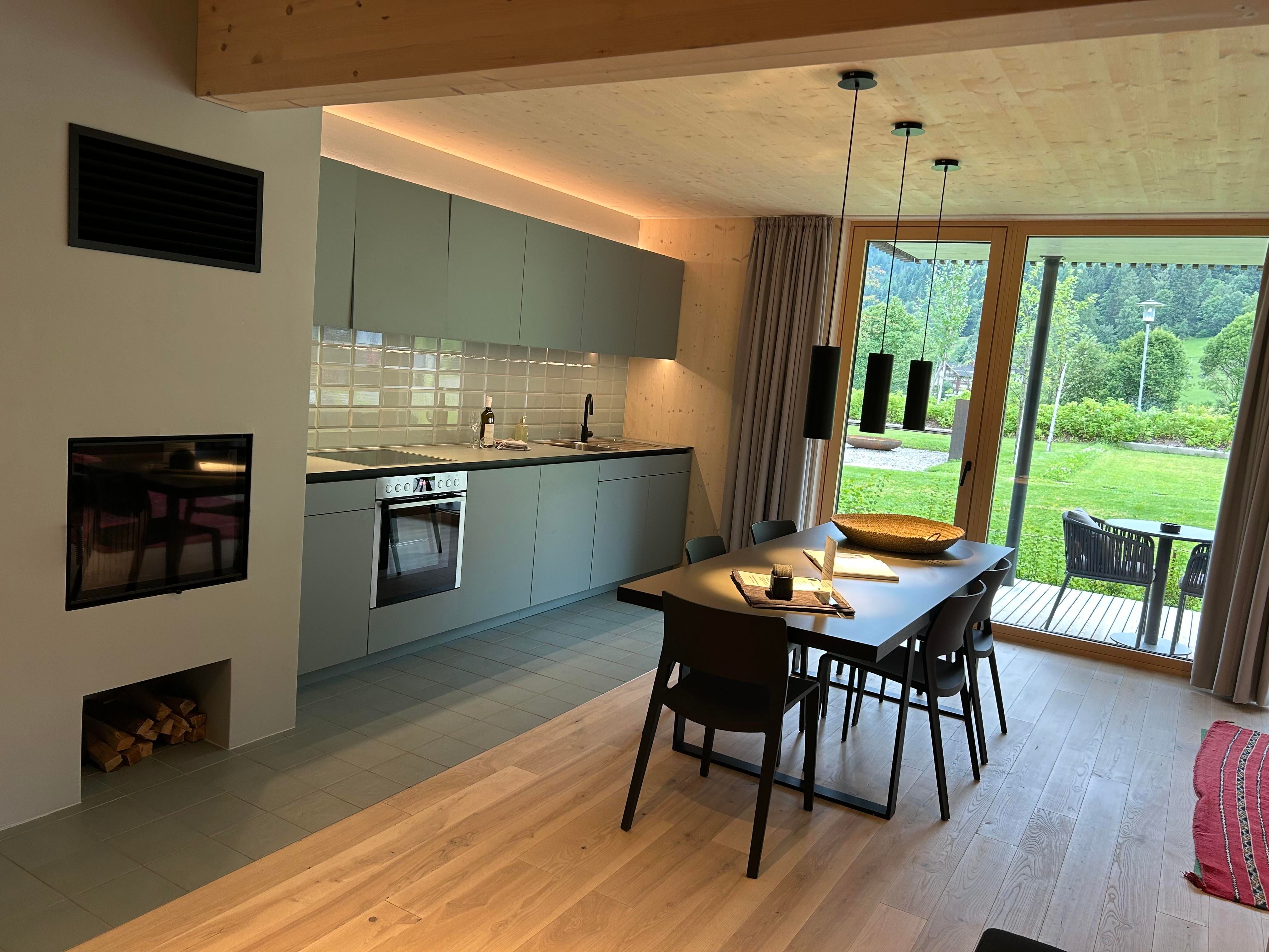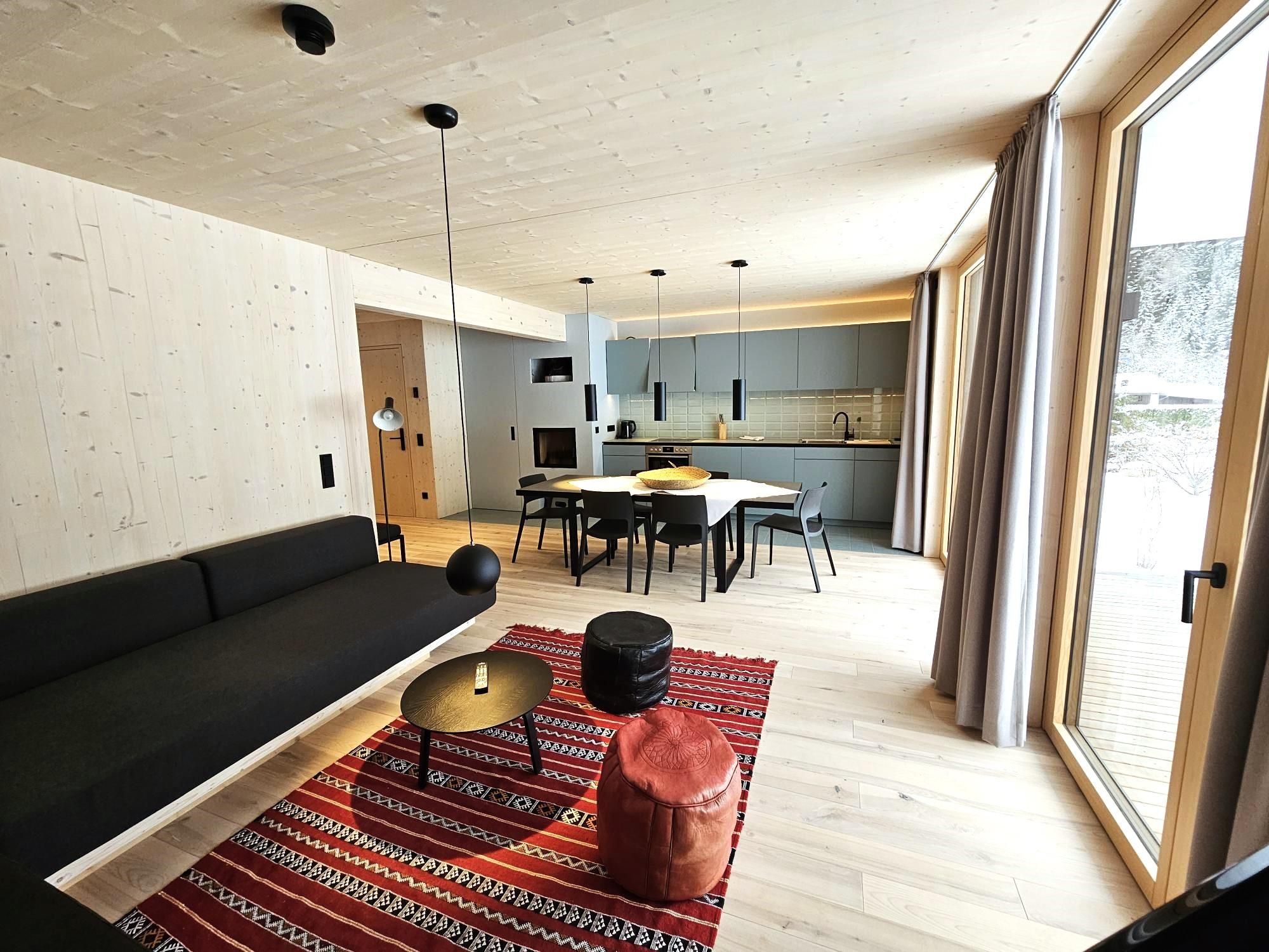 Das Interior-Design der Wohnbereiche ist in warmen Erdtönen gehalten und mit natürlichen Materialien gestaltet. Boden, Decke und Fenster sind in Echtholz ausgeführt. Die Küchennische ist in frischem Quellwassergrün gehalten und öffnet sich einladend zum Wohnbereich. Ein Kaminofen sorgt bei kühlen Temperaturen für behagliches Knistern.
