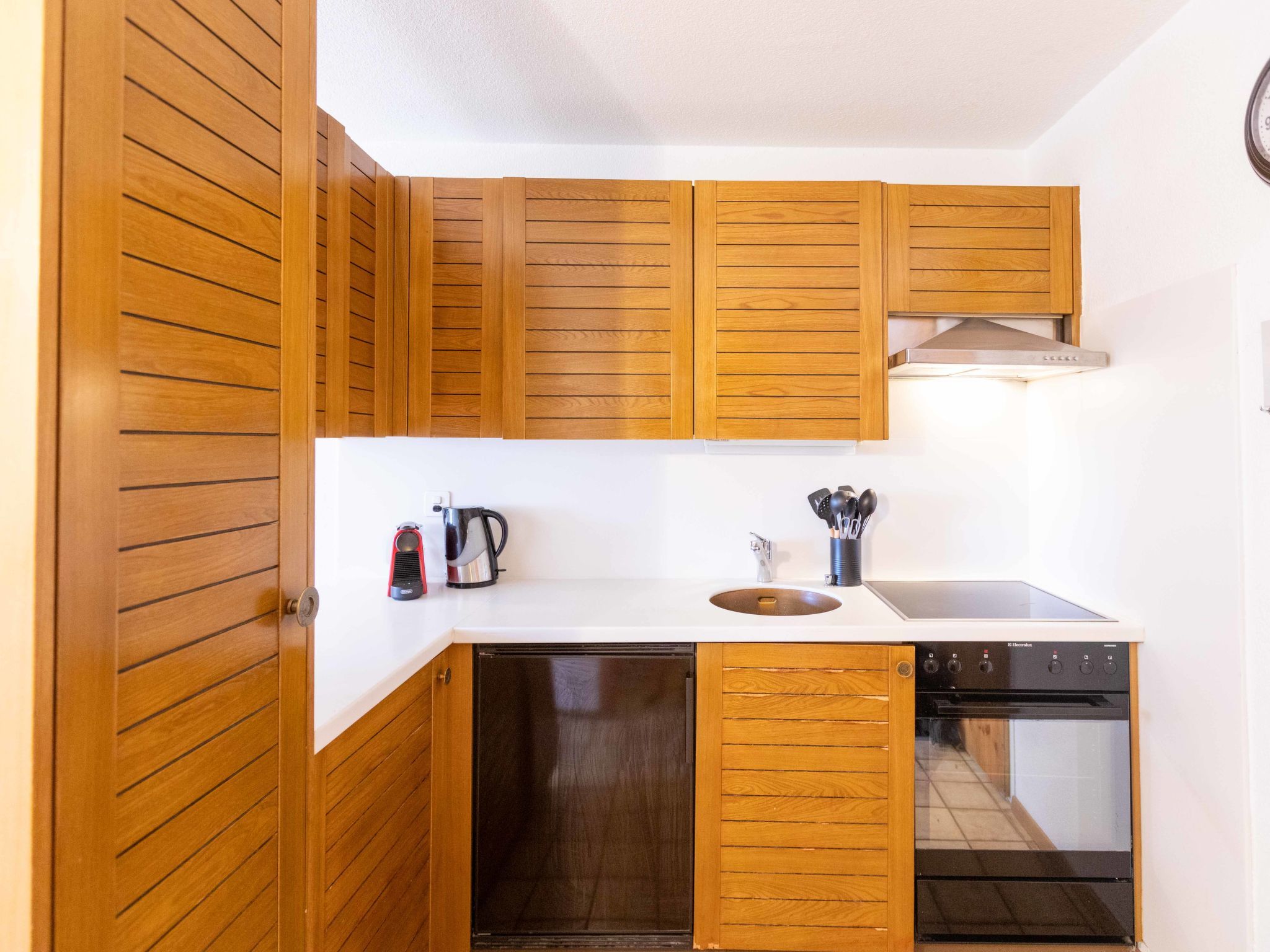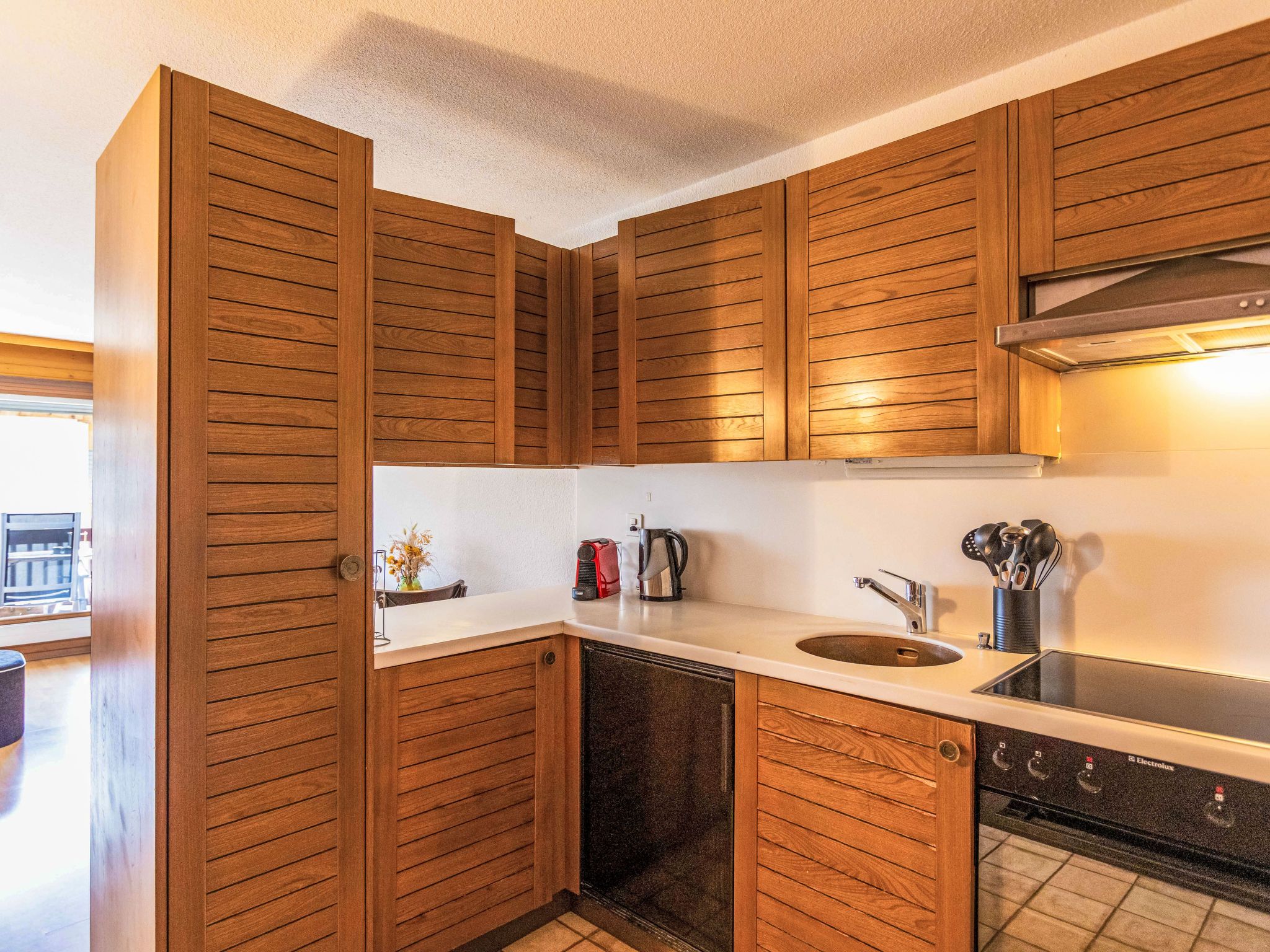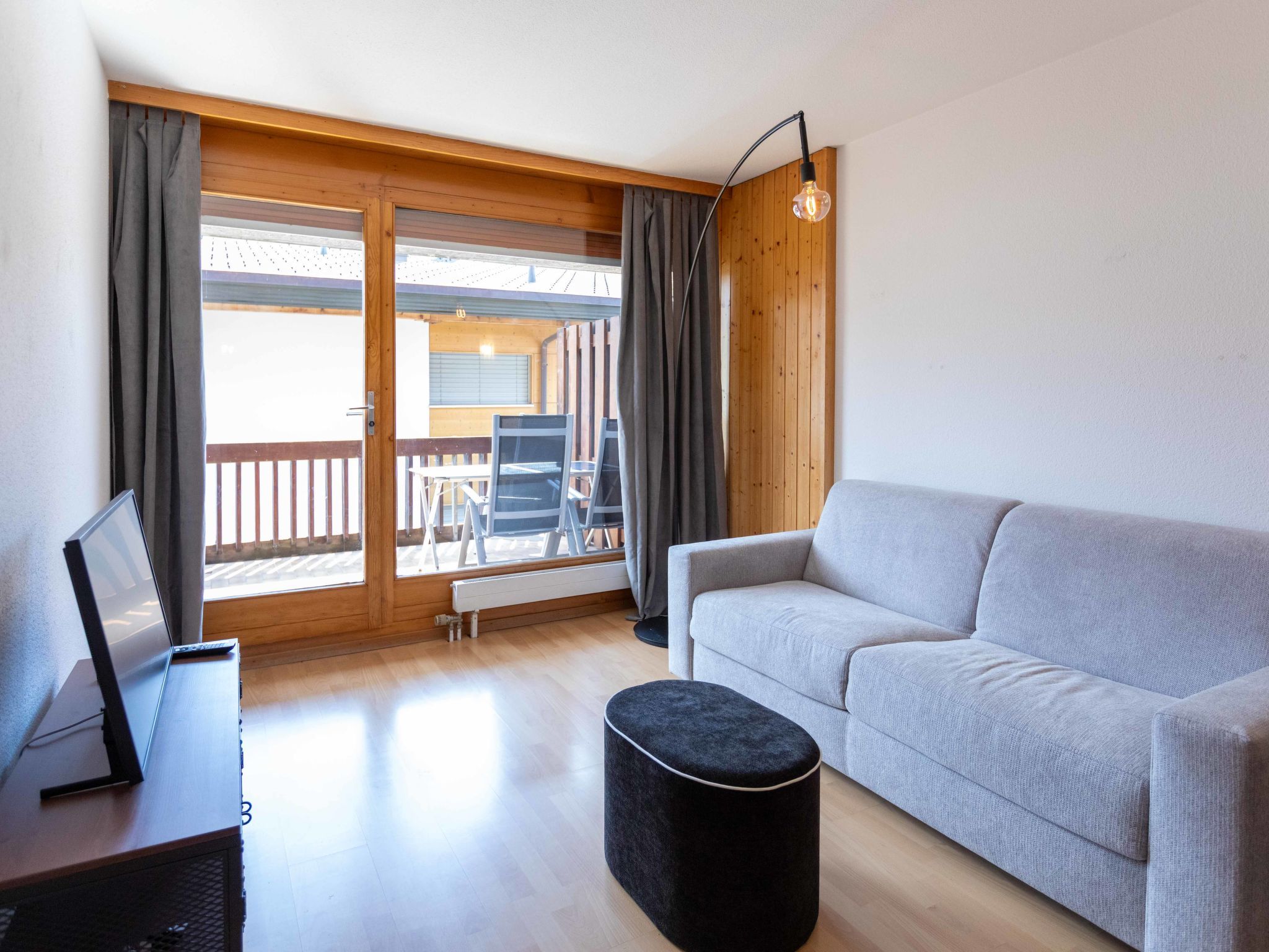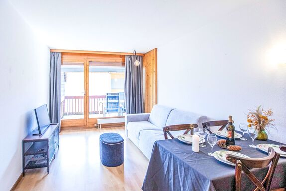 Les Dryades 6, 2-Zimmer-Wohnung 40 m2 im 1. Stock, Südlage. Zweckmässig und komfortabel eingerichtet: Wohn-/Esszimmer mit Esstisch und TV (Flachbildschirm). Ausgang zum Balkon, Richtung Süden. 1 Zimmer mit 1 franz. Bett (1 x 160 cm, Länge 200 cm). Kleine Küche im Eingang (Backofen, 4 Glaskeramikplatten, Toaster, Wasserkocher, elektrische Kaffeemaschine, Kapseln für die Kaffeemaschine (Nespresso) extra, Racletteofen, Fondue Set (Chinoise, Käse)). Bad/WC. Kleiner Balkon, Südlage. Balkonmöbel. Seitliche Sicht. Zur Verfügung: Haartrockner. Internet (WLAN, gratis). Bitte beachten: Nichtraucher-Unterkunft, kein Parkplatz.