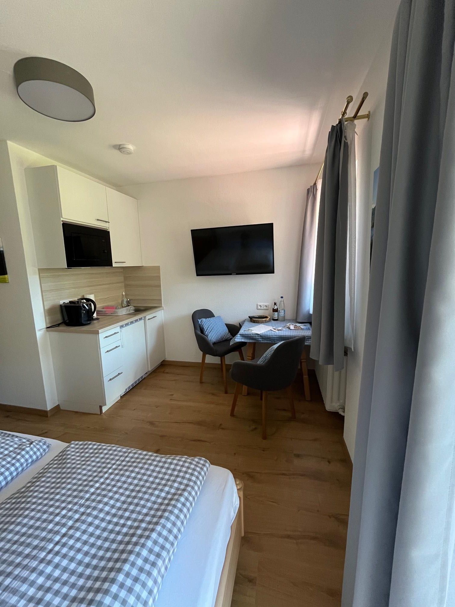 Das Studio im ersten Stock (30m²) für 2 Personen bietet ein gemütliches Doppelbett, TV, WLAN, großen Schrank, Balkon mit Sitzgelegenheit, Kochnische mit Sitzecke und ein modernes Bad mit Dusche/WC. Die Küchenzeile ist komplett ausgestattet mit elektrischem Kochfeld, Wasserkocher, Kaffeemaschine, Mikrowelle sowie Geschirr und Kochutensilien. Ein gemeinschaftlicher Waschtrockner steht im 1. Stock zur Verfügung.