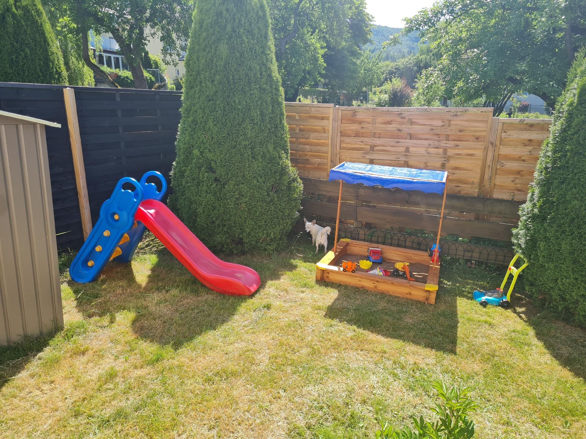 Draußen lädt ein großzügig angelegter Garten zur alleinigen Nutzung ein, der durch einen Zaun sicher für Ihre vierbeinigen Freunde eingegrenzt ist. Eine Terrasse bietet den idealen Ort für entspannte Stunden im Freien. Besonders hervorzuheben ist zudem der Spielplatz im Garten, der kleine Gäste zu herrlichen Spielmomenten im Freien einlädt.