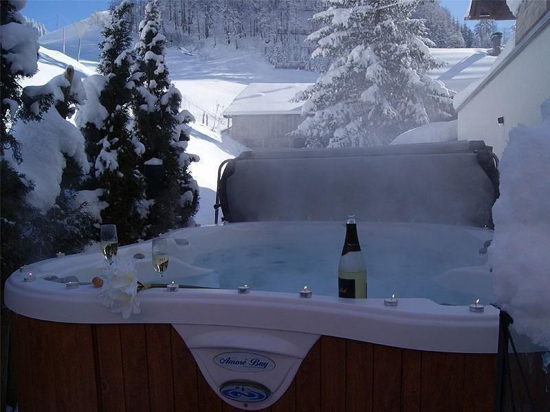 Die einzelnen Balkone sind mit Gartenmöbeln zu einer Mahlzeit im Freien möbliert, wobei Sie die herrliche Aussicht ins Tal genießen können. Der Außenwhirlpool und eine Liegewiese mit Grillplatz runden den Außenbereich ab.