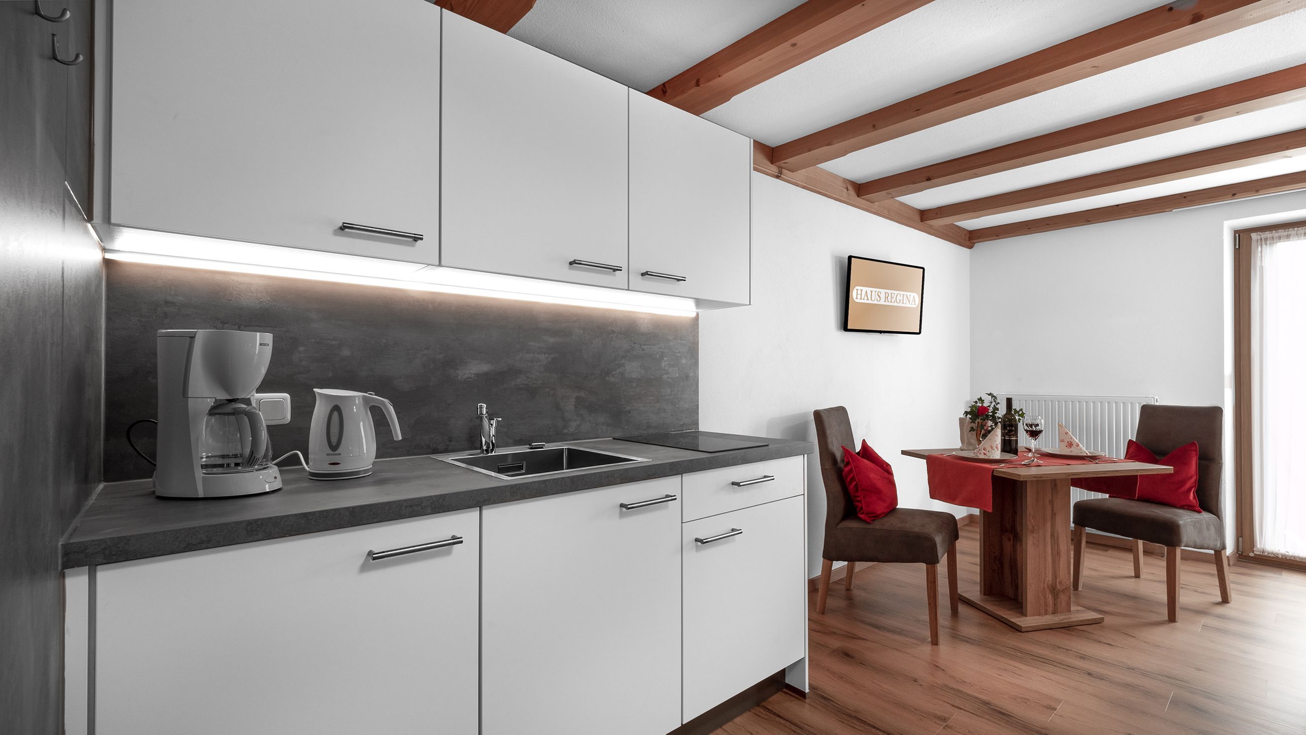 Die Ferienwohnungen befinden sich im 1. und 2. Stock unseres Hauses. Die Küchen sind gut ausgestattet, Bettwäsche und Handtücher werden von uns bereitgestellt.