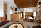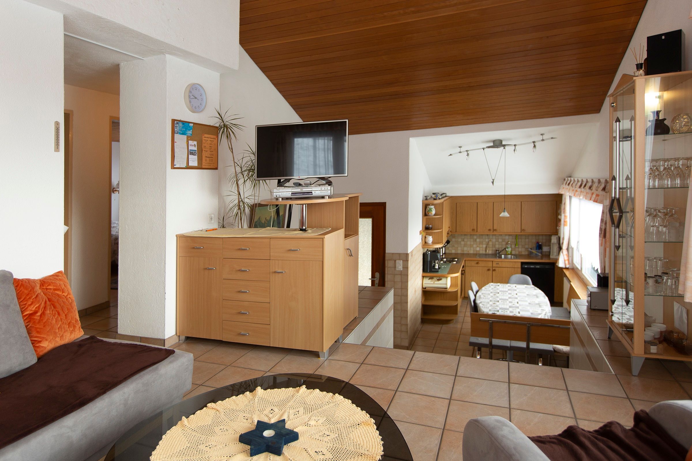 Im Wohnzimmer befindet sich ein TV-Gerät. WLAN ist vorhanden.