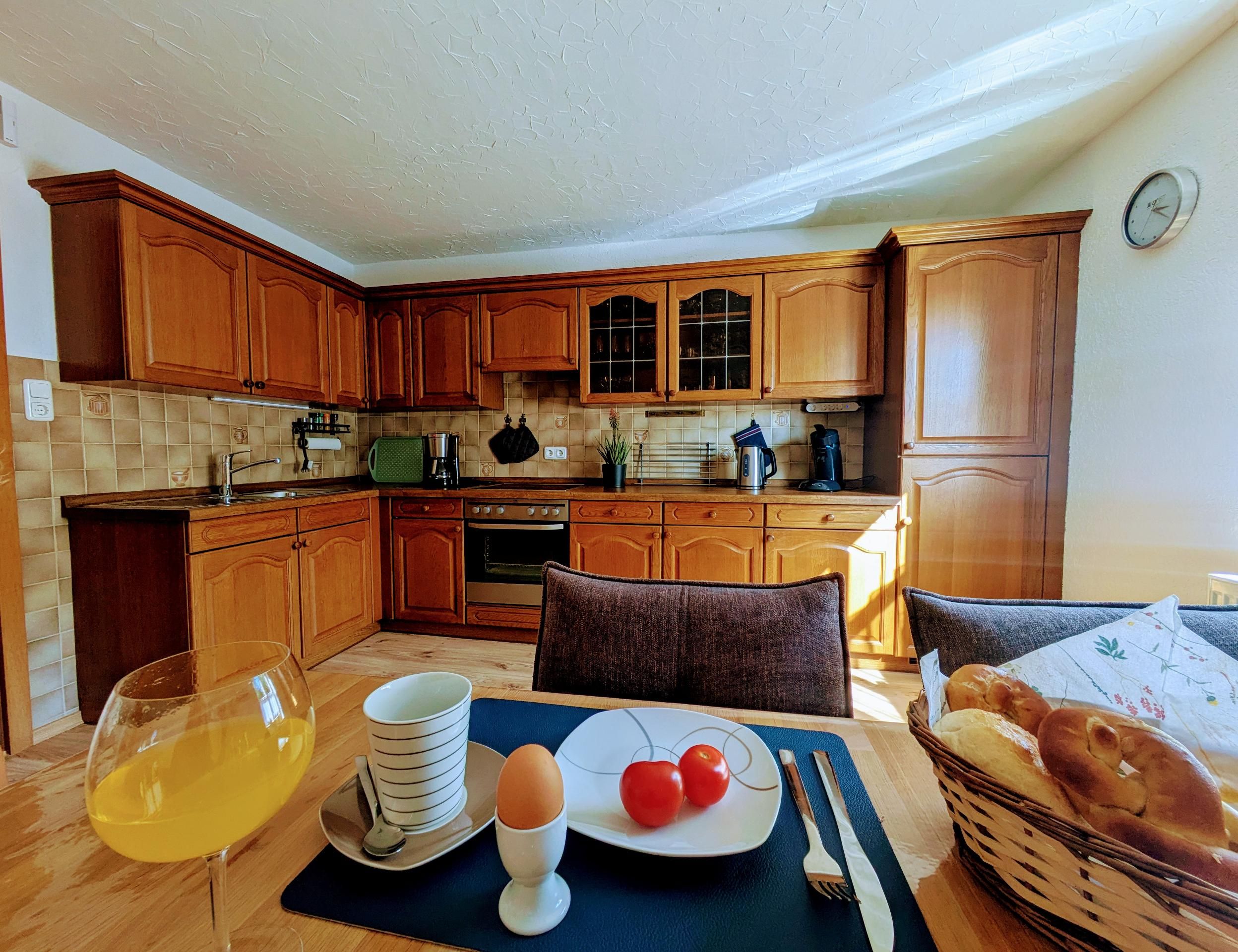 Die voll ausgestattete Küche lässt keine Wünsche offen: Ein E-Herd mit Ceranfeld, ein Kühlschrank mit Gefrierfach, eine Filter- und eine Senseo-Kaffeemaschine, eine Brotmaschine, ein Toaster sowie ein Wasserkocher stehen für Sie bereit.