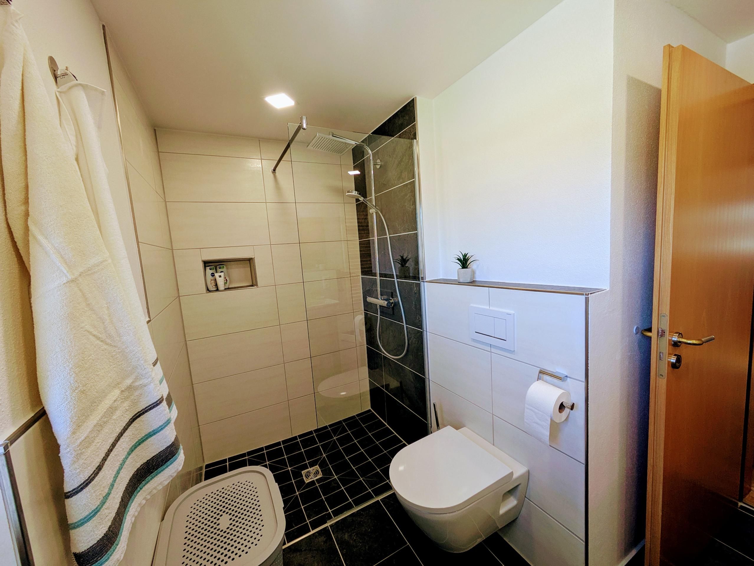 Das moderne Badezimmer verfügt über eine großzügige Dusche sowie eine Waschmaschine.