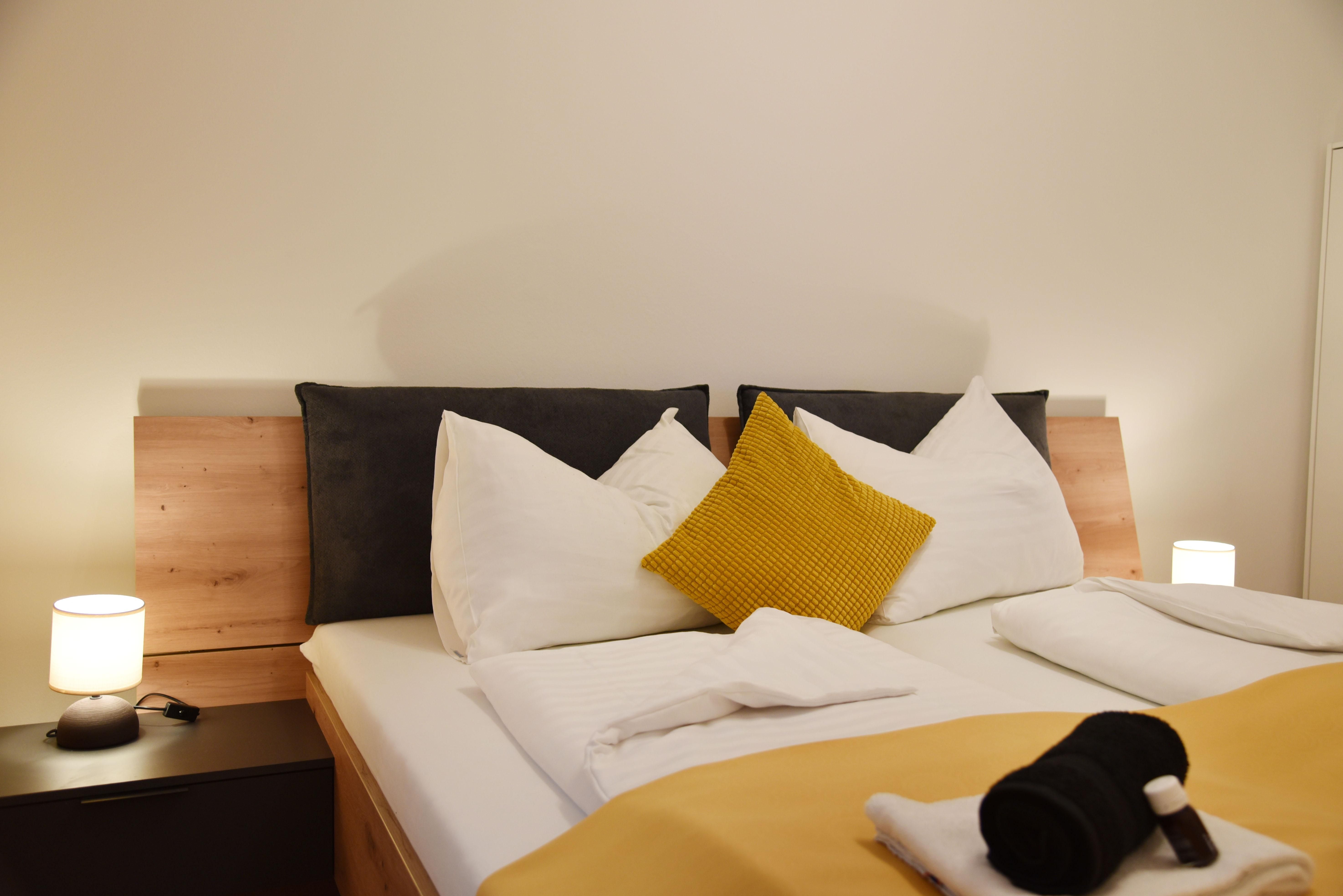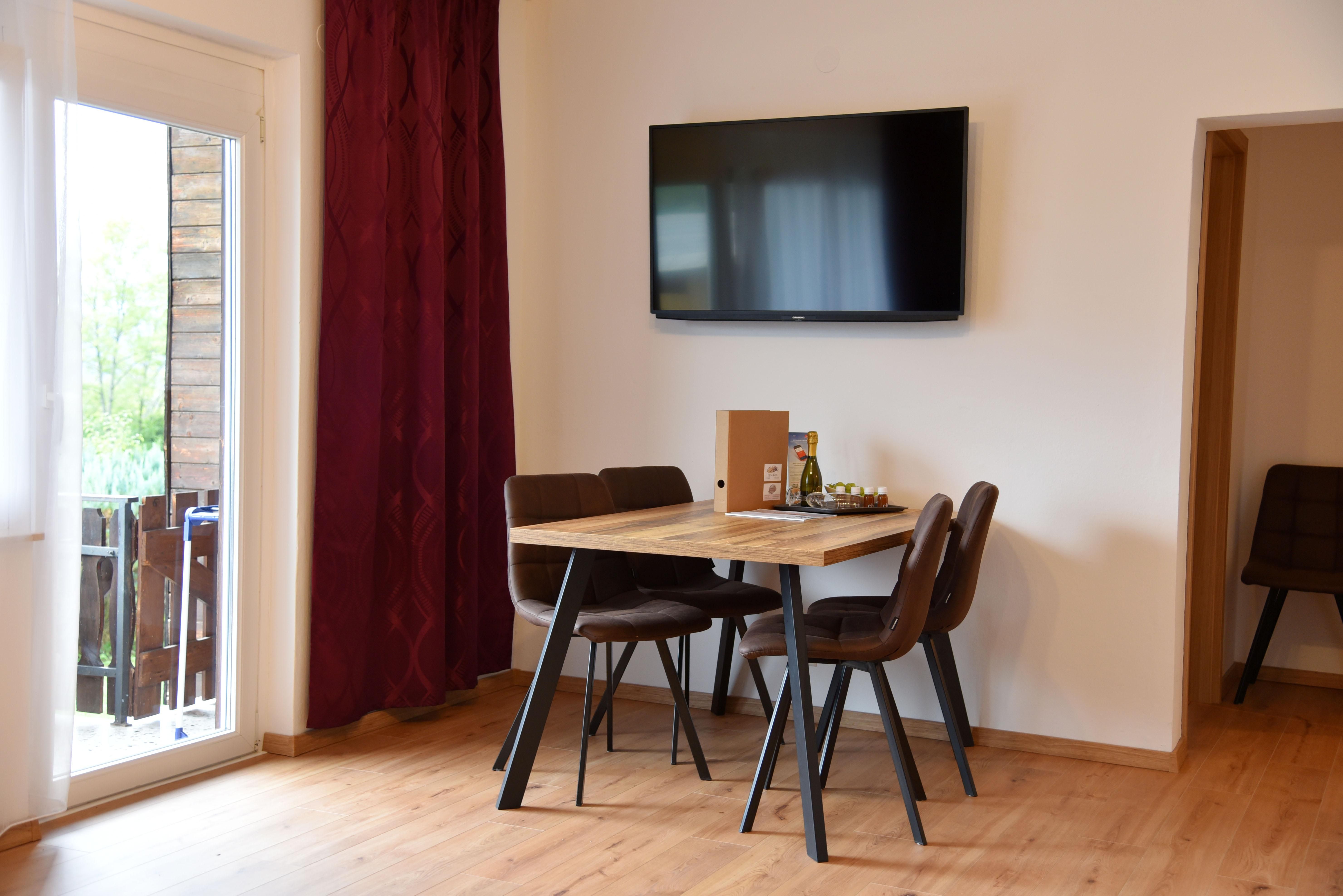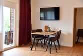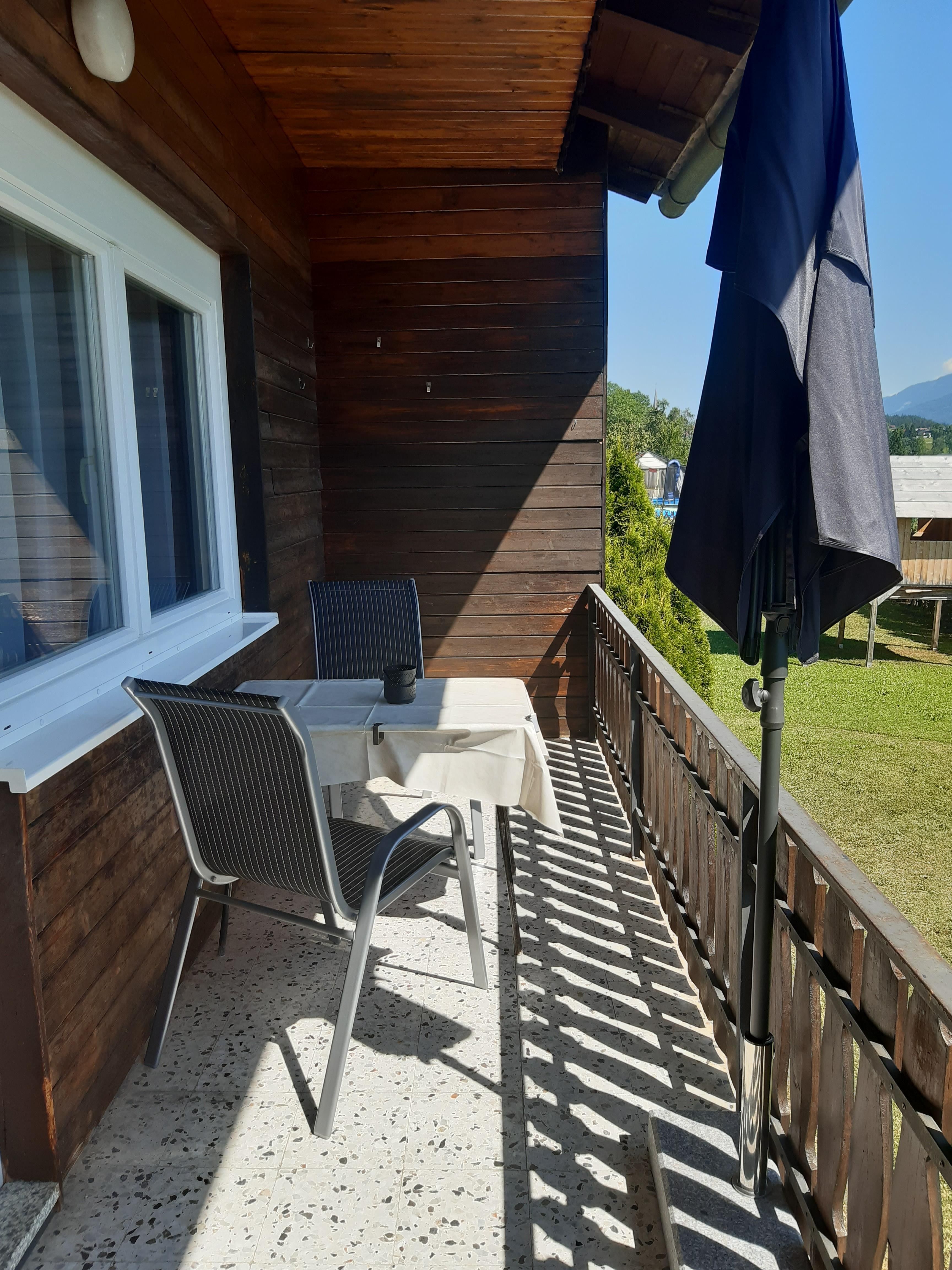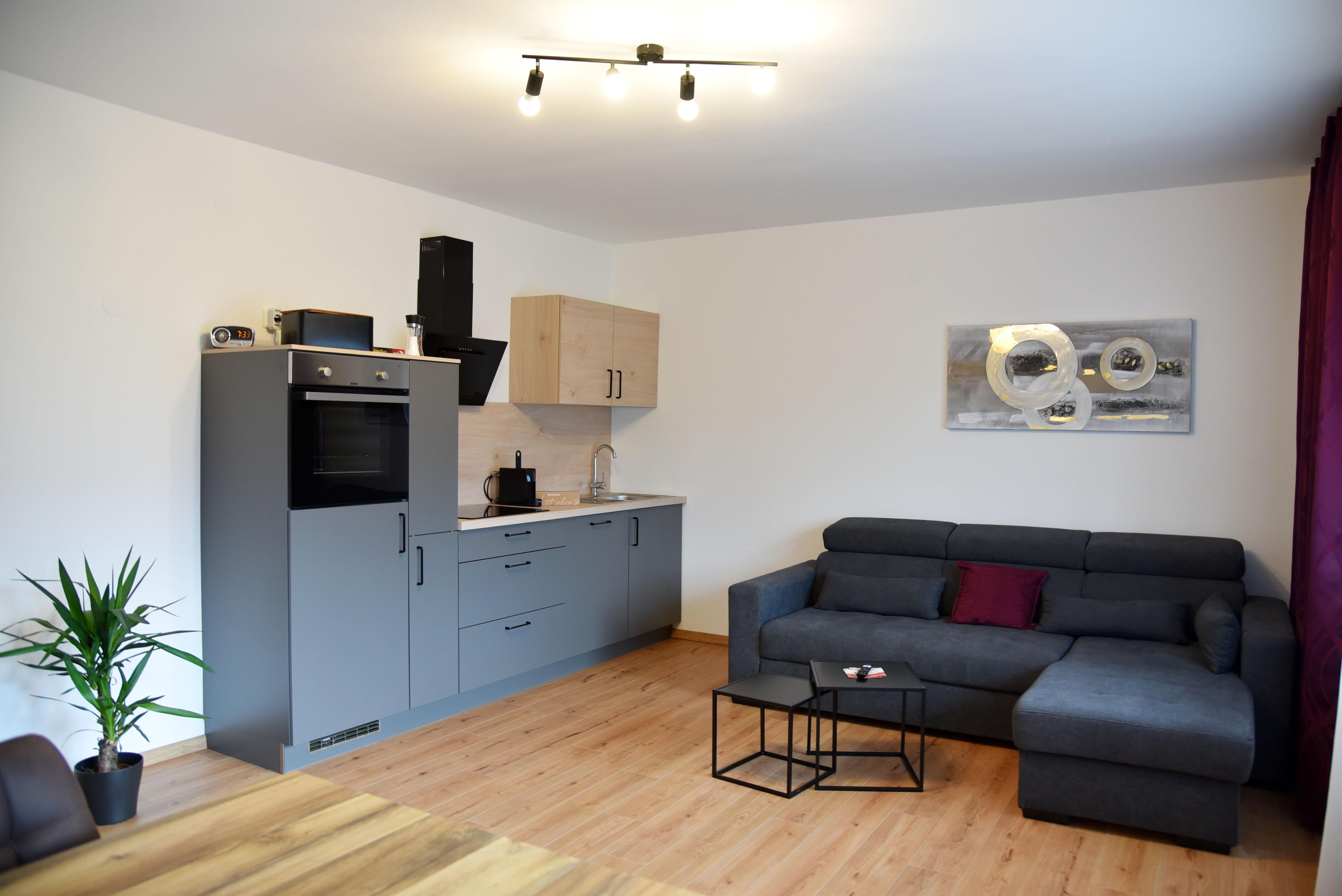 Es bietet einen Küchen-Wohnraum mit ausziebarer Couch, 2 Schlafzimmer mit Doppelbett und Kasten, Dusche mit Infrarotkabine, separates WC und einen Balkon.