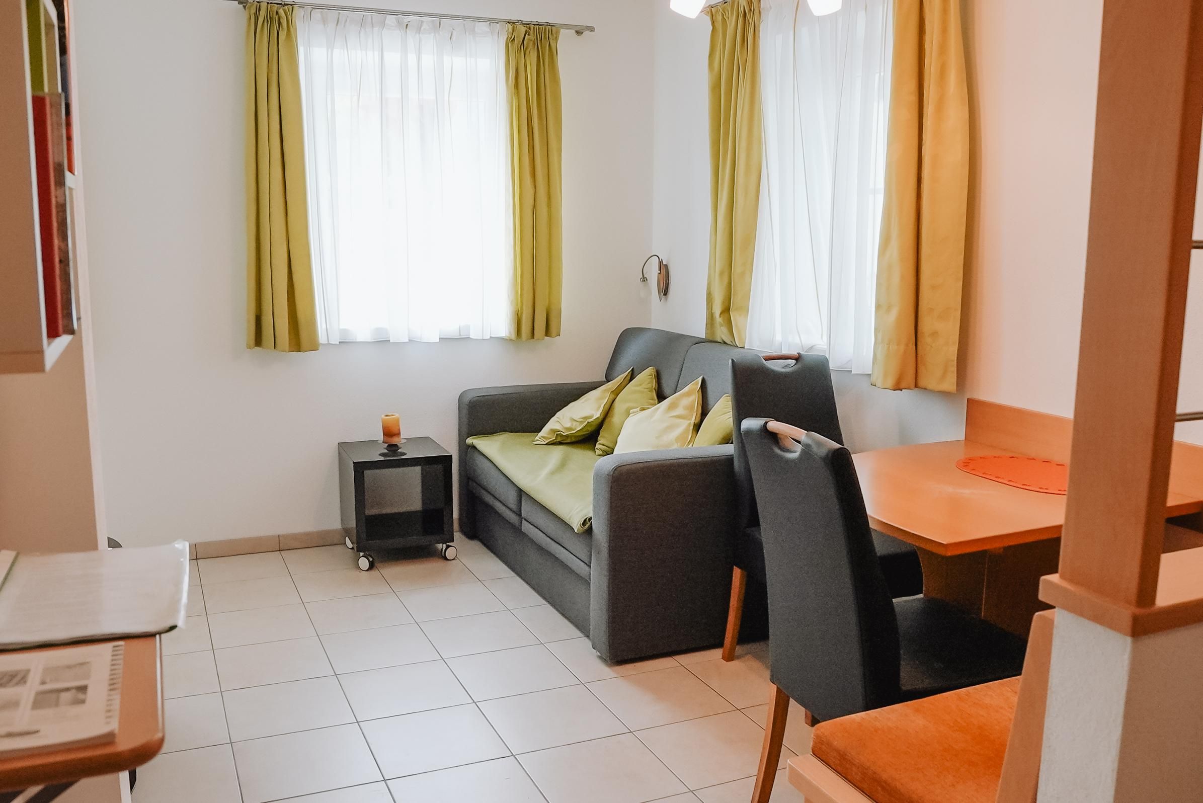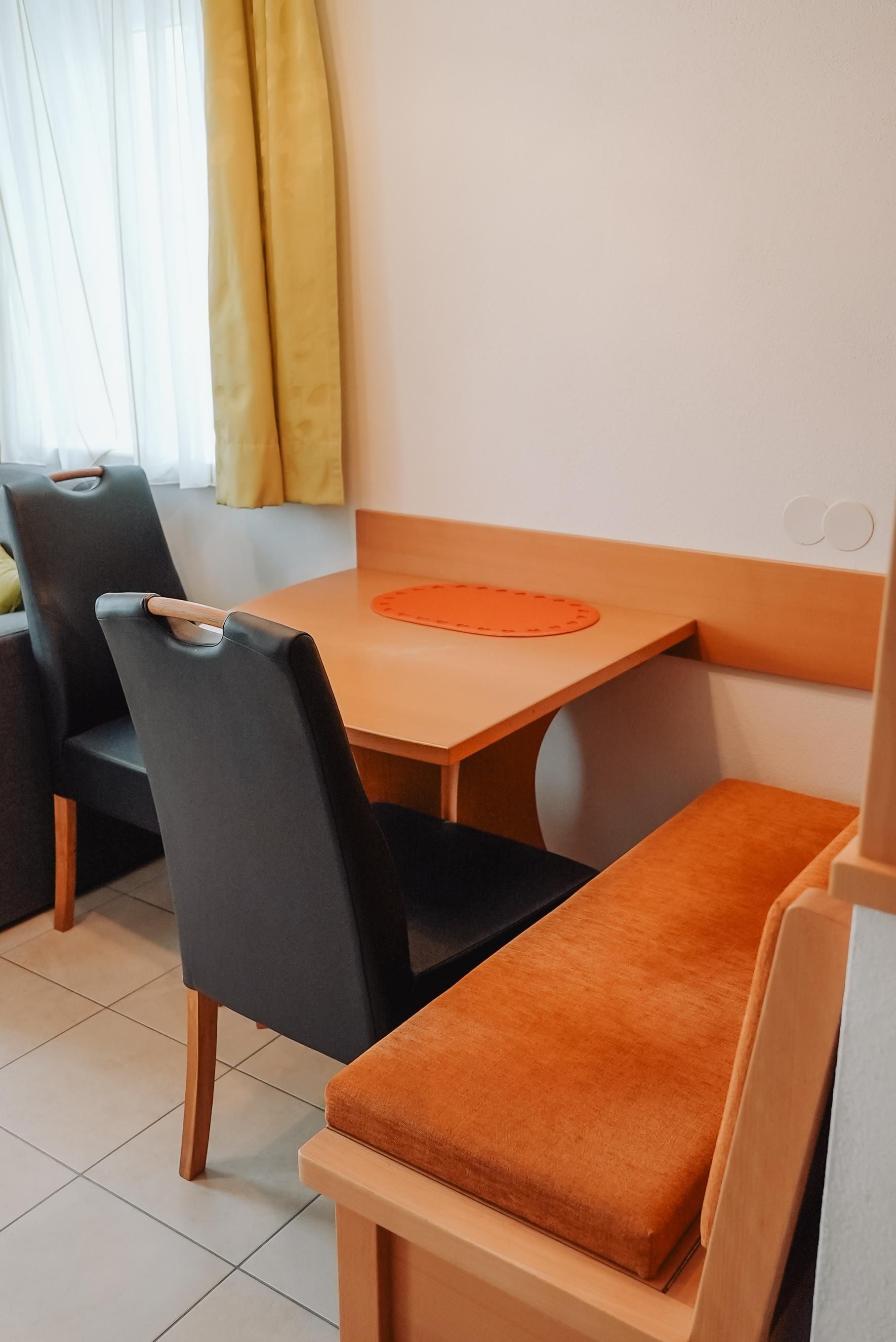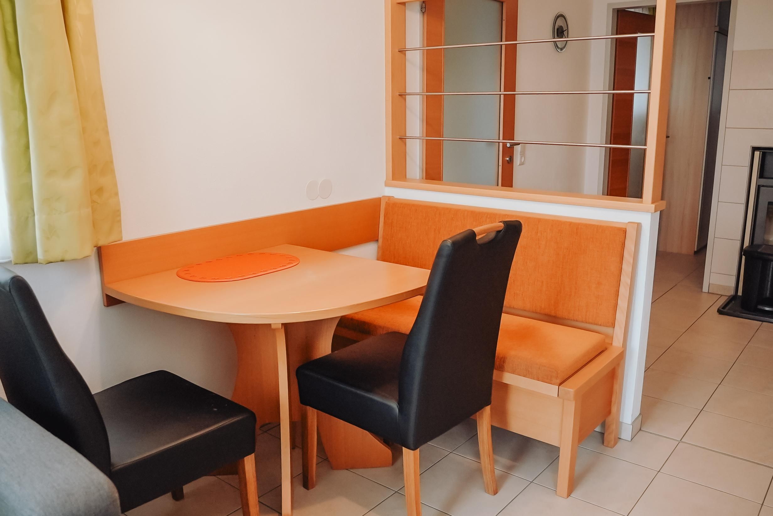 Das gemütliche Schwalbenwand Studio im Untergeschoss bietet 45 m² für 2 Personen. Es verfügt über einen Wohn-/Essbereich mit abgetrenntem Schlafbereich, eine voll ausgestattete Küche, ein modernes Bad, separates WC sowie eine sonnige Terrasse mit Gemeinschaftsgarten und Bergblick.
