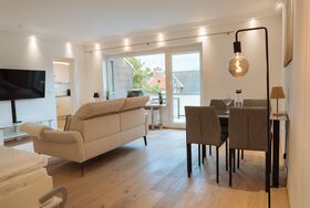 Großzügiges Studio mit komfortablem Doppelbett (optional: Schlafcouch oder Beistellbett). Voll ausgestattete Küche: Geschirrspüler, Backofen, Toaster, Kaffeemaschine & Waschmaschine. 50 Zoll Flachbild-TV und Highspeed-WLAN mit bis zu 1.000 Mbit/s – ideal fürs Arbeiten oder Streaming.