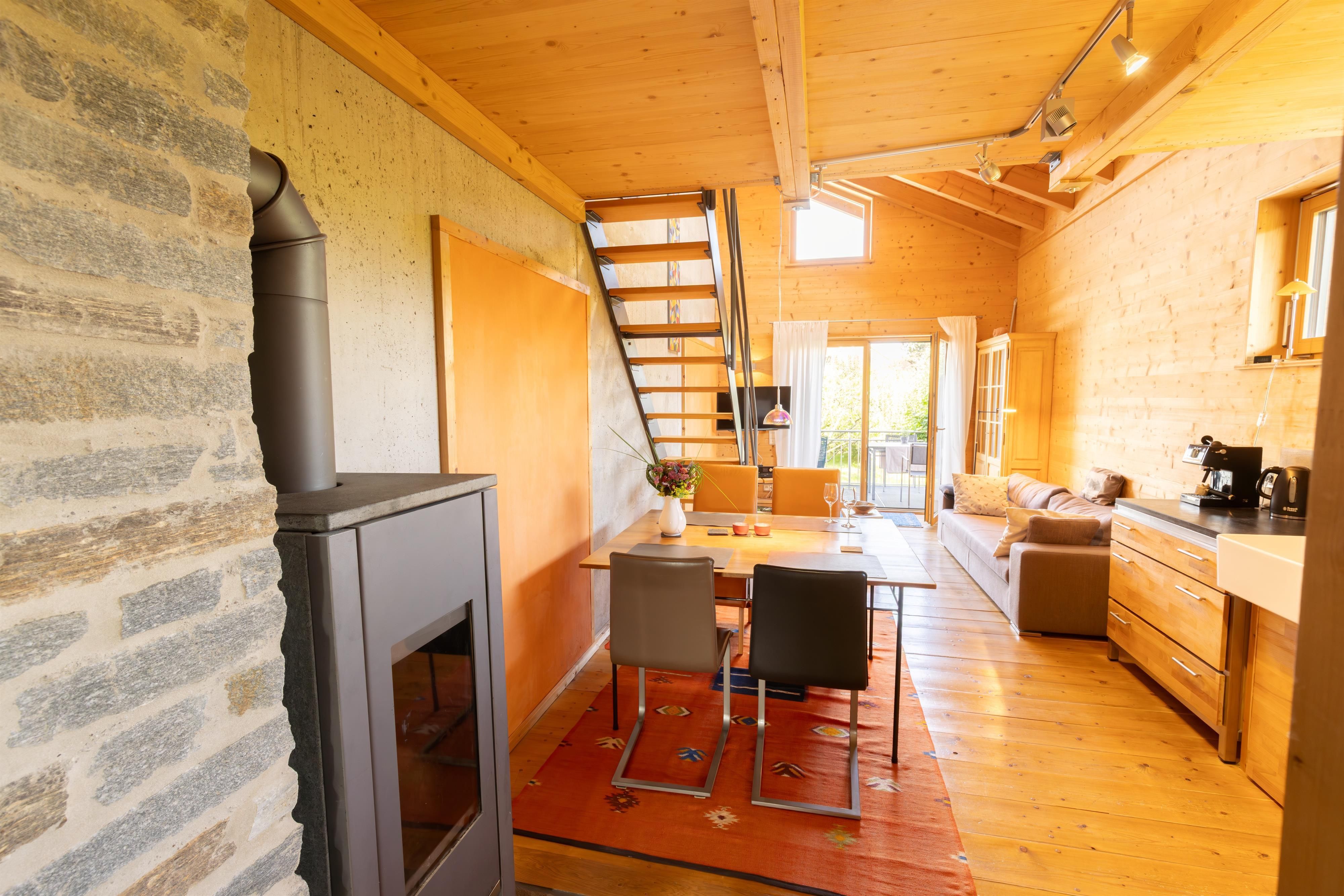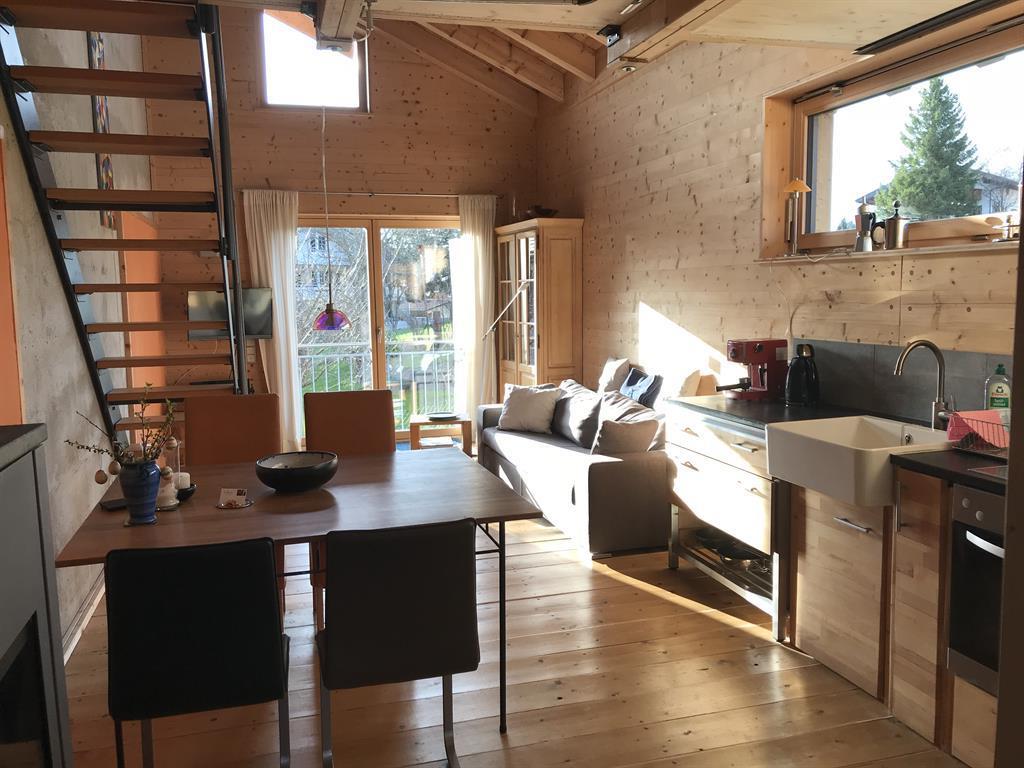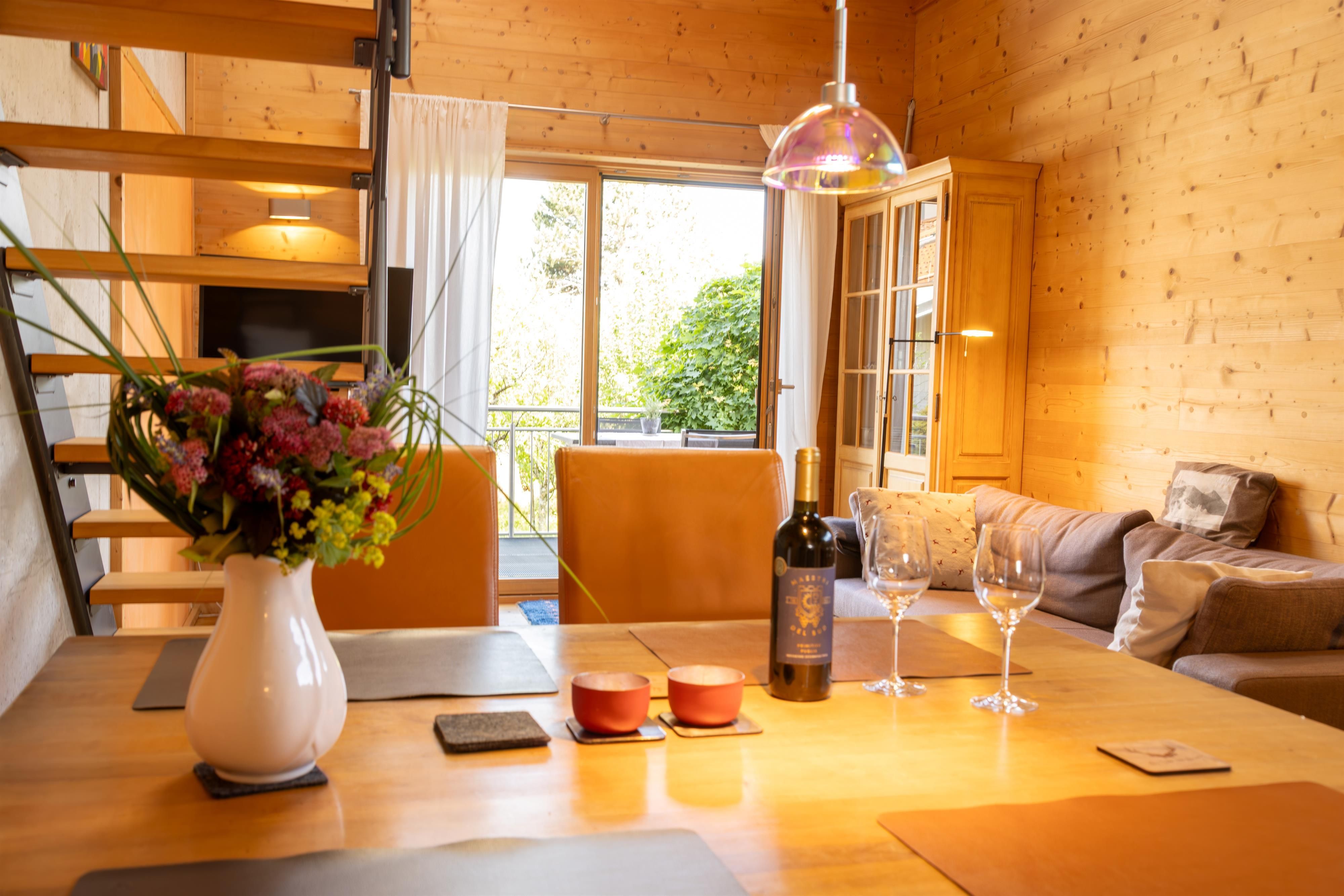 Sehr gemütliche, nach höchsten Ansprüchen an Baubiologie und Design gestaltete Loftwohnung im Alpenchaletstil mit Holz als dominierendem Baustoff. Getrennter Schlafbereich mit zwei Doppelbetten im Obergeschoss des Lofts, kleiner Balkon und Terrasse mit Bergblick. Mehr als 50 qm Wohnfläche über zwei Geschosse, ideal für 2 Erwachsene und 2 Kinder, fördern optimal die Urlaubsatmosphäre oder erleichtern das Abschalten nach dem anstrengenden beruflichen Alltag. Kühle Herbst- und Winterabende verbringen Sie am prasselnden Kaminfeuer. Dazu kommen die traumhafte Lage am Südhang und die gute Erreichbarkeit auch mit öffentlichen Verkehrsmitteln. Zu Fuß gelangt man in 10 Minuten in das Dorfzentrum mit vielen Einkaufsmöglichkeiten und Gastronomie. Die Langlaufloipe, Fahrrad- und Wanderwege beginnen am Haus. Wir sind auch auf internationale Gäste ausgerichtet und sprechen neben deutsch auch englisch, italienisch und spanisch.