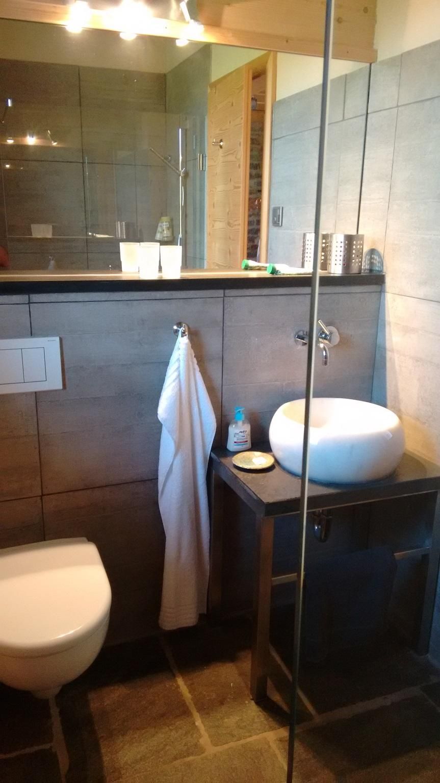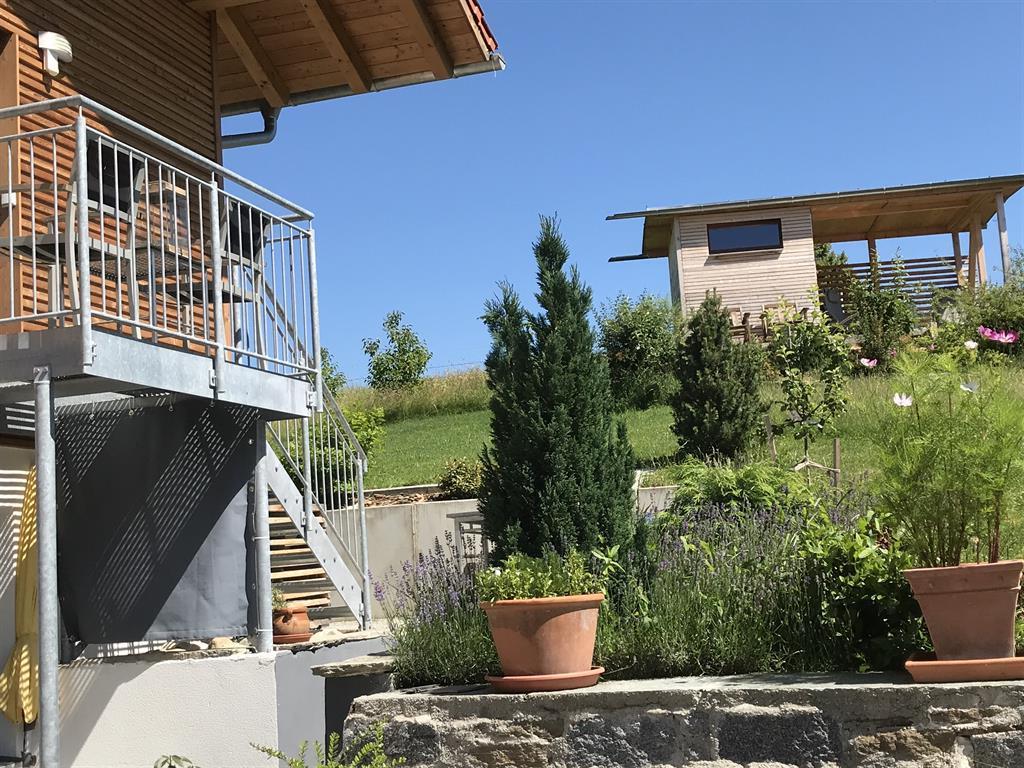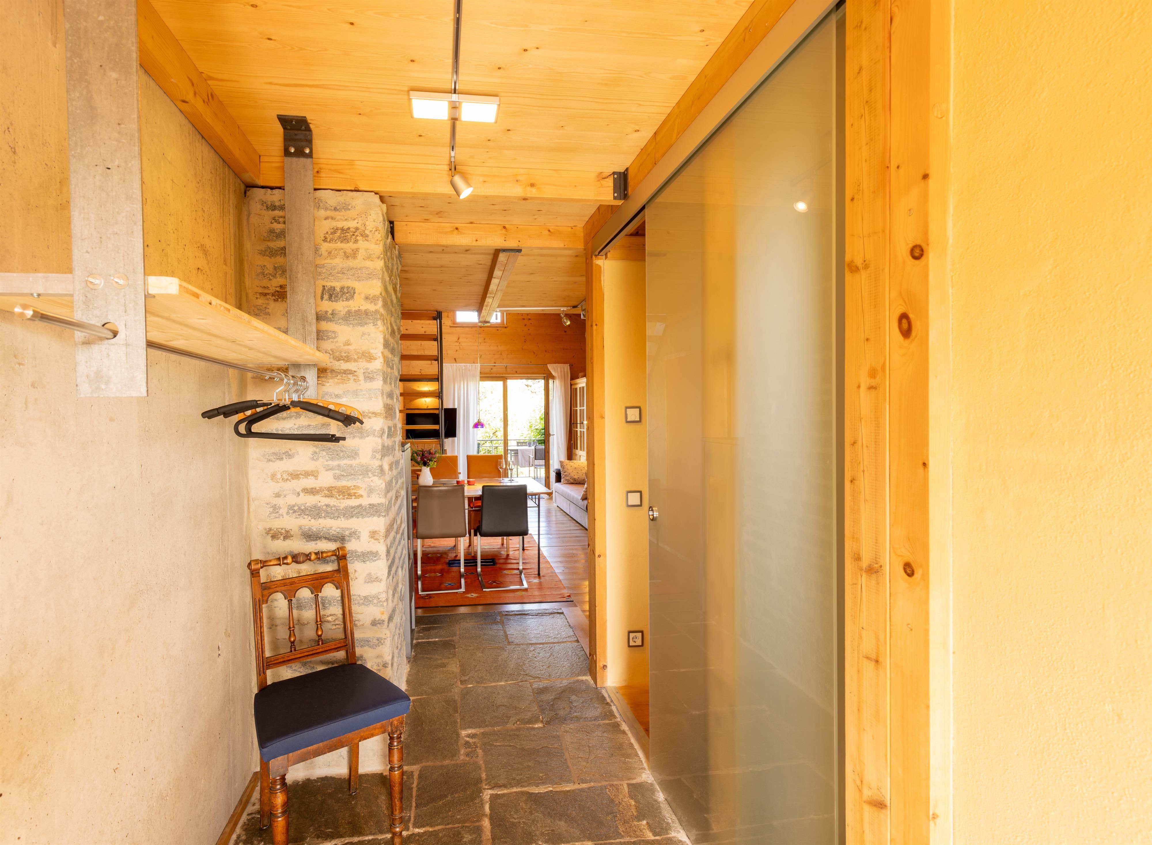 Die Steinfußböden sind aus Quarzit und bis zu 7cm stark. Die Holzfußböden der Ferienwohnung bestehen aus 42mm starken heimischen Fichtenhölzern, die ausschließlich mit Naturholzöl und - wachs behandelt wurden und werden. Baubiologische Grundsätze wurden so weitestgehend berücksichtigt. Dazu kommt ein hübscher Garten mit einem Sonnenpavillion mit Bergblick. Das Chalet bekam jetzt auch einen großen Balkon. Auf Anfrage auch Sauna.(Aufpreis).