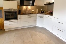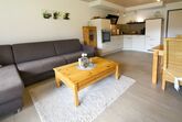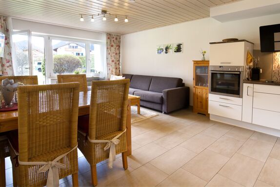 Großes Wohnzimmer mit offener Küche (Geschirrspüler, Mikrowelle etc.)