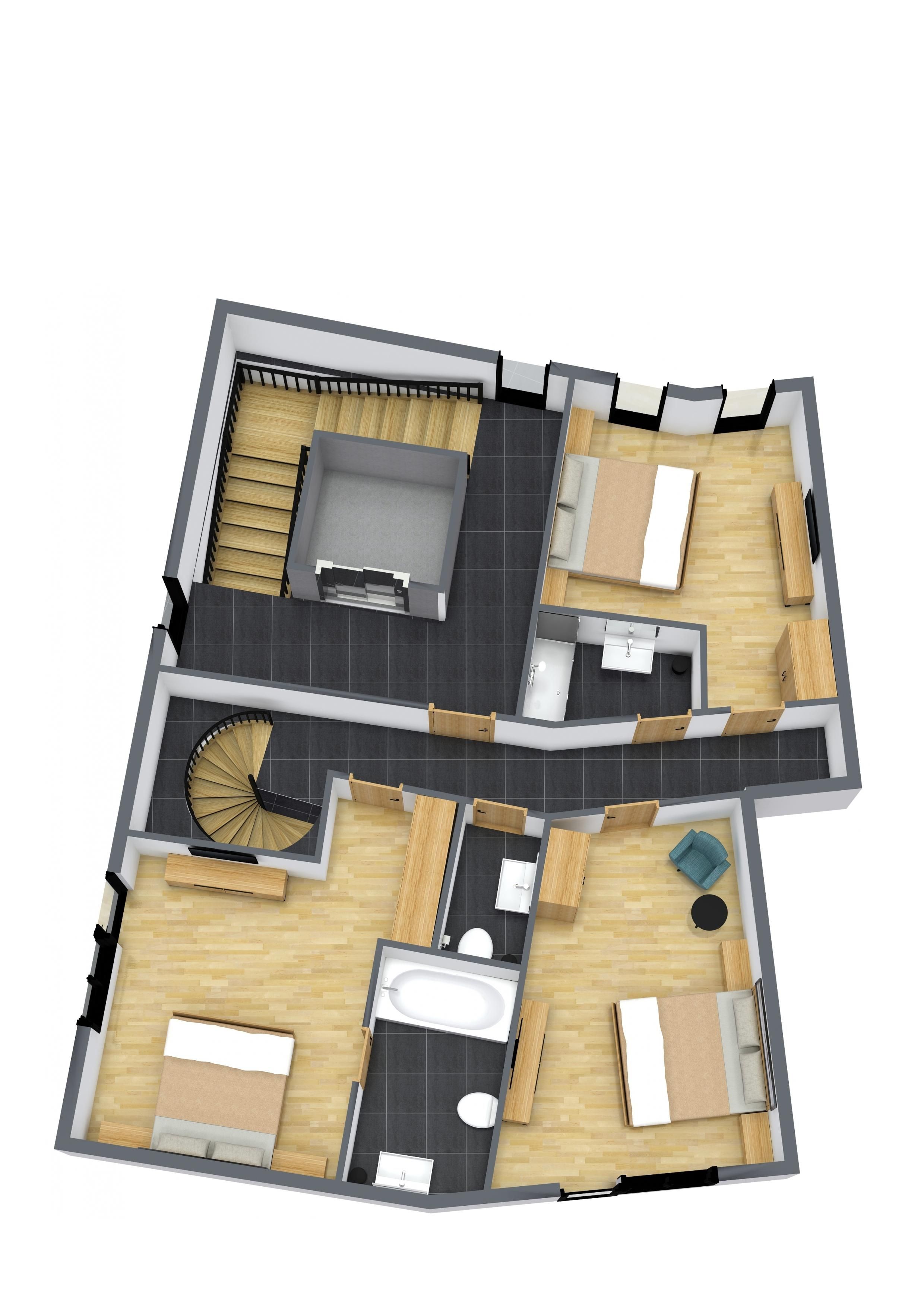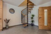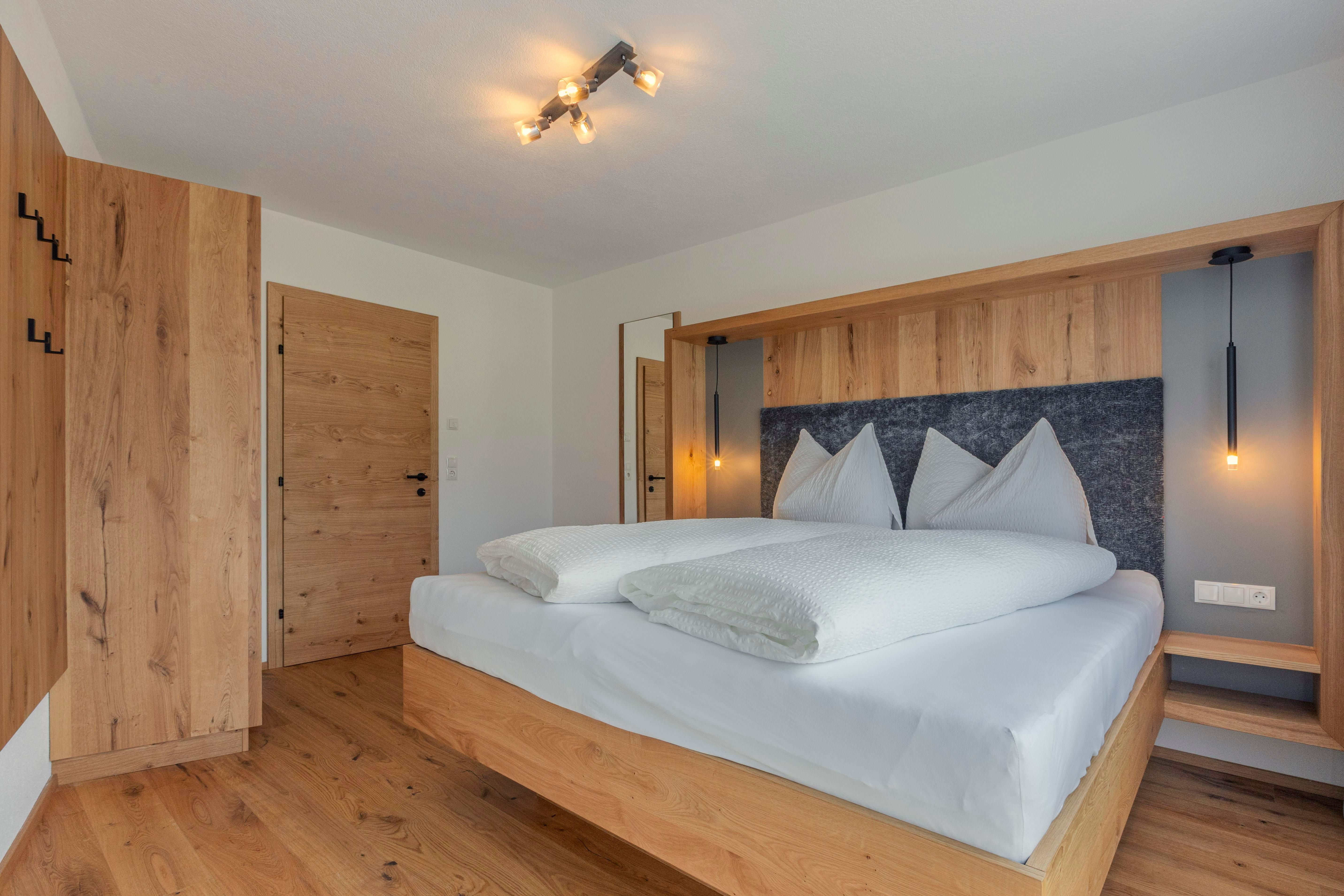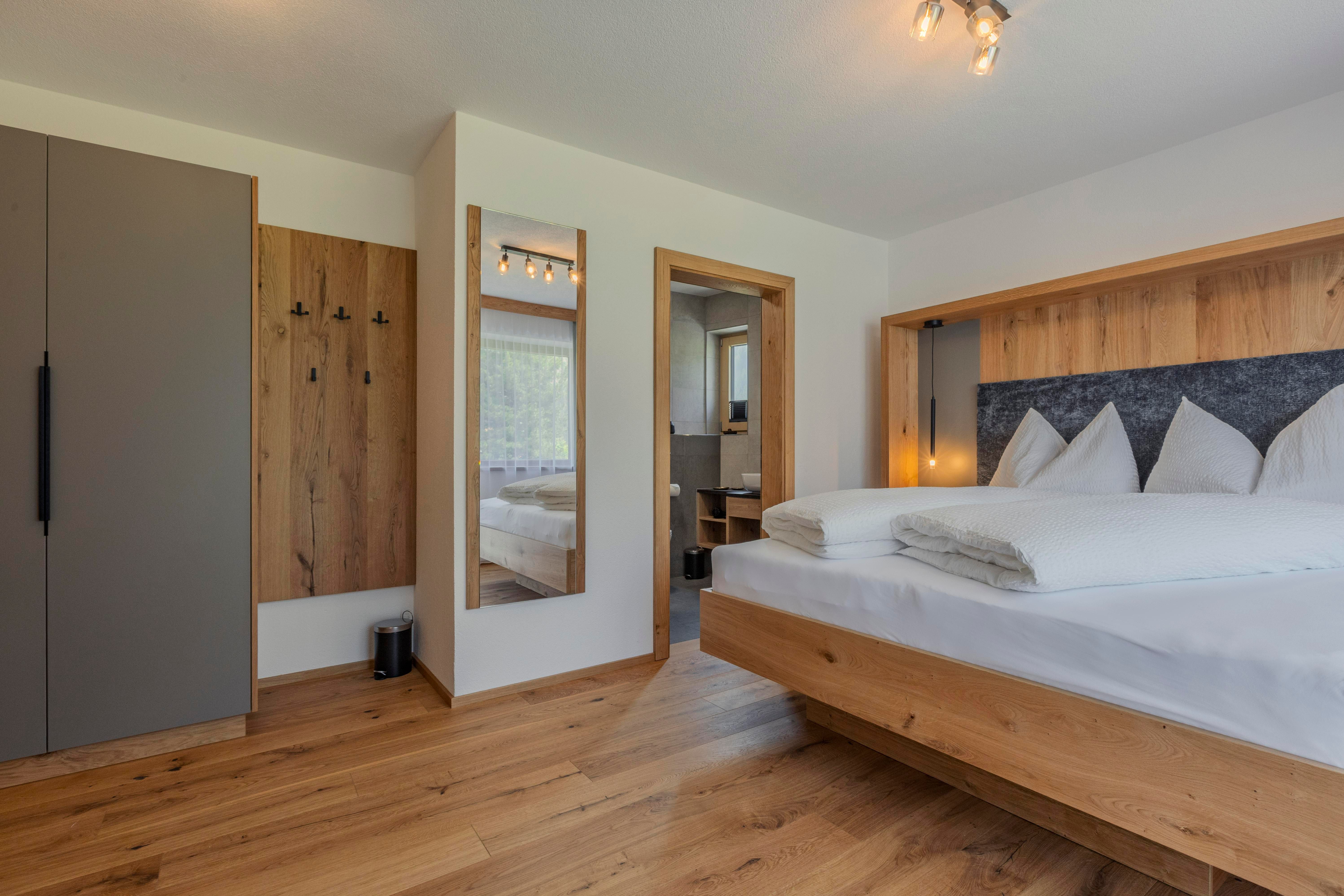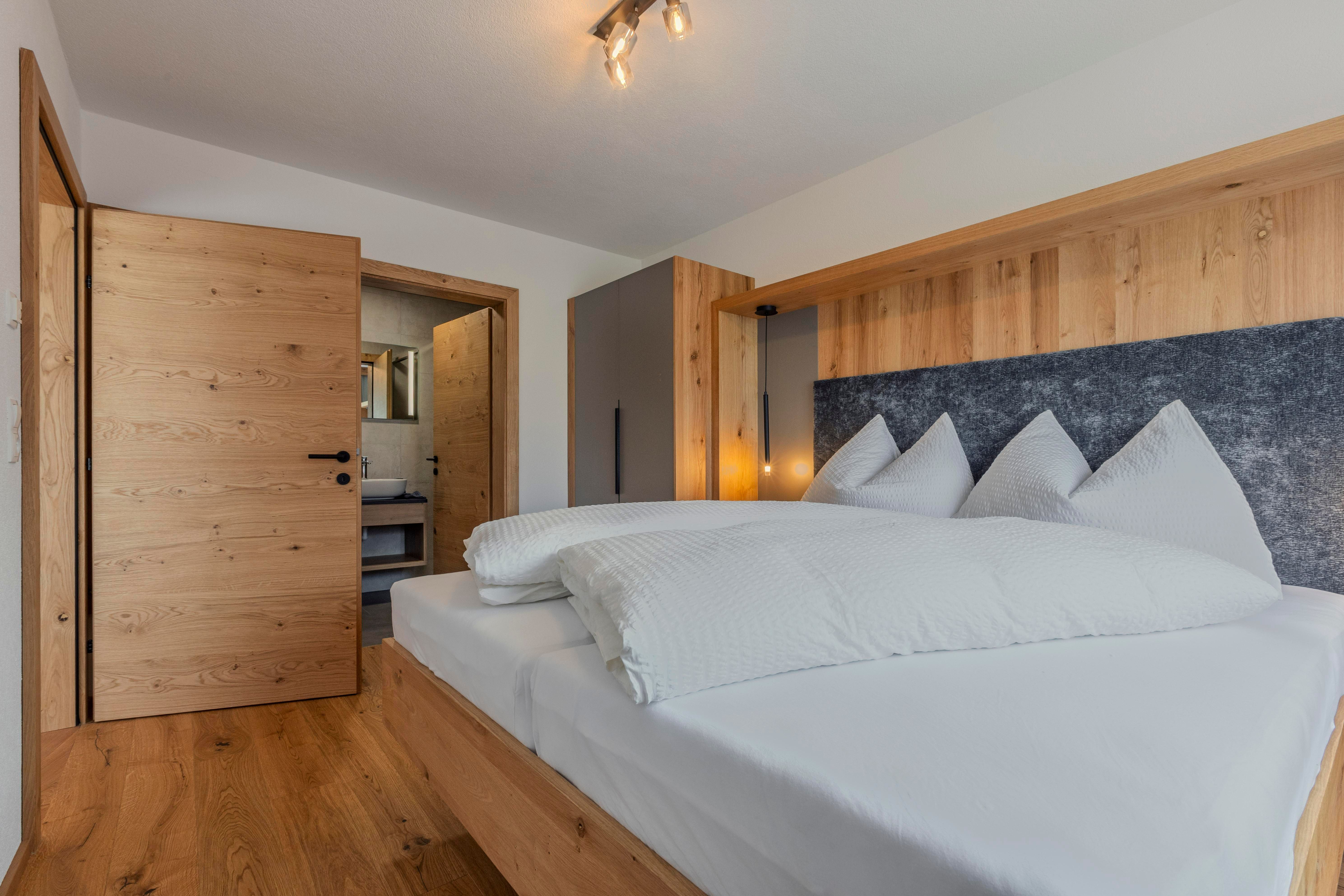 Das Obergeschoss ist über eine Wendeltreppe oder bequem über den Lift erreichbar und umfasst ein Doppelzimmer mit eigenem Bad inklusive Badewanne und WC sowie zwei weitere Doppelzimmer mit einem gemeinsamen Bad mit Dusche und separatem WC. Zwei der Zimmer bieten Zugang zum Balkon. Alle Schlafzimmer sind mit Holzboden und Fernsehern ausgestattet.