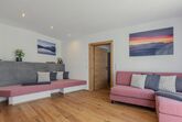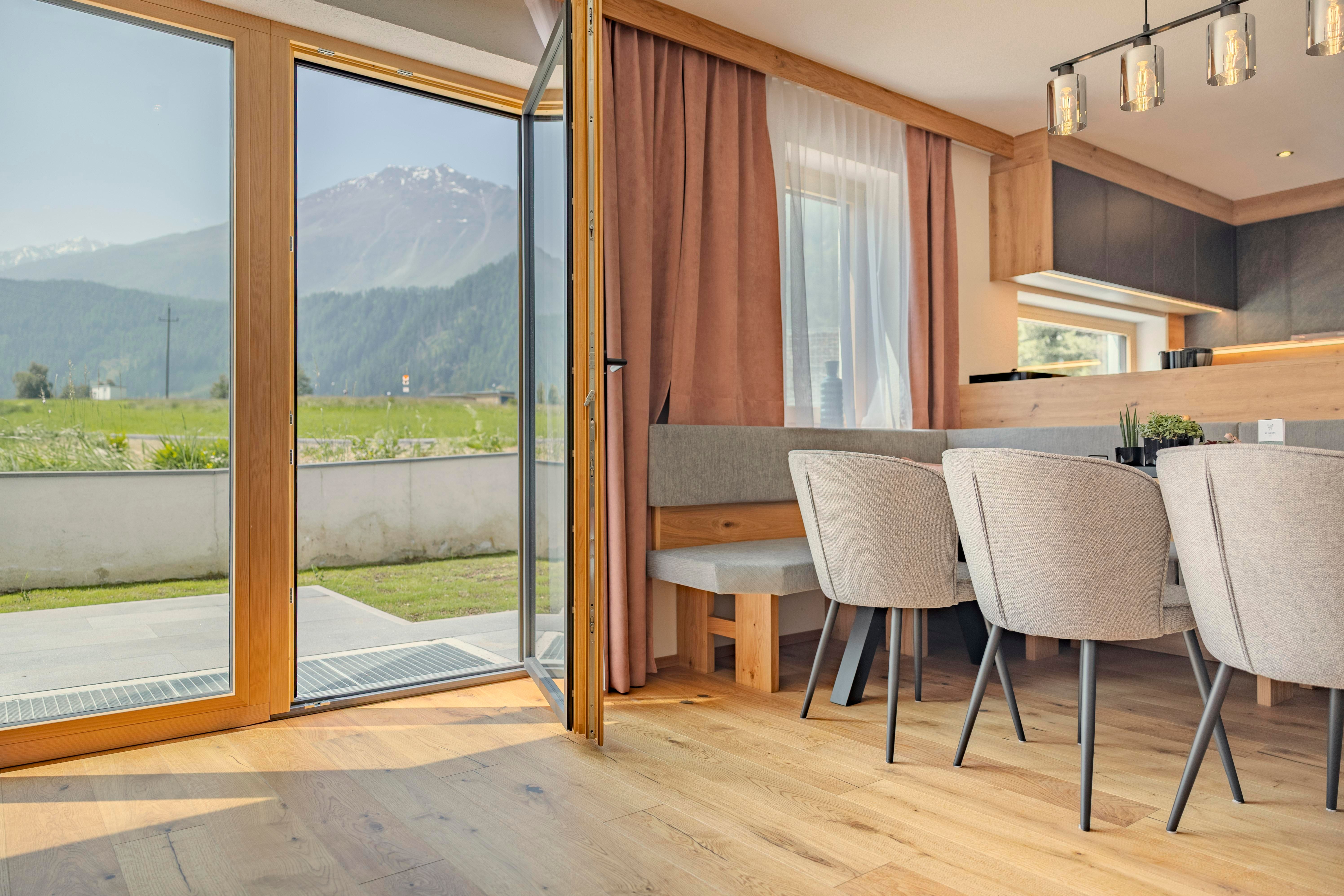 Das Chalet bietet auf 150 m² Wohnfläche und einem 80 m² großen, umzäunten Garten Komfort und Privatsphäre. Der großzügige Wohn- und Kochbereich im Parterre überzeugt mit moderner Ausstattung, einem Kachelofen, der elektrisch beheizbar ist und direktem Zugang zum Garten. Die voll ausgestattete Küche mit großem Esstisch schafft den idealen Rahmen für gesellige Abende. Angrenzend befindet sich ein Schlafzimmer mit Doppelbett sowie ein Bad mit Dusche und WC.