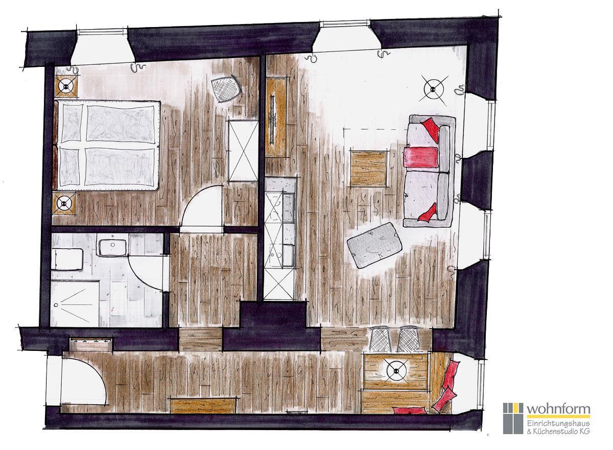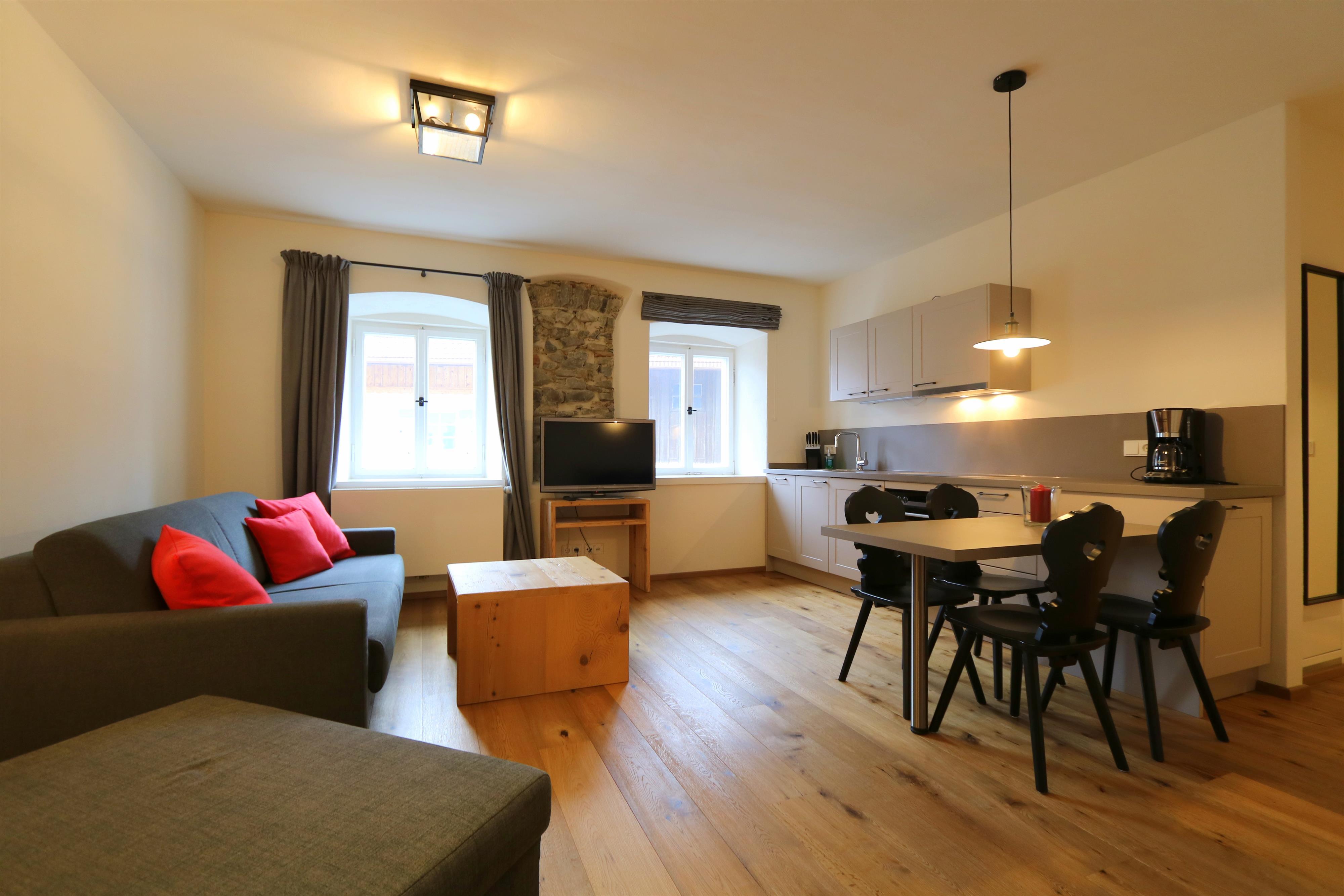 Diese Ferienwohnung für 2-4 Personen verfügt über ein zentral in der Wohnung gelegenen Wohnbereich mit integrierter Küche mit Essbereich und einem separaten Schlafzimmer. Sie verfügt über eine Küche mit Kühlschrank, Spülmaschine, Ceran-Herd, Wasserkocher, Toaster und Kaffeemaschine sowie ein Bad mit Dusche und WC.